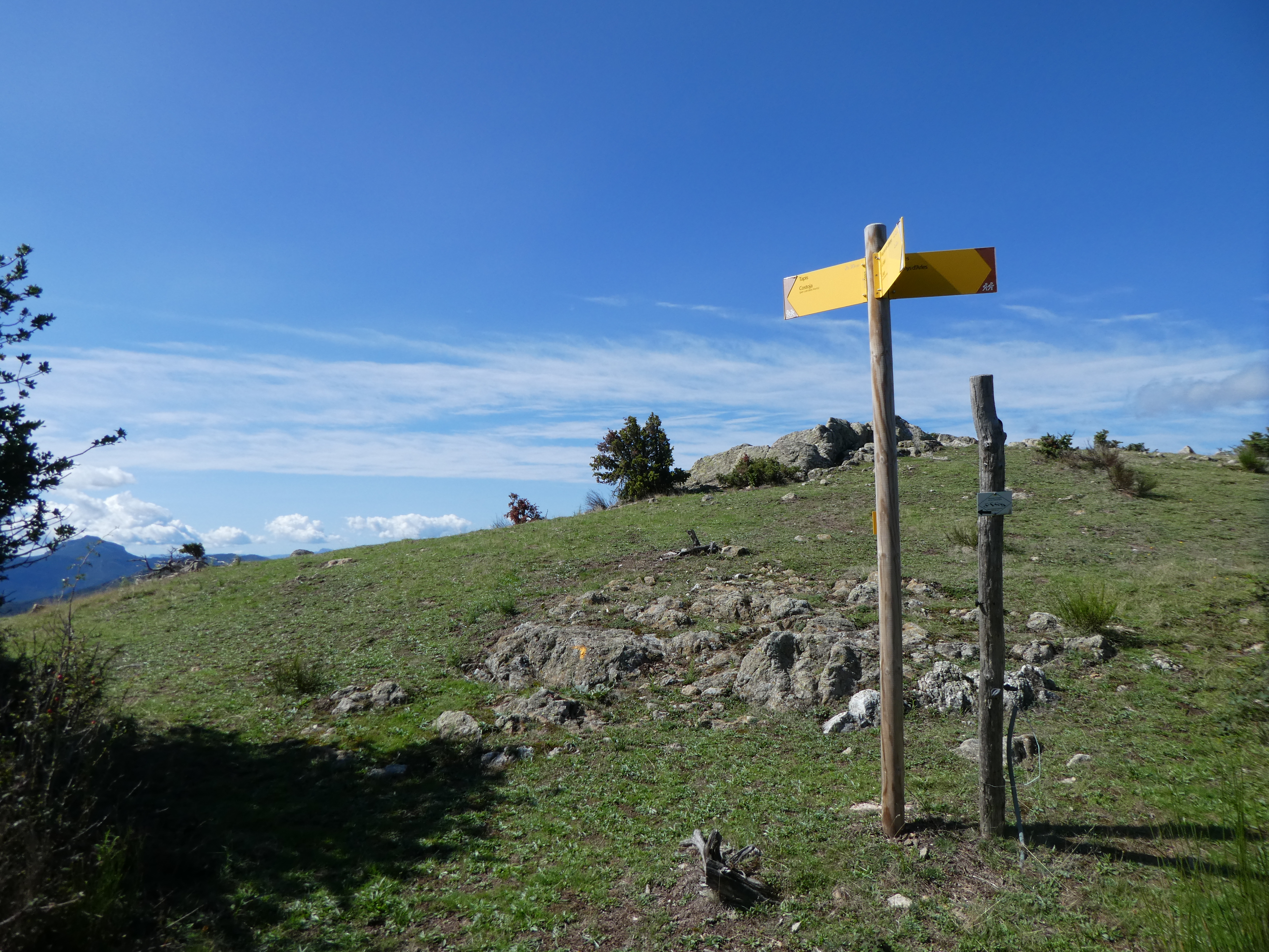 A ce croisement avec l'itinéraire de l'Olla de Tapis (350 mètres après le Coll de la Dona Morta), suivre le chemin partant sur la gauche direction Tapis, balisé sporadiquement en jaune et en balises "Olla de Tapis" dorénavant (frontière hispano-française : retour en Espagne)