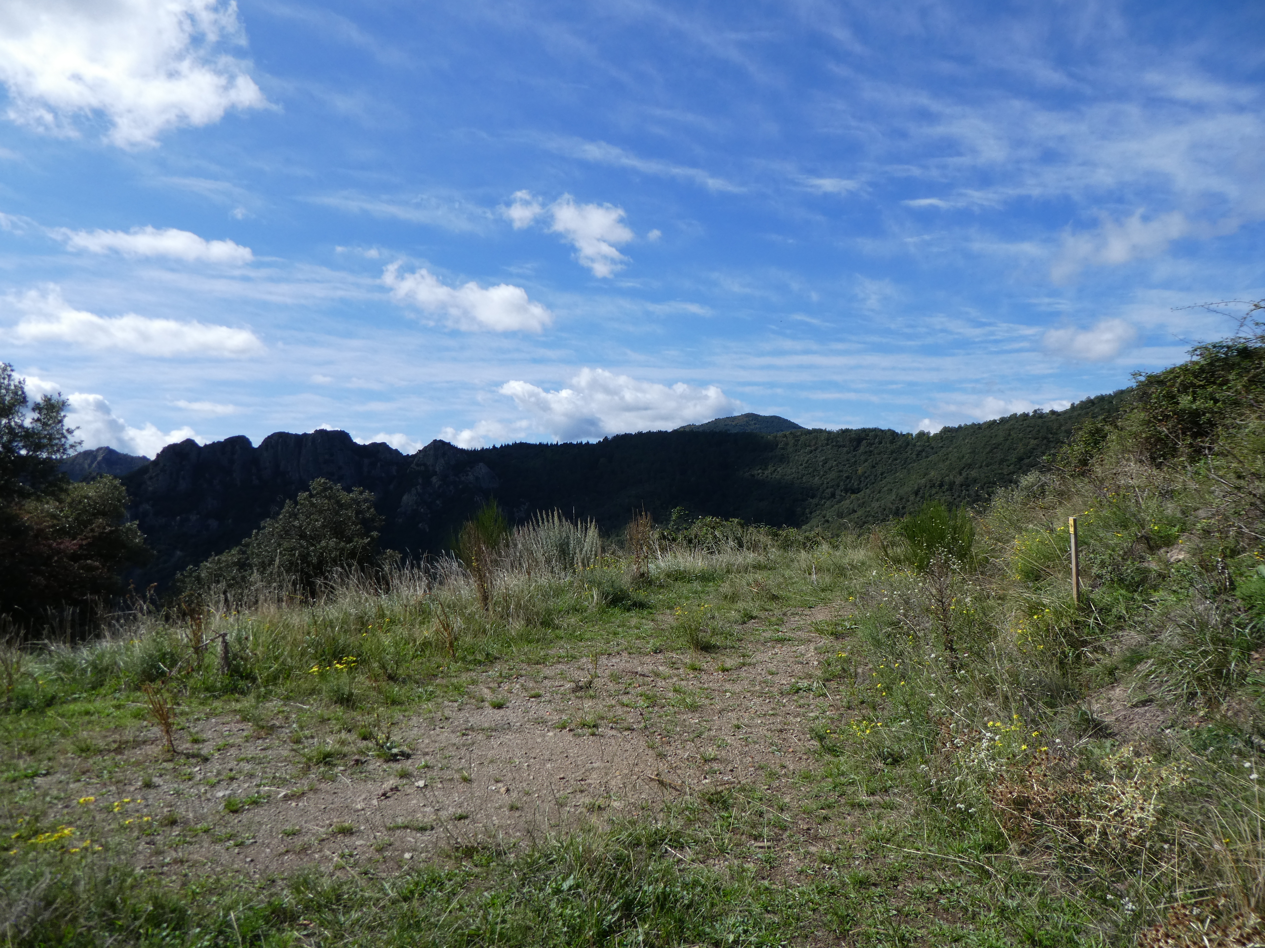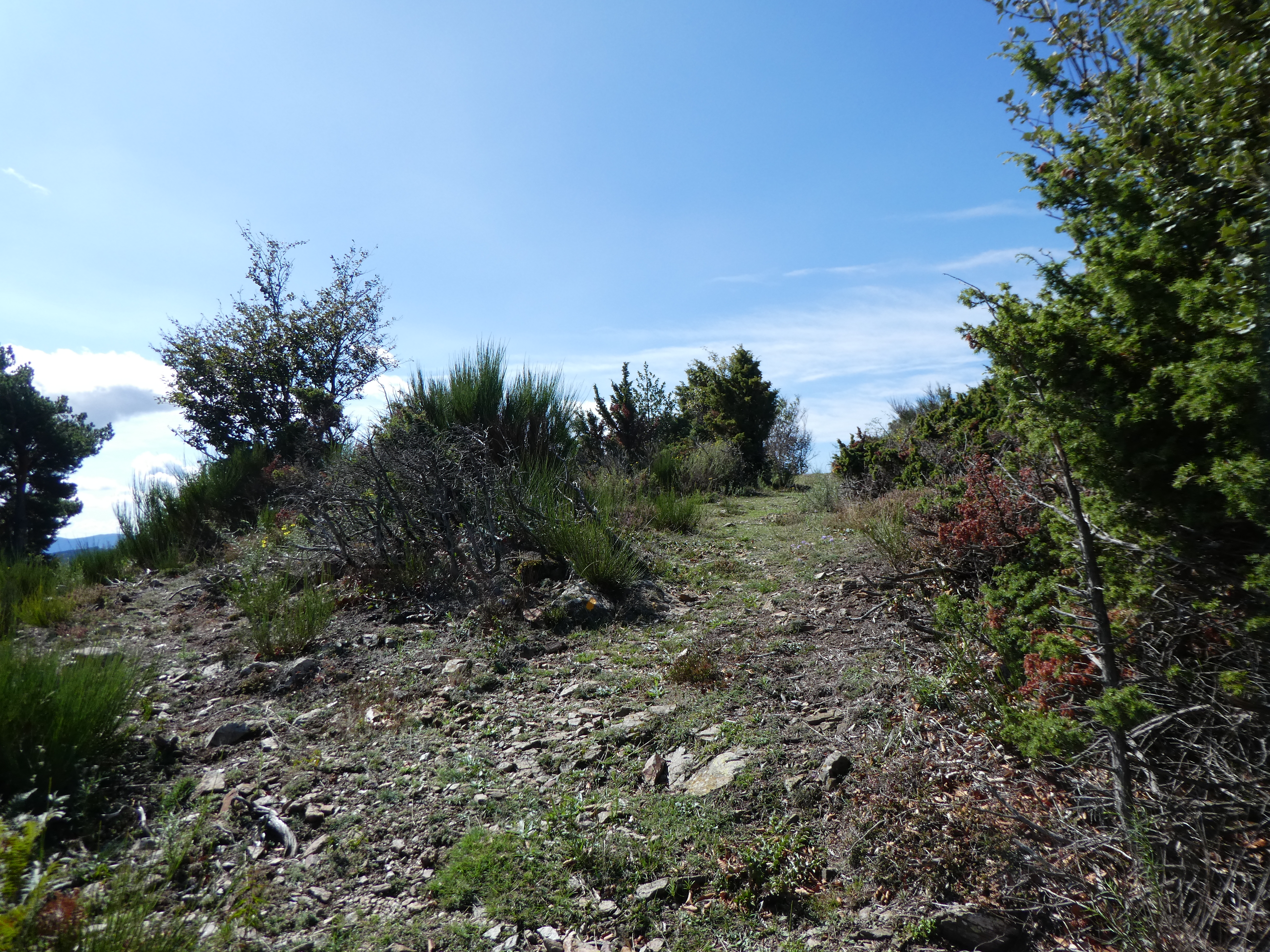 A ce croisement avec le chemin de crête du massif du Roc de Frausa (900 mètres après le précédent), suivre ce dernier sur la droite direction Coll de la Dona Morta, balisé uniquement et sporadiquement en jaune dorénavant (frontière hispano-française)