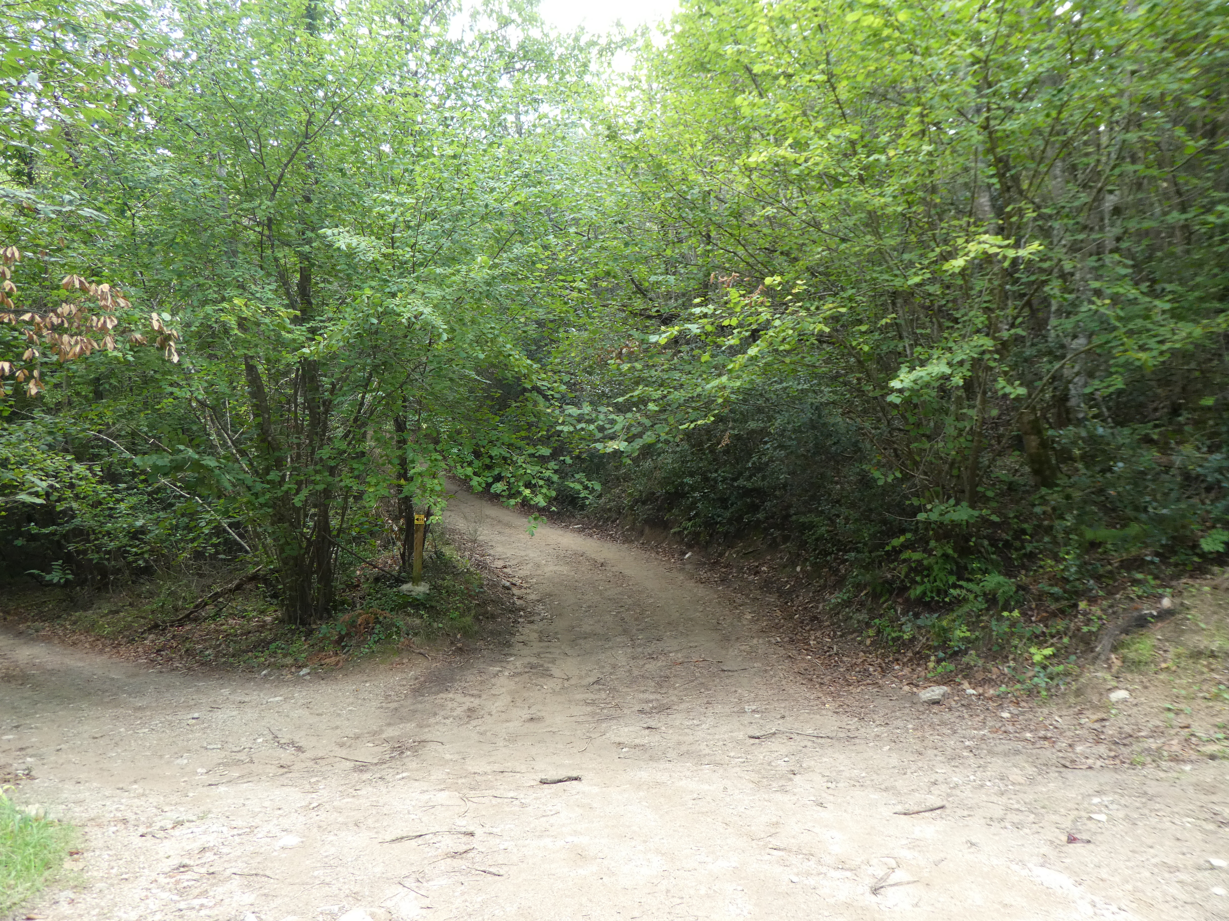 A ce croisement avec l'itinéraire de la Font Fresca (200 mètres après le précédent), suivre la piste partant tout droit direction Tapis, balisé sporadiquement en jaune et en balises "Olla de Tapis"