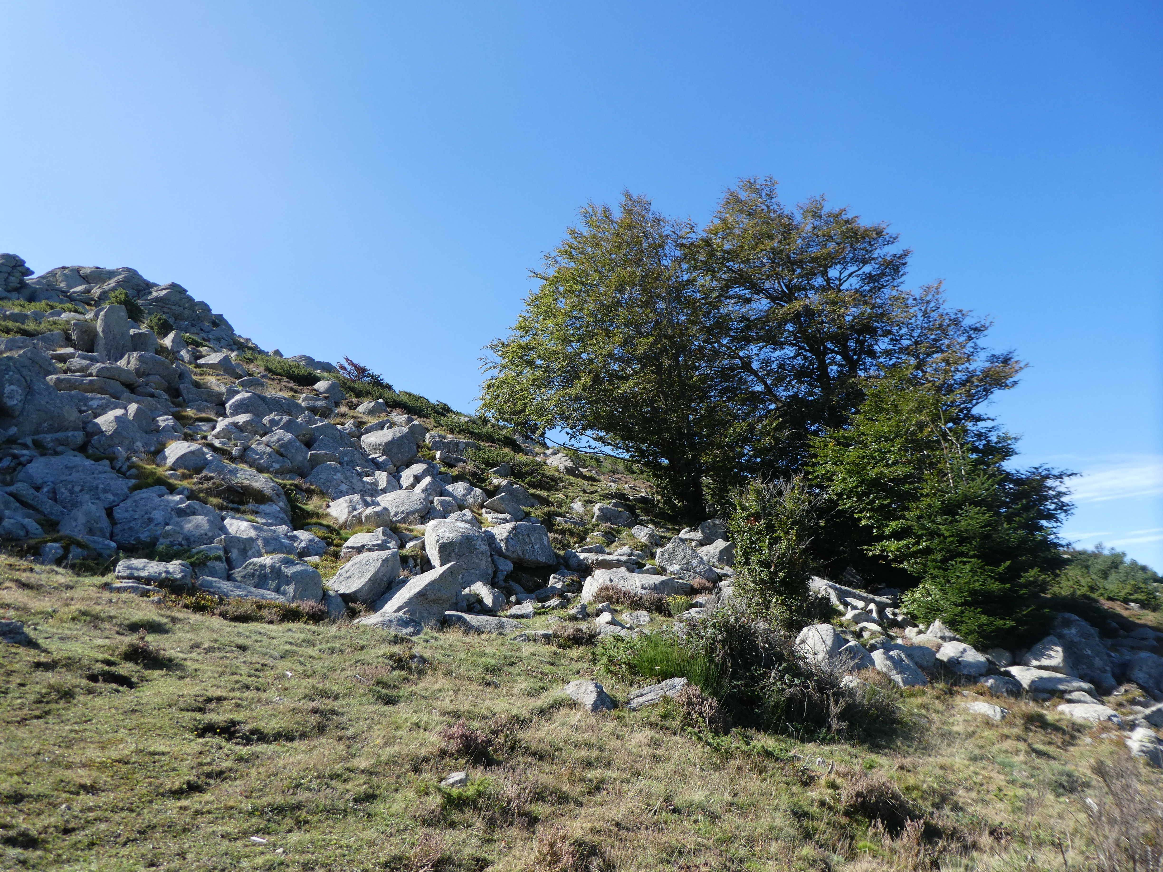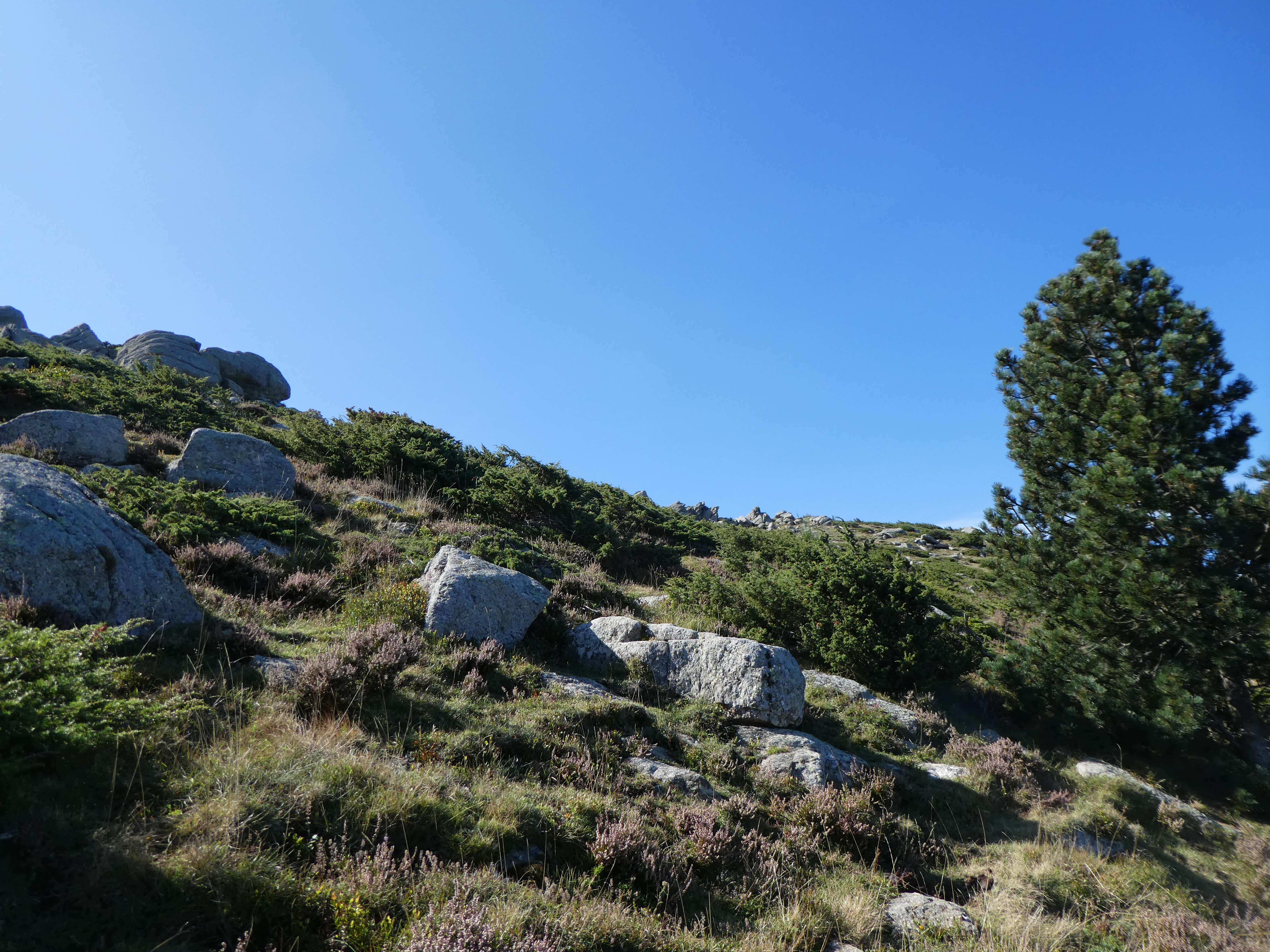 A ce croisement marqué par la présence de cet arbre et d'un gros bloc de granit à gauche (1100 mètres après le Coll de la Dona Morta), quitter le sentier frontalier partant tout droit pour monter à vue sur la droite vers le Roc de la Sentinella direction Roc de la Sentinella (ceux qui voudraient aller direction au Roc de la Campana, continuer à suivre le chemin frontalier)