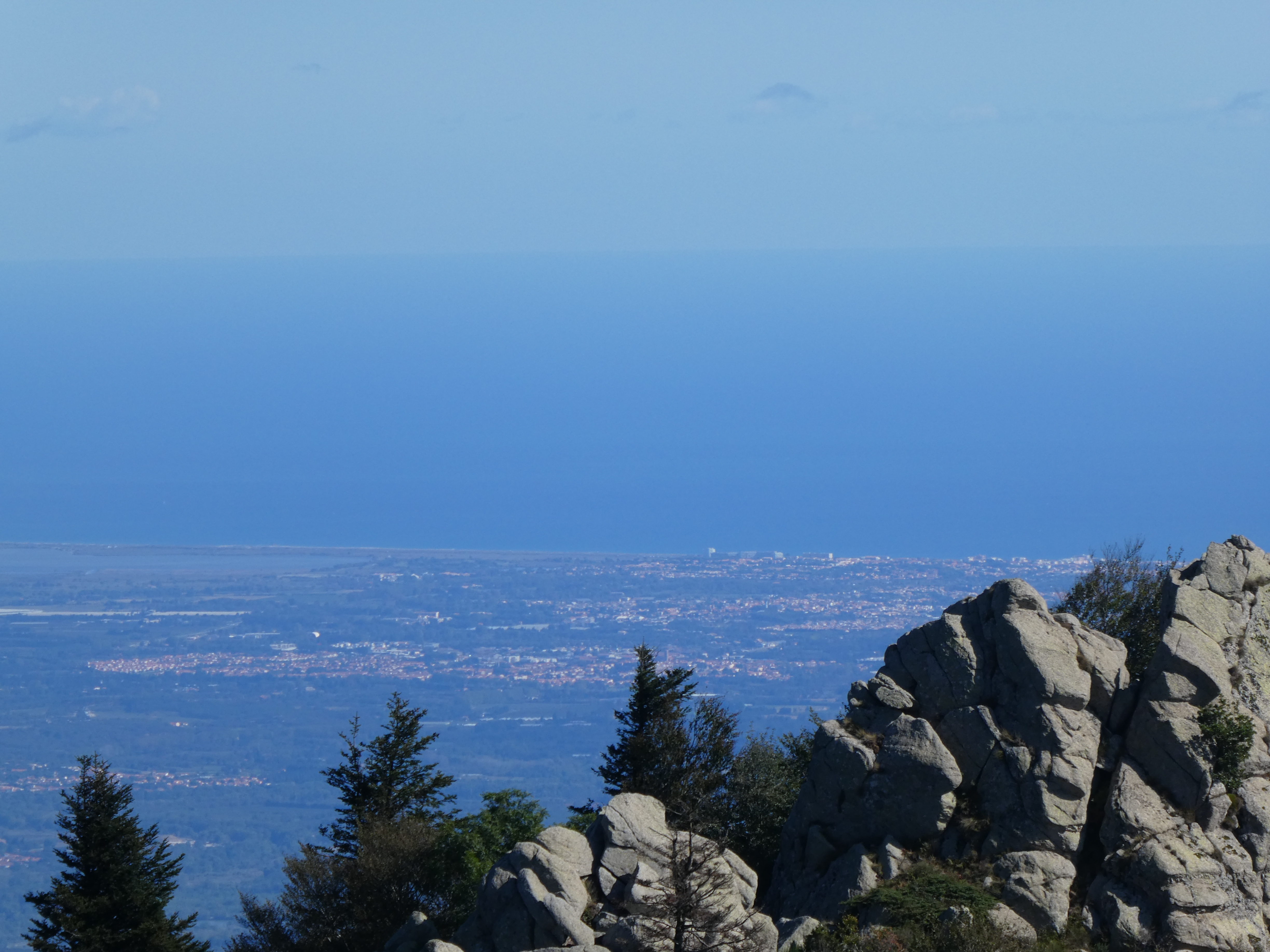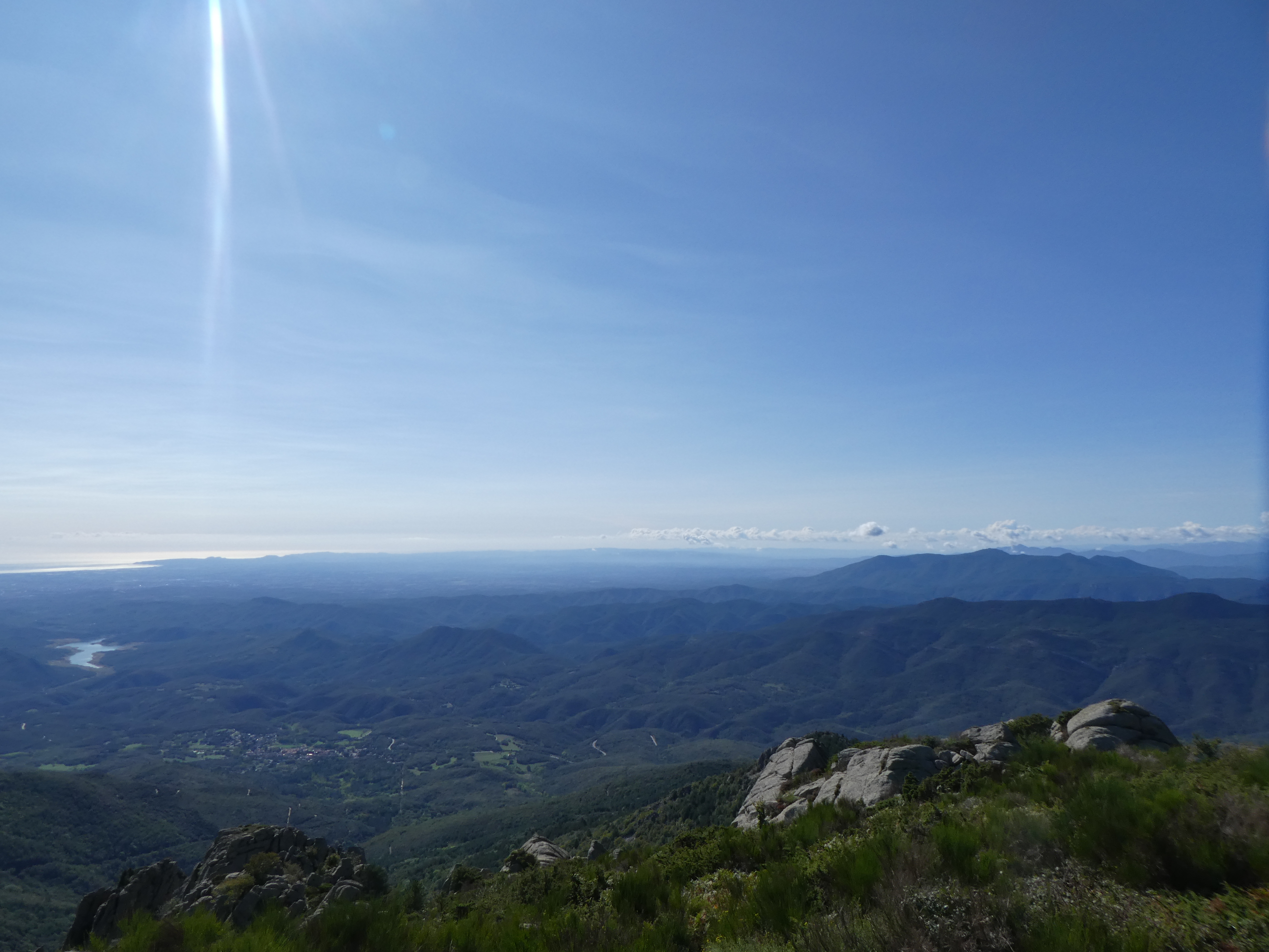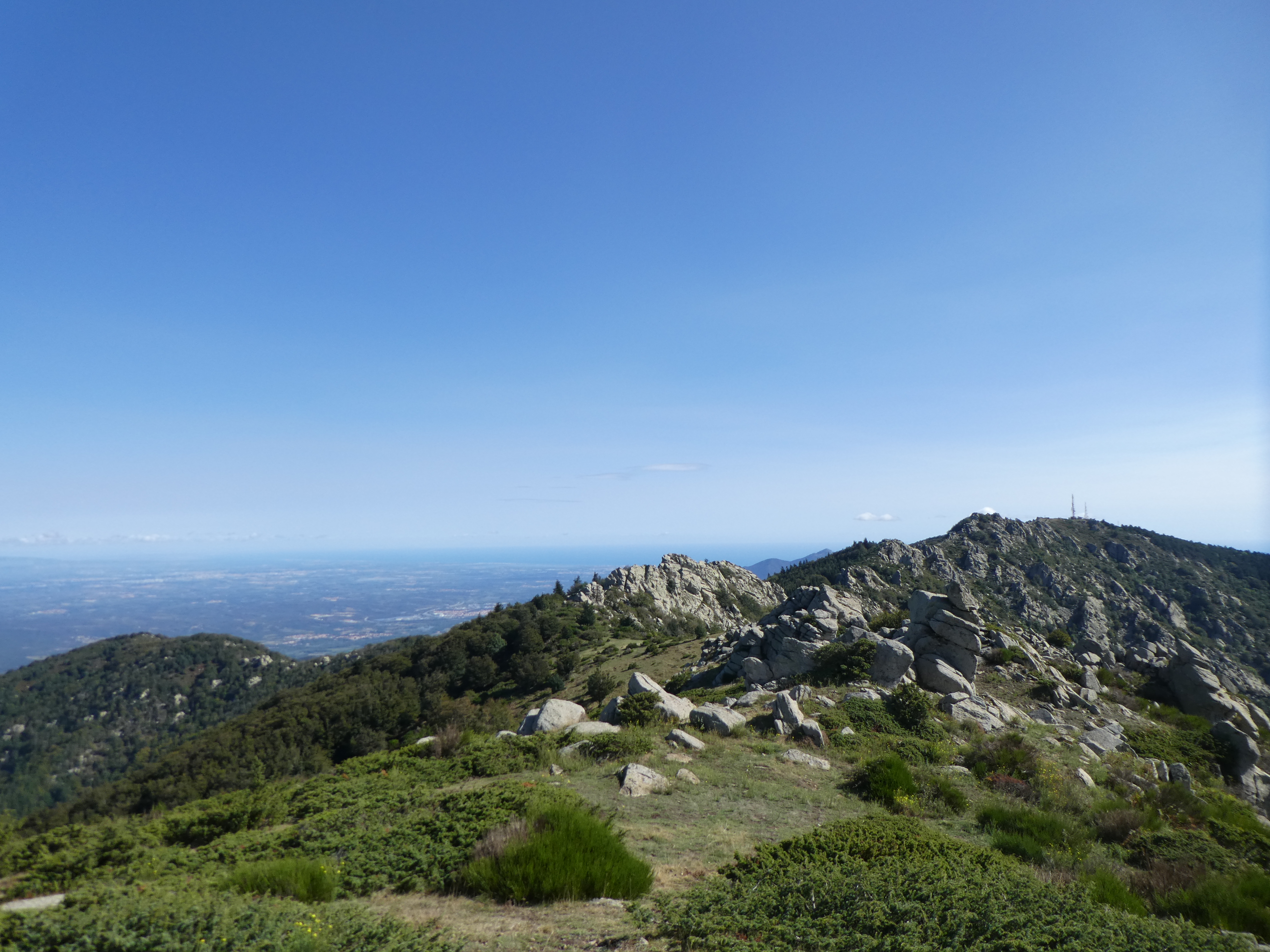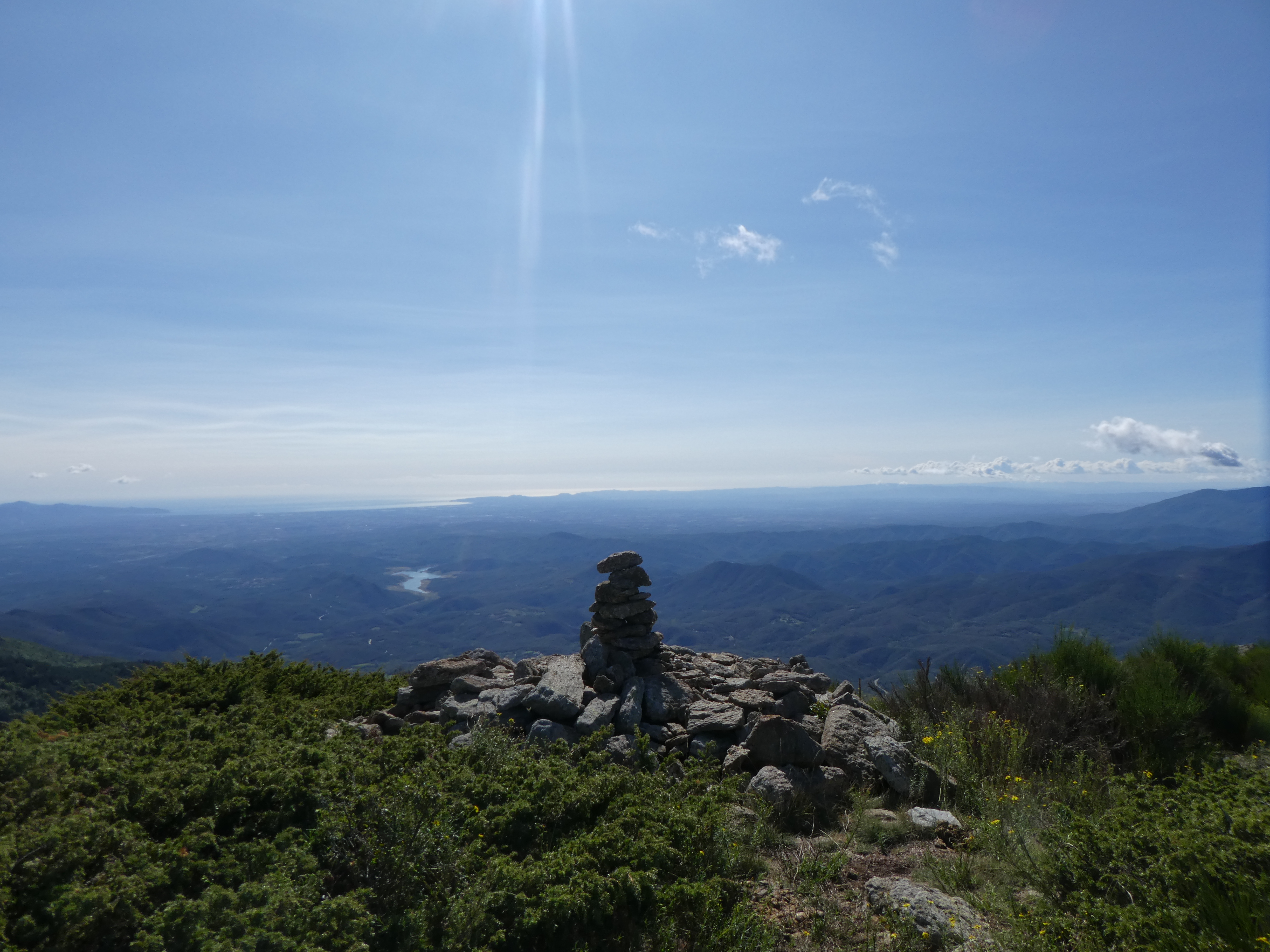 Arrivée au sommet du Roc de la Sentinella (1401 m) : beau panorama sur les sommets du Conflent, du Vallespir, des Corbières, de l'Empordà, de la Garrotxa, de la Selva, de l'Osona, du Ripollès ainsi que sur la Plaine du Roussillon et de l'Empordà