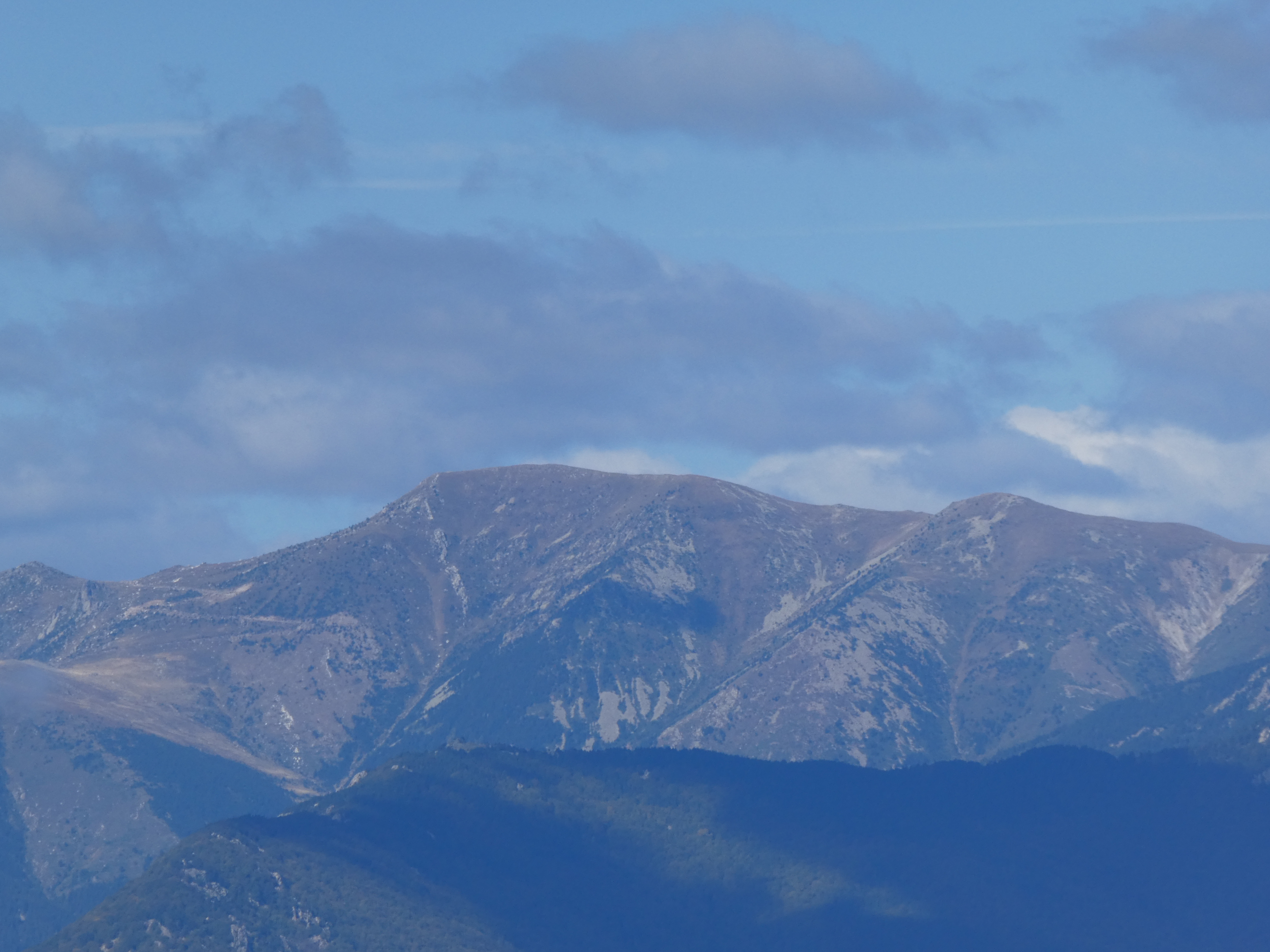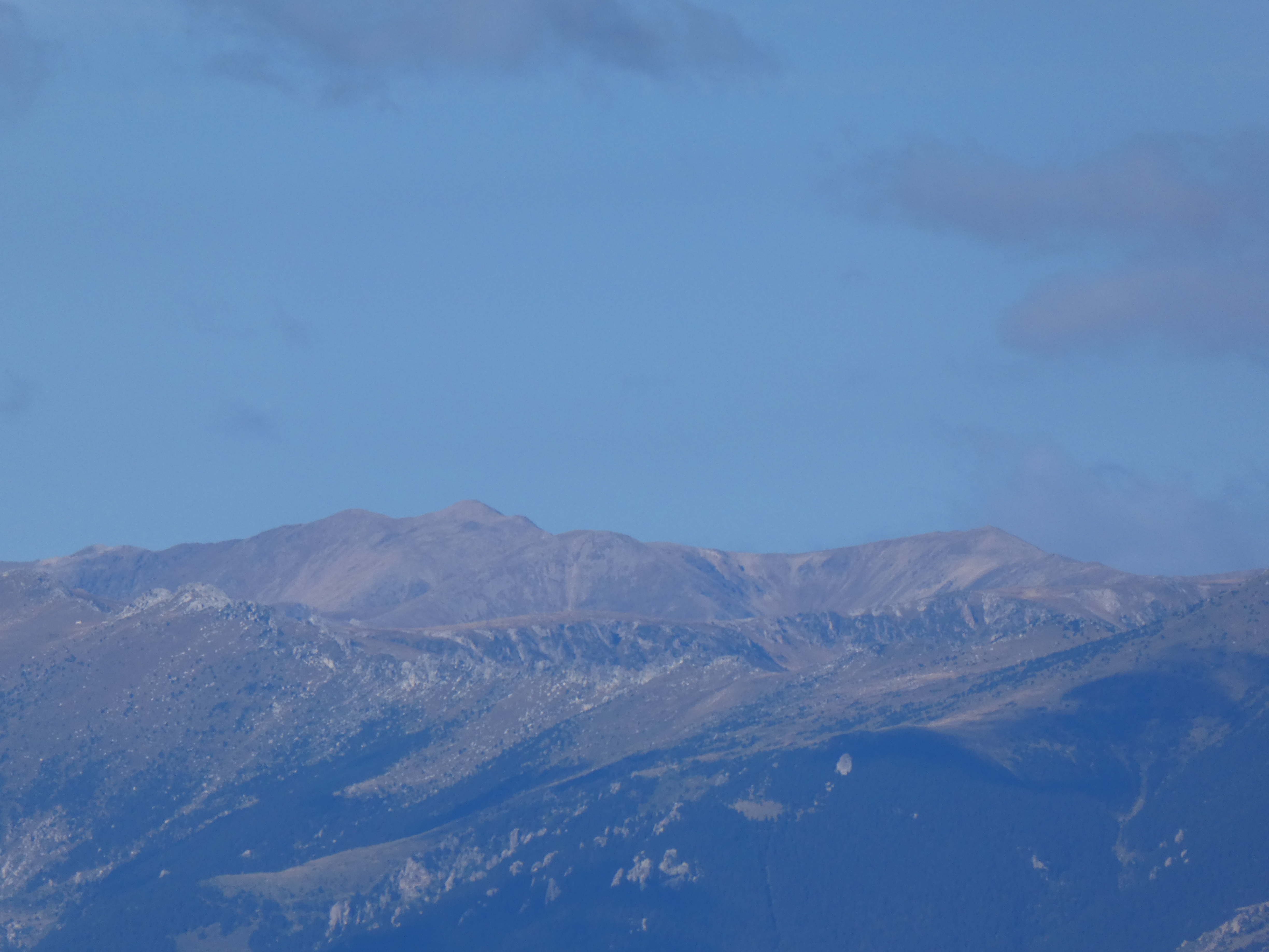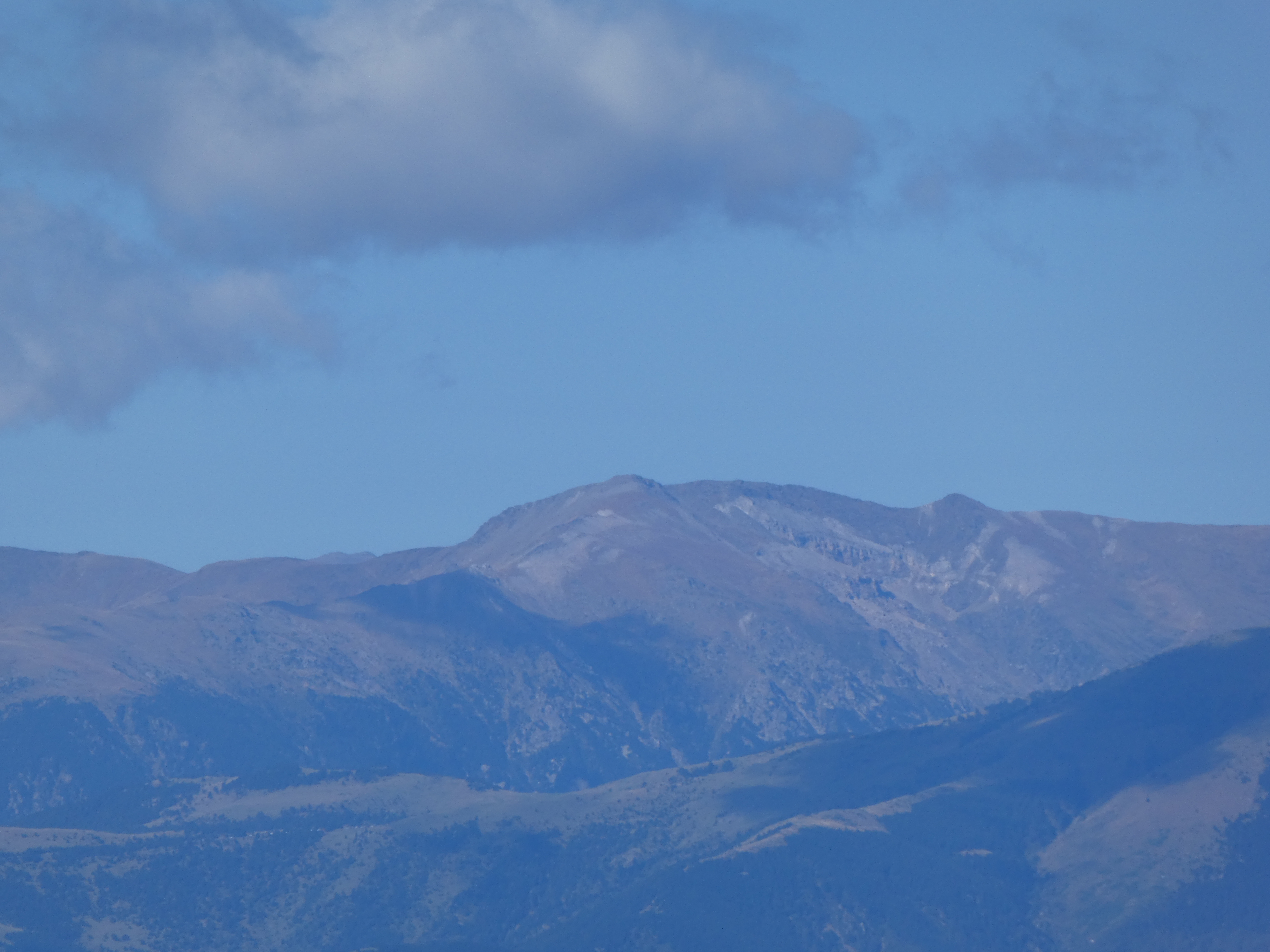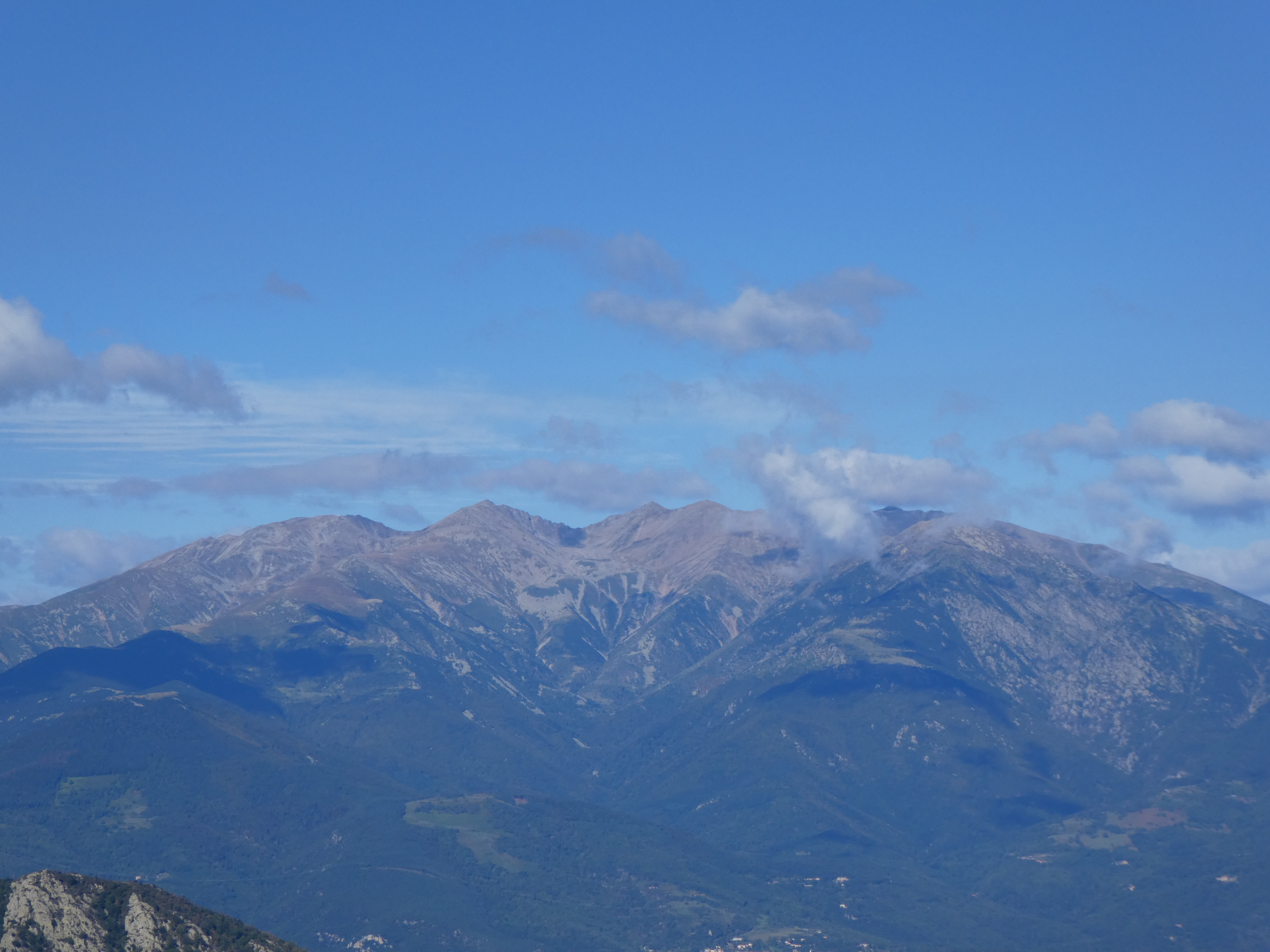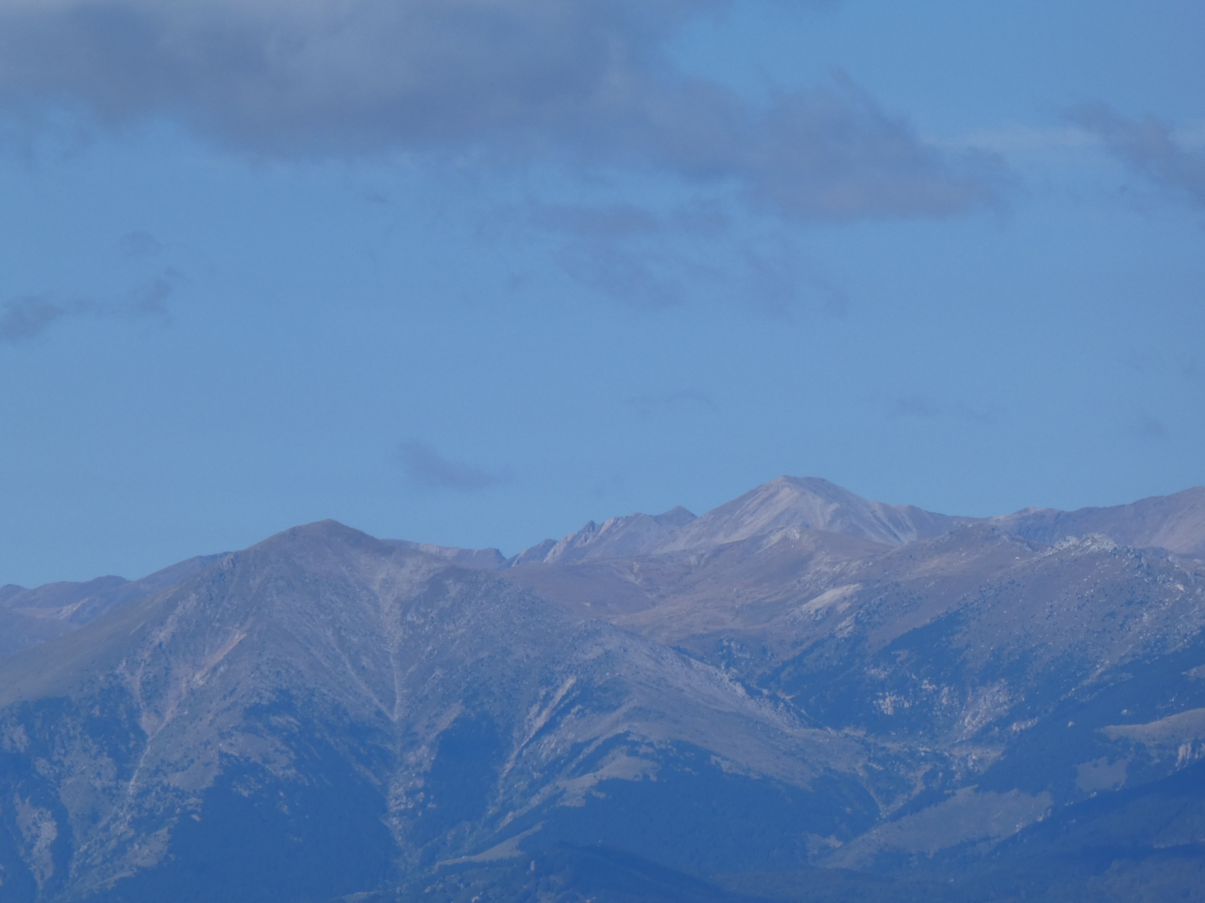 Zoom sur le massif du Canigou avec le Pic dels Set Homes (2651 m) à gauche, le Puig dels Tres Vents (2731 m) au centre-gauche, le Puig de Roc Negre (2714 m) au centre et la Crête du Barbet (2712 m) à droite
