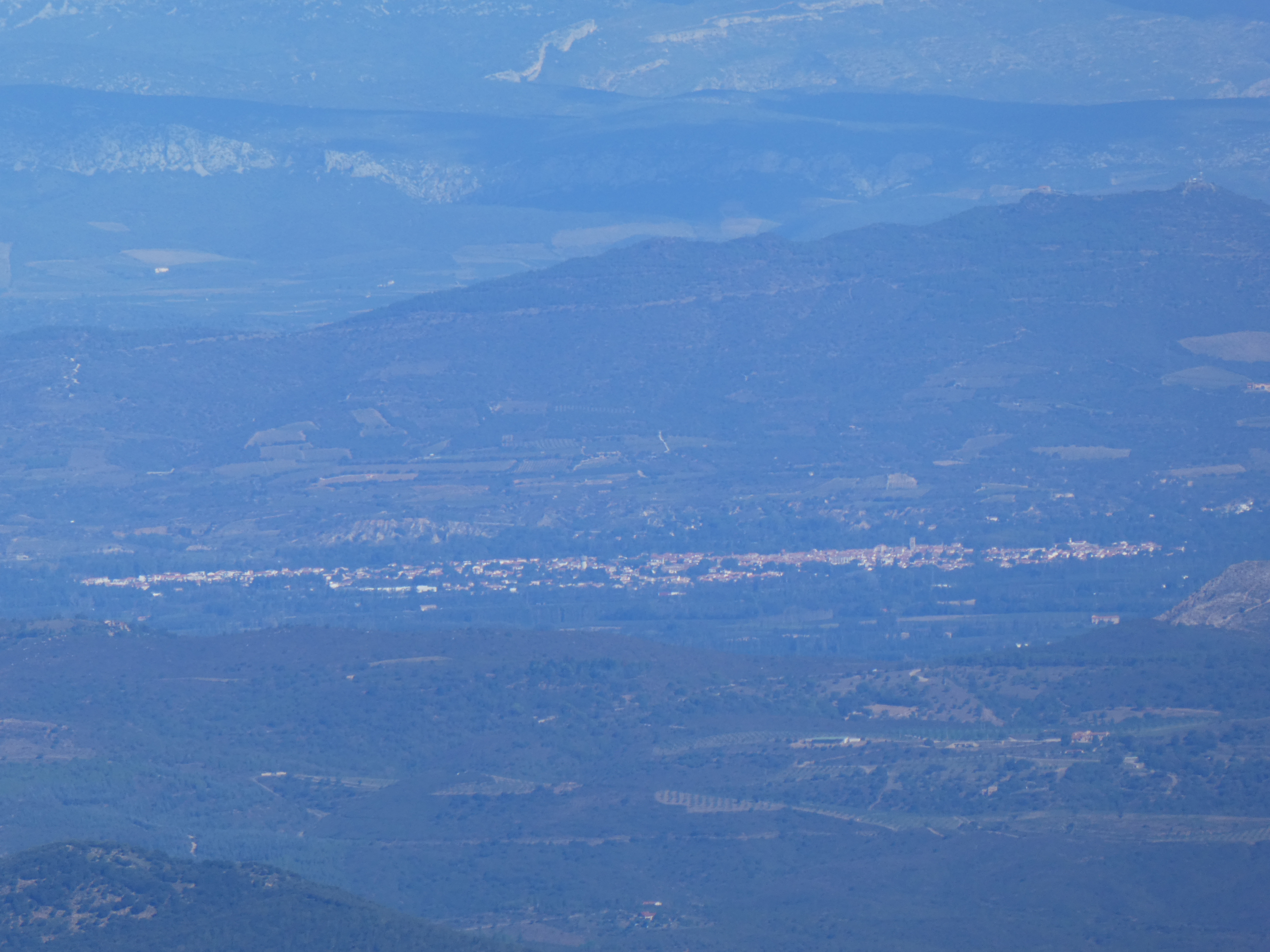 Zoom sur la Tossa d'Espinau (1089 m) à gauche et les Castellets (986 m) à droite au premier-plan ... sur le sommet de Golany (877 m) à gauche, el Montner (837 m) au centre et la Llebrera (811 m) à droite au deuxième-plan ... et sur Santa Barbàra (858 m) à droite en arrière-plan