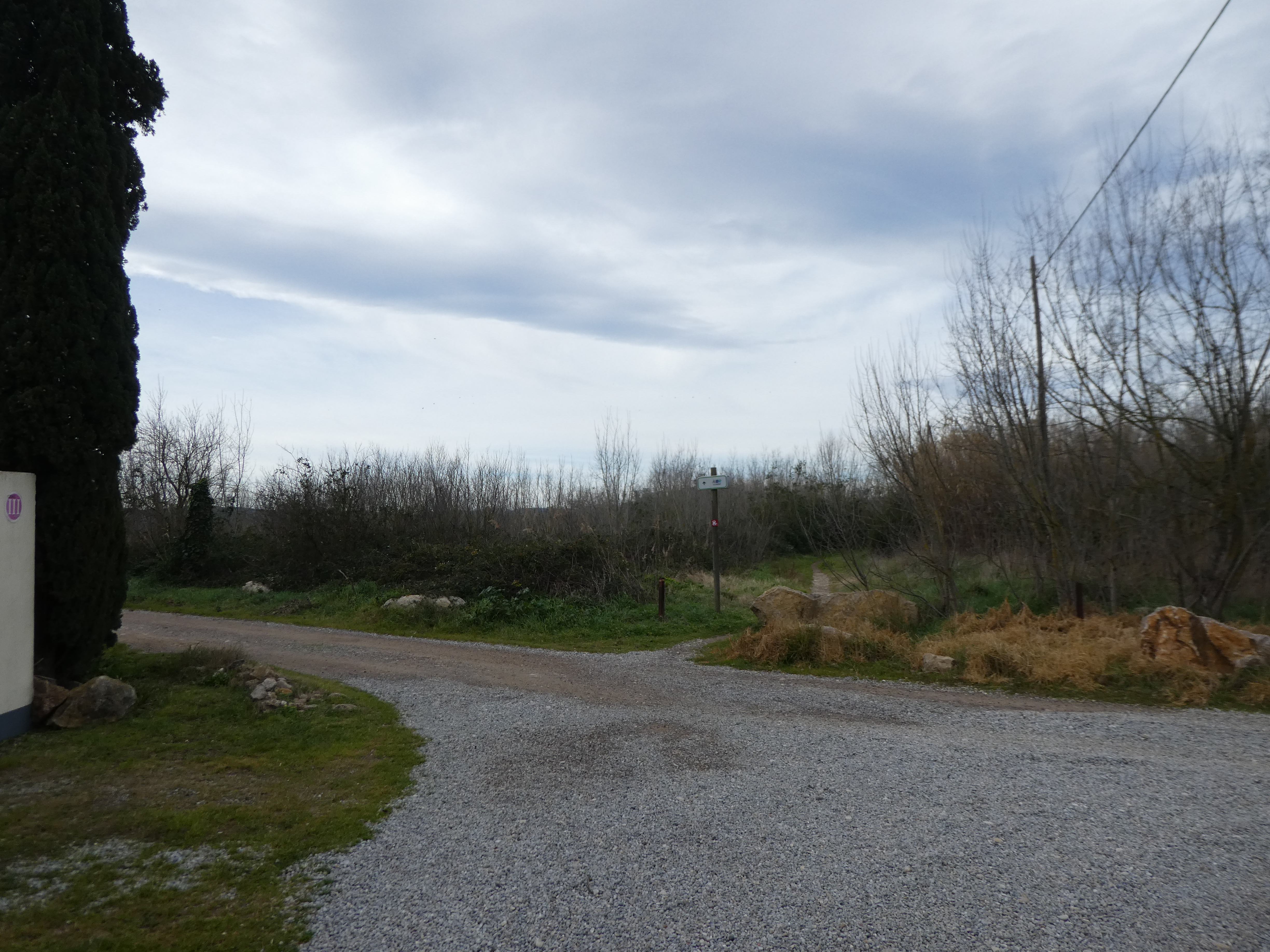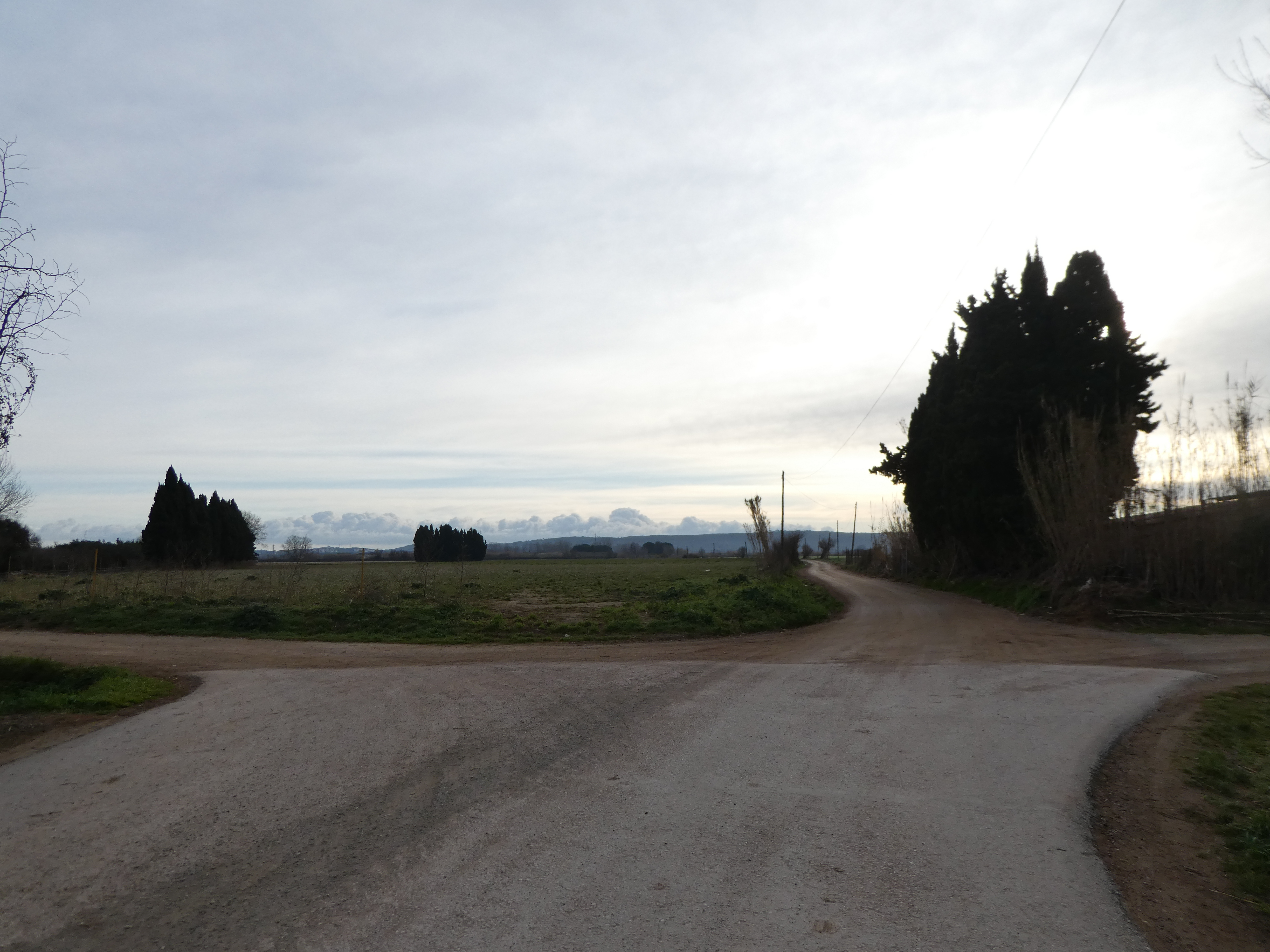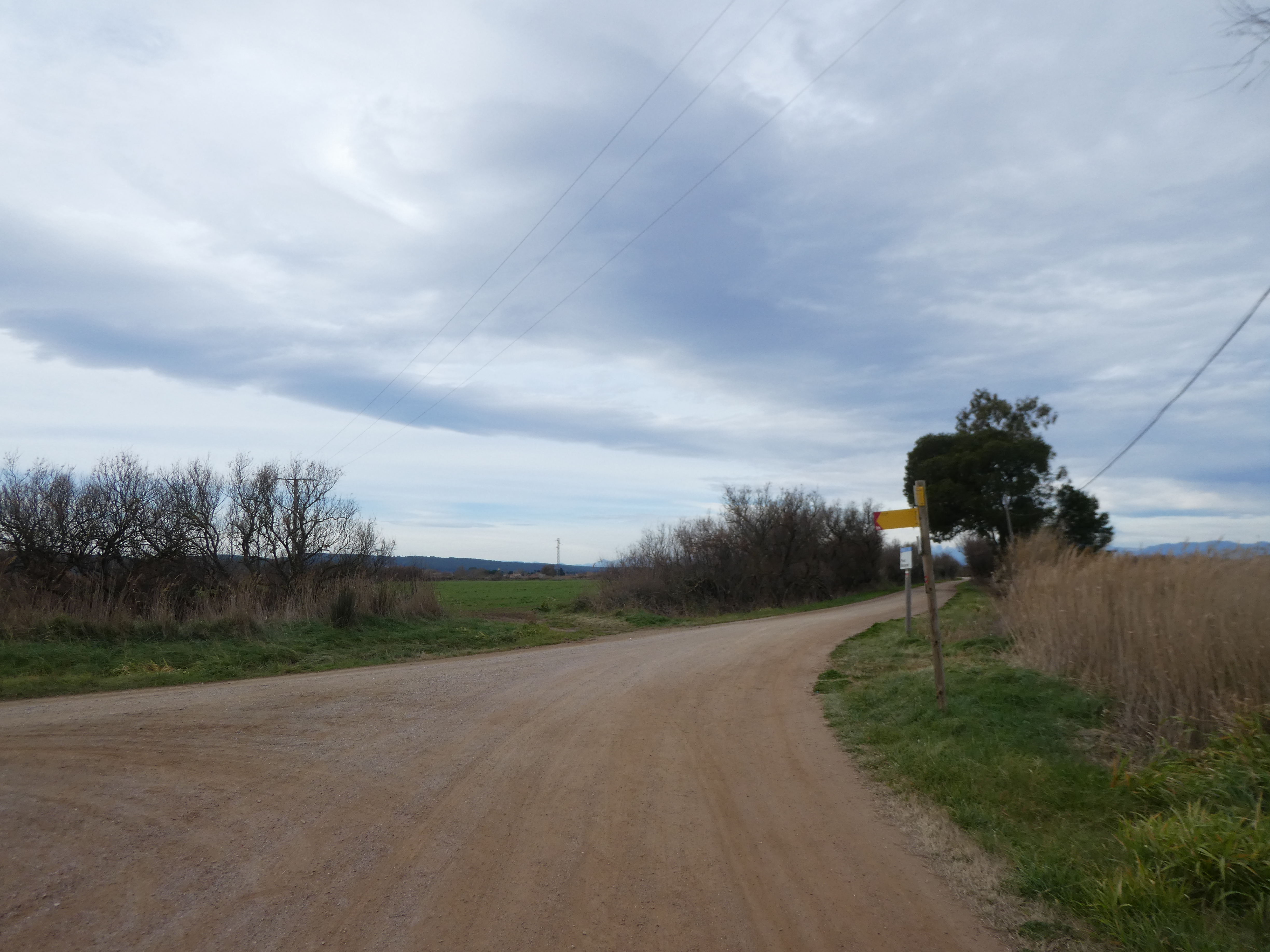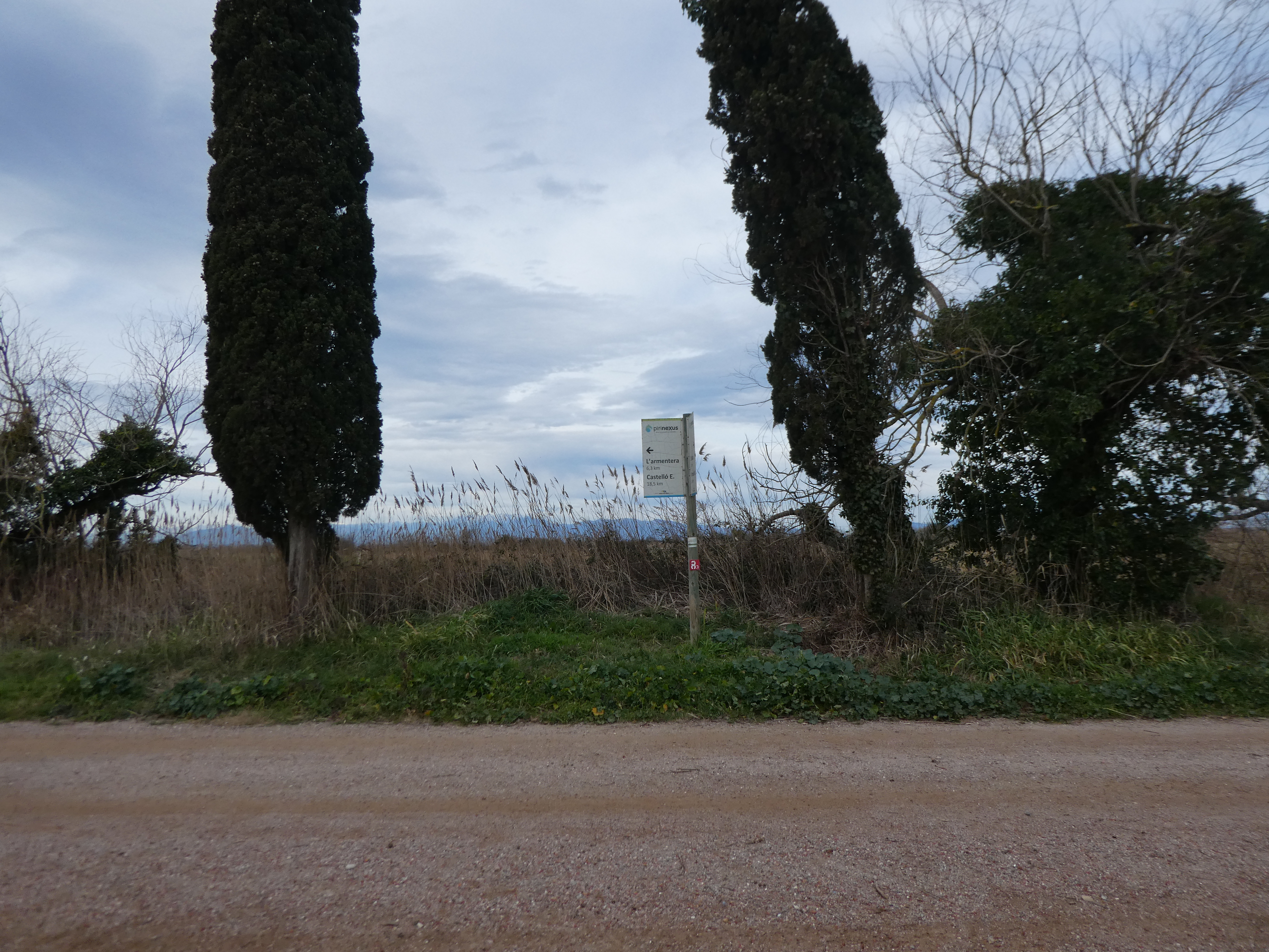 A ce croisement (150 mètres après le lieu-dit "Sant Martí d'Empúries"), traverser la route pour suivre le chemin partant sur la droite direction Cinc Claus, aucun balisage dorénavant (ce "détour" permet d'éviter de suivre la route et emprunte l'itinéraire cyclable du PirineXus)