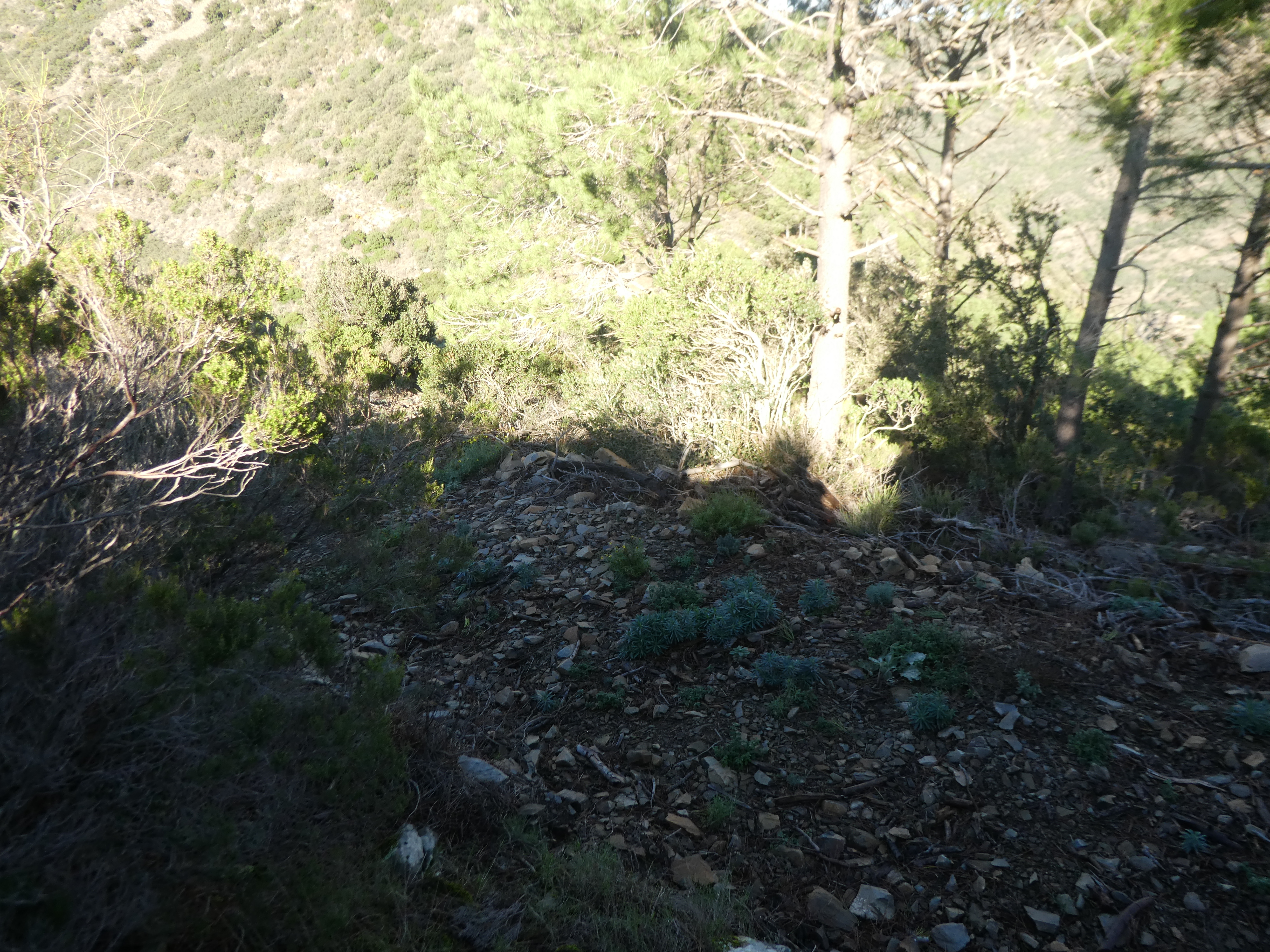 A ce croisement avec le sentier de montée vers la Torre Petita (200 mètres après le Coll del Teixó), suivre ce dernier montant de biais sur la droite direction Torre Petita, aucun balisage dorénavant