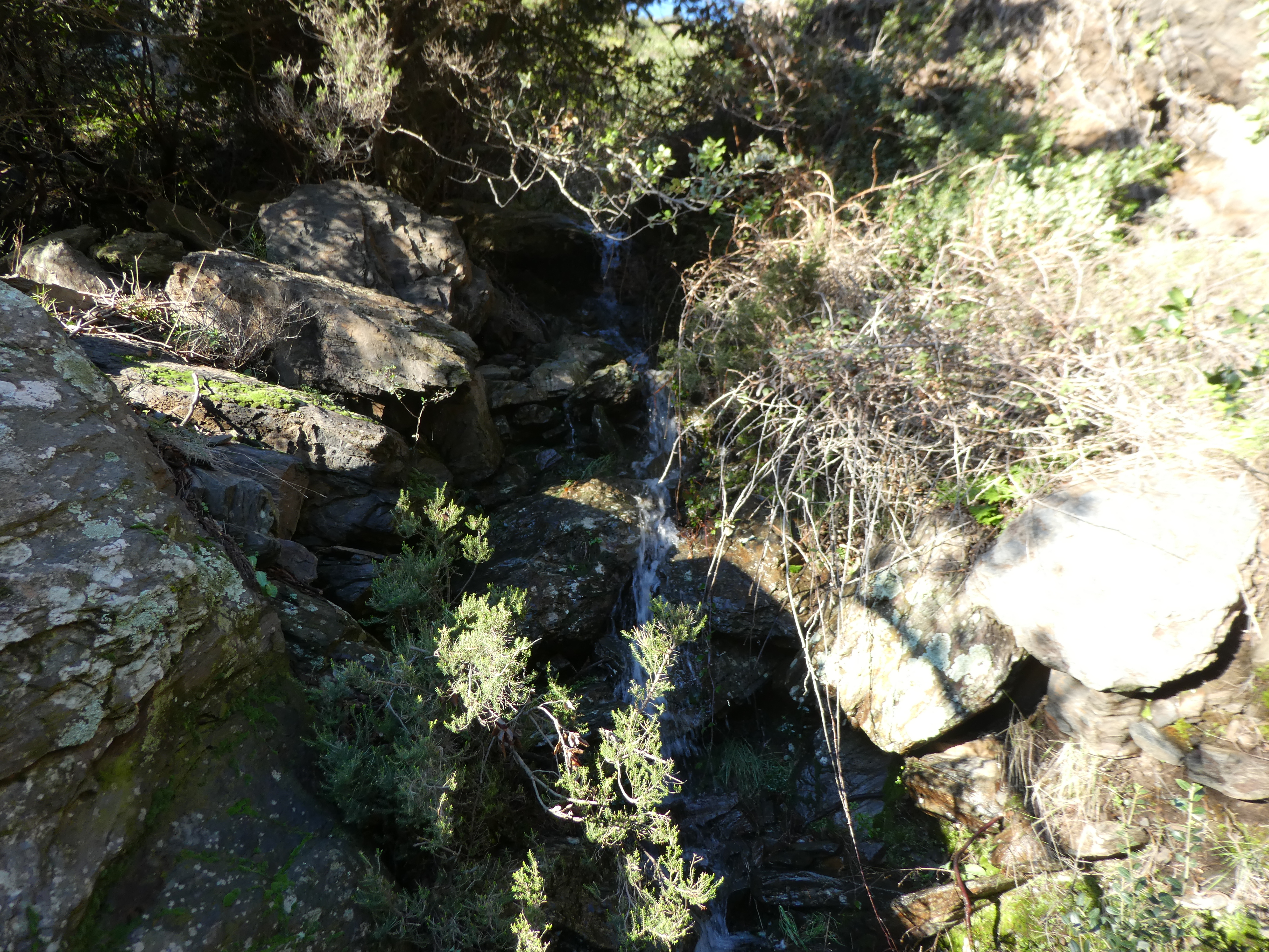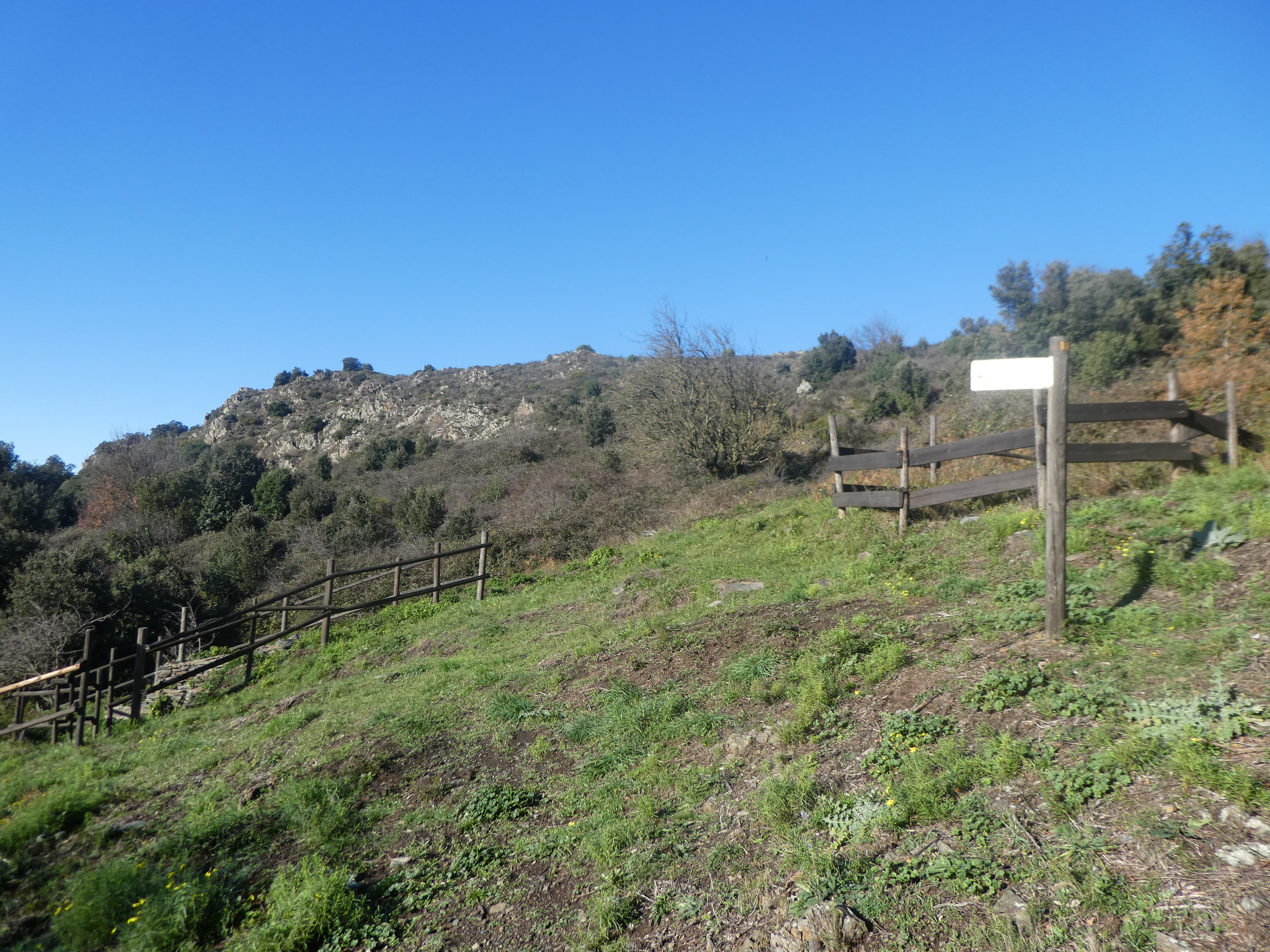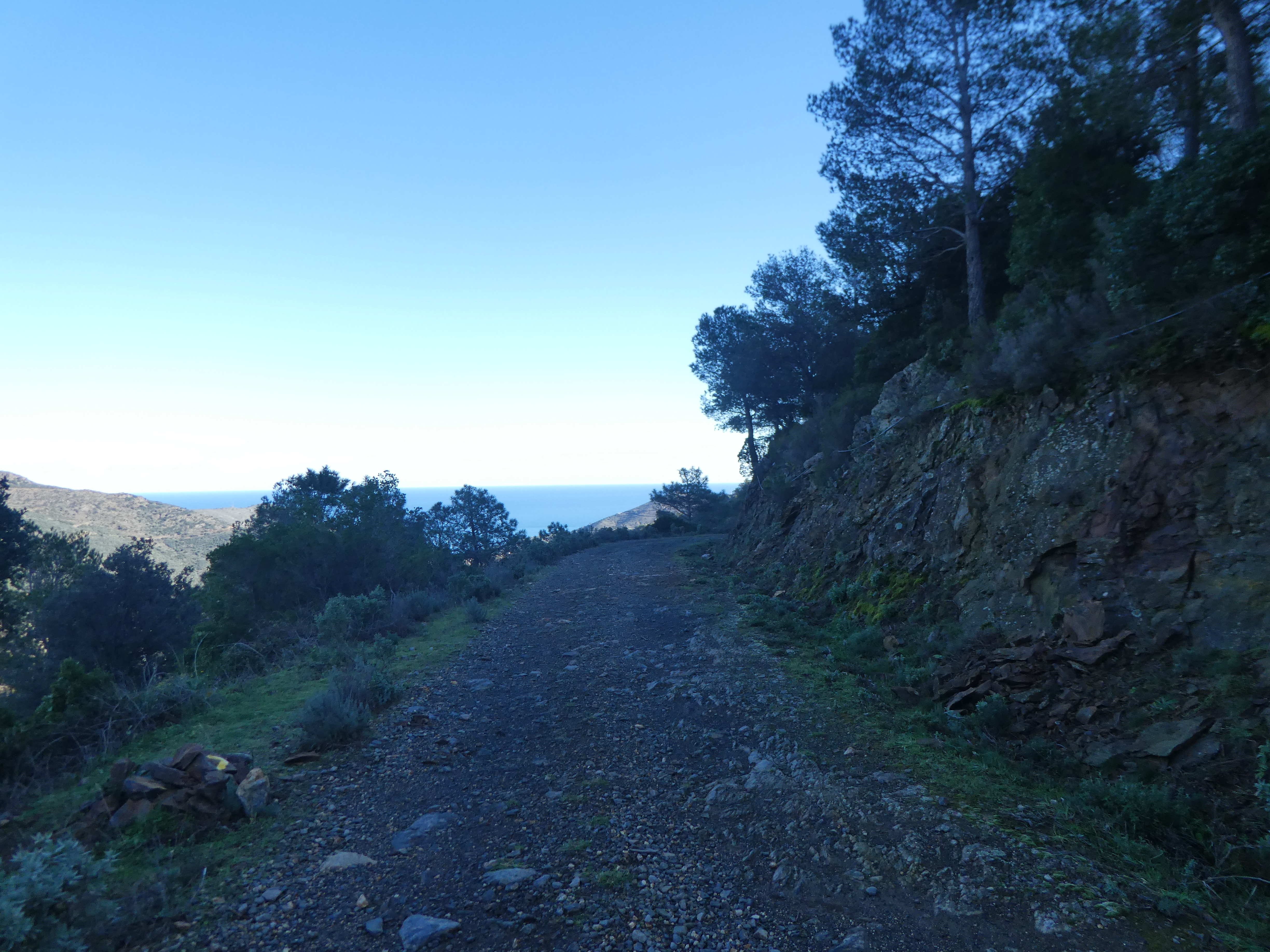 Coll de les Artigues (529 m) : suivre le chemin partant sur la droite direction Coll del Teixó, balisé en jaune (direction non mentionnée sur le panneau directionnel) (ceux qui auraient continué à suivre le sentier balisé passant par le Castell de Molinàs et Sant Miquel de Colera devraient se retrouver ici)