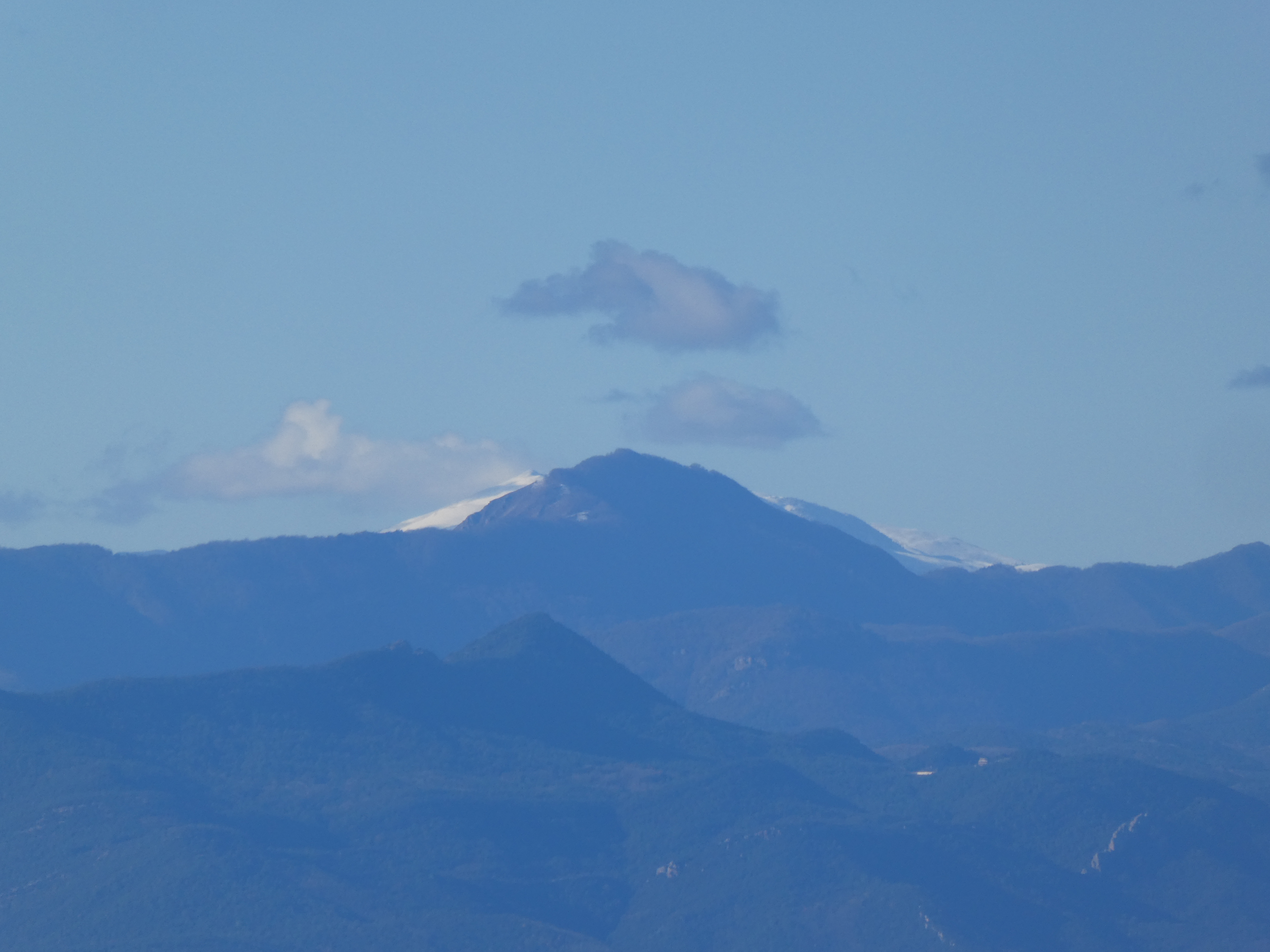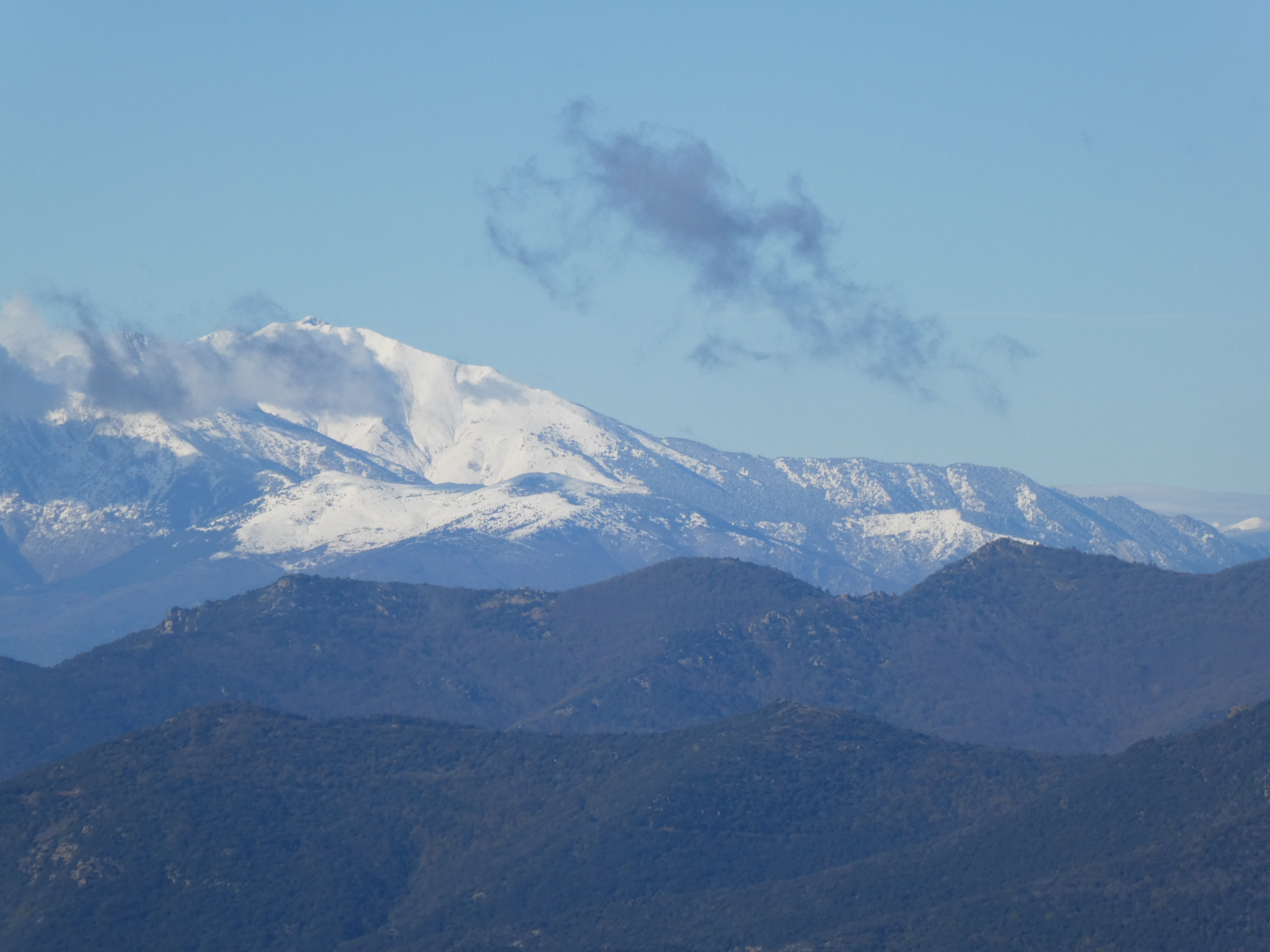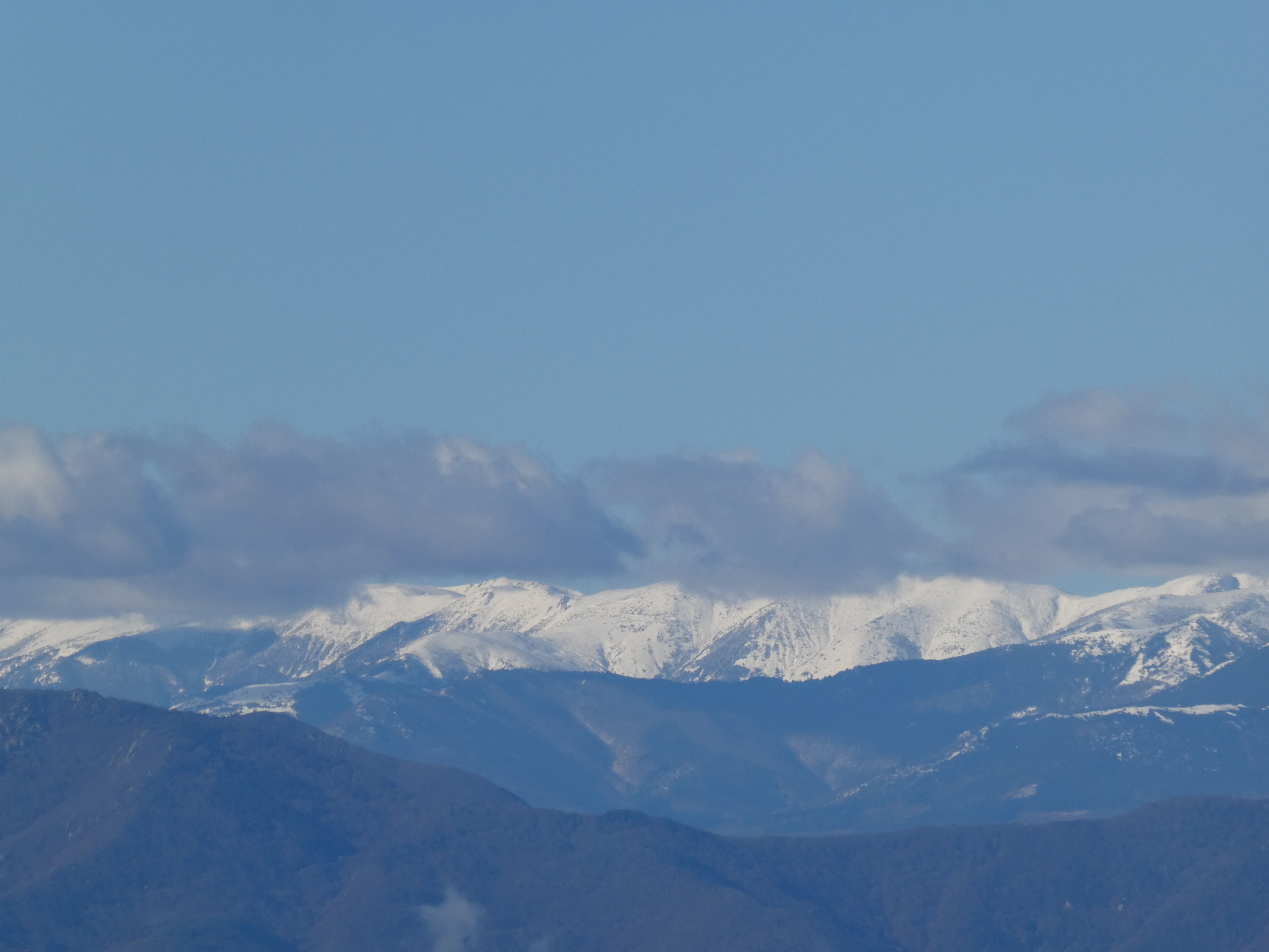 Vue en direction des sommets de l'Alta Garrotxa et du massif du Canigou enneigé
