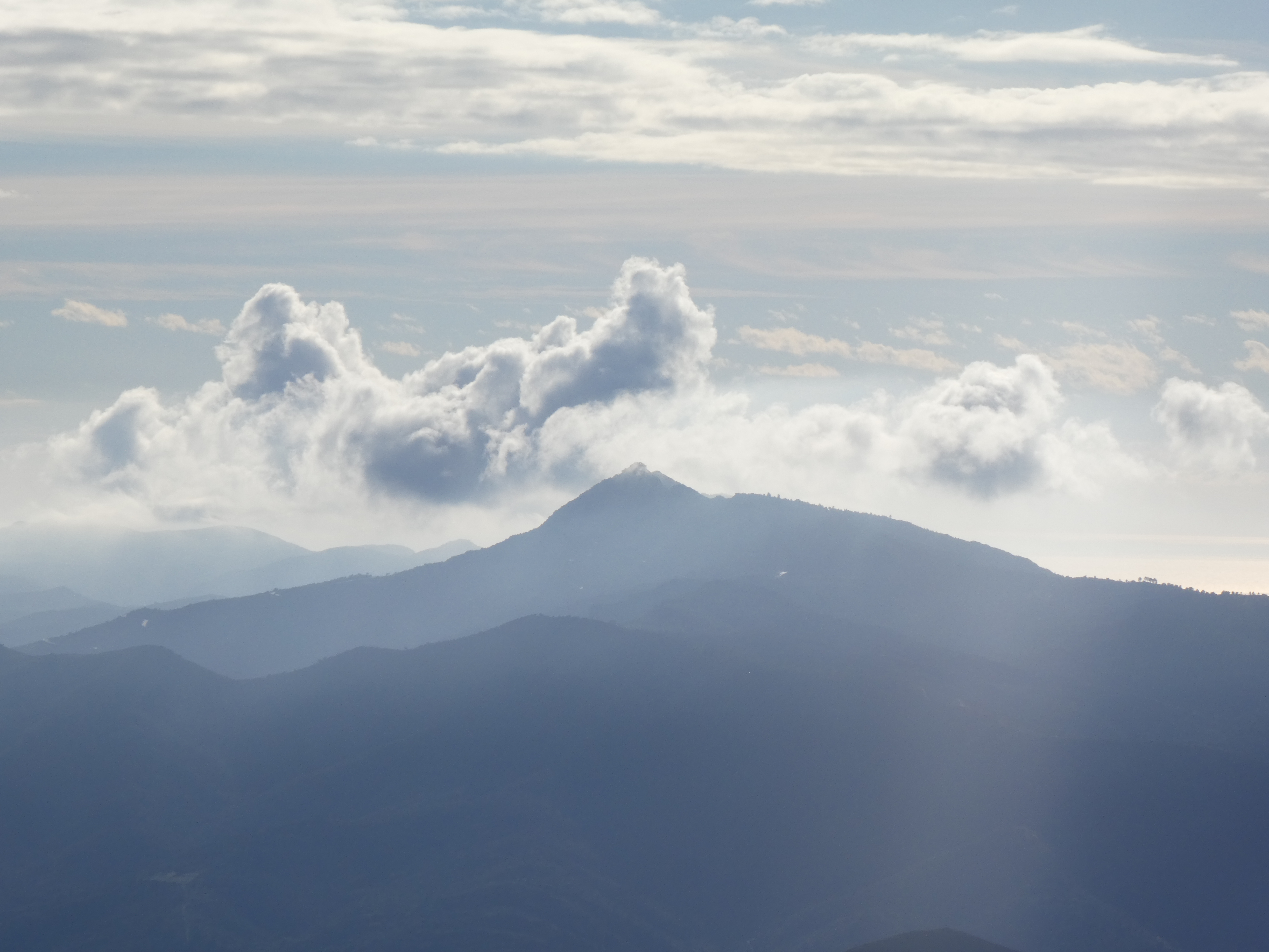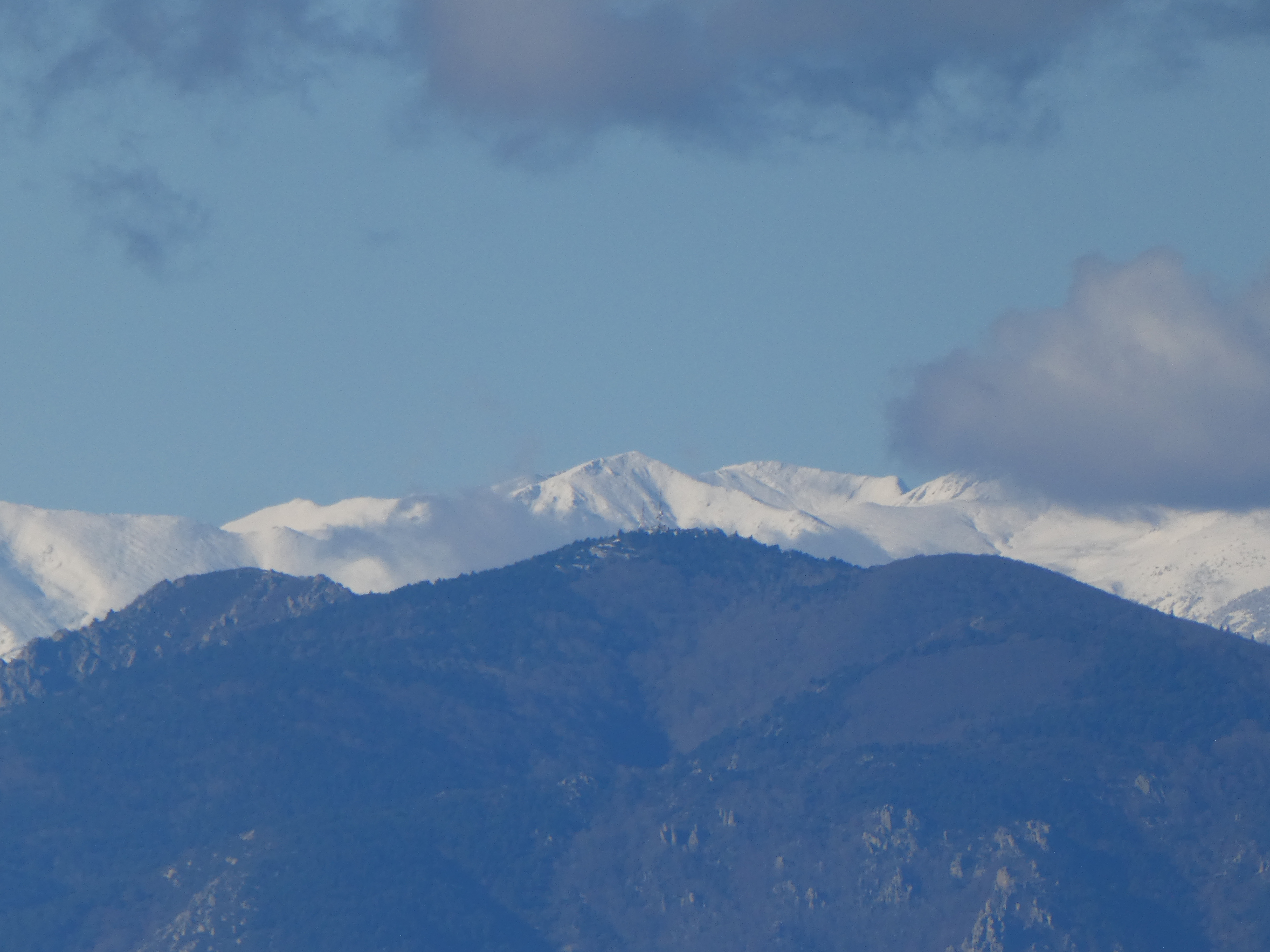 Zoom sur le massif du Canigou partiellement masqué par les nuages avec le Puig dels Tres Vents (2731 m) au centre-gauche et la Crête du Barbet (2712 m) à droite
