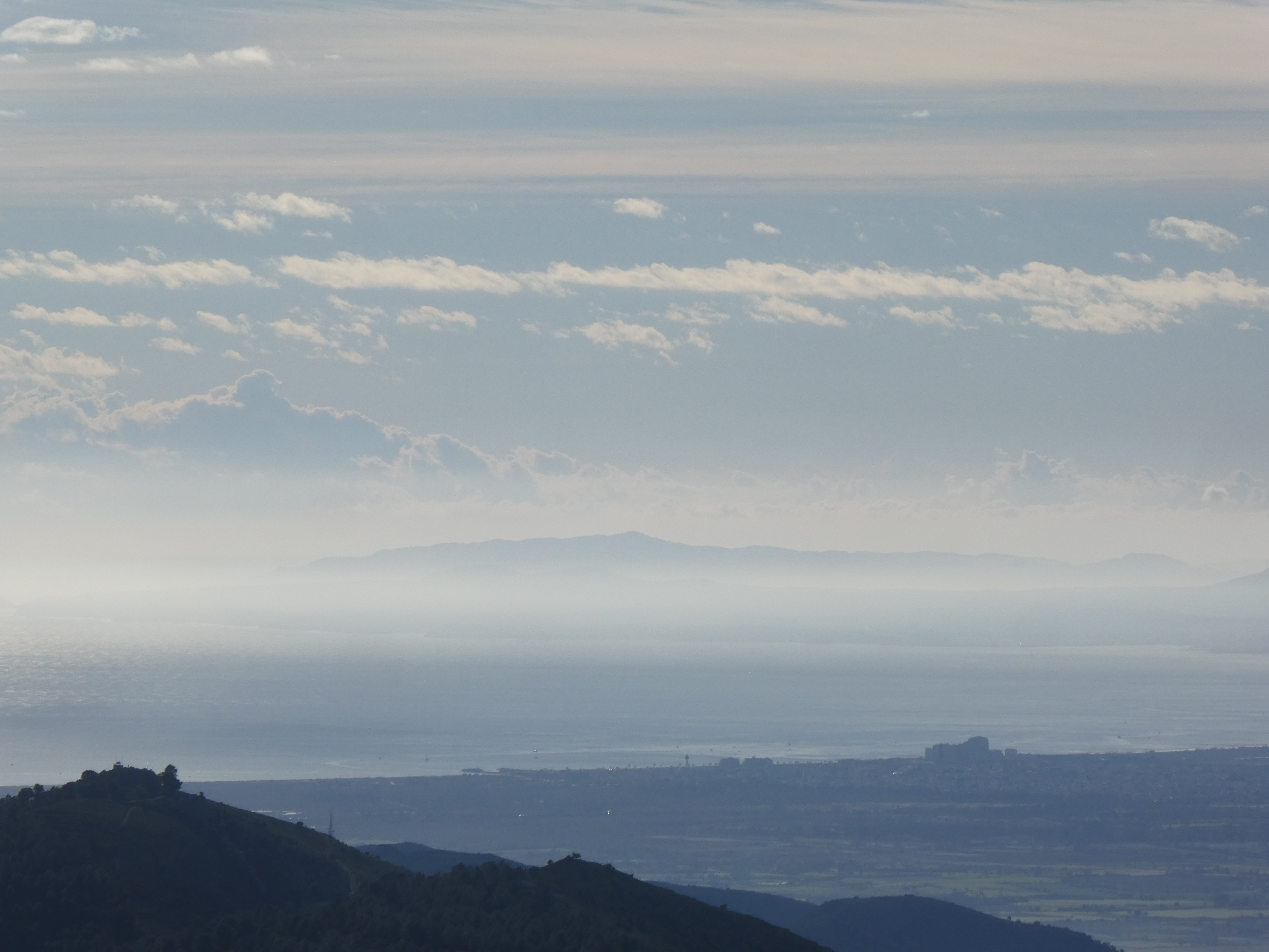 Zoom sur le Puig dels Pradets (1176 m) au centre-gauche et le Puig dels Quatre Termes (1156 m) au centre-droit masqué par les nuages