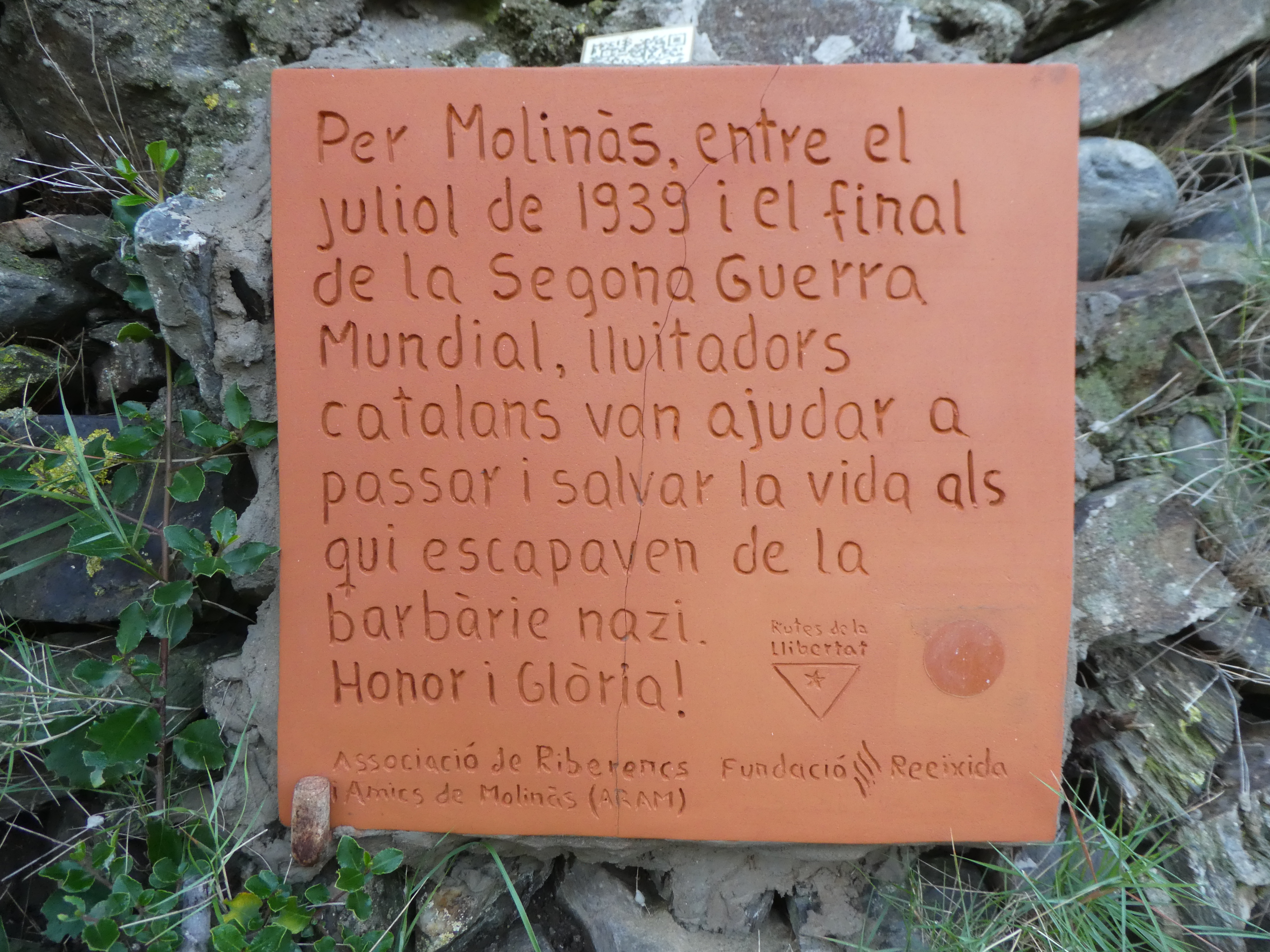 Plaque en hommage aux catalans ayant aidé de nombreuses personnes à passer la frontière pour fuir la barbarie nazie durant la Seconde Guerre Mondiale