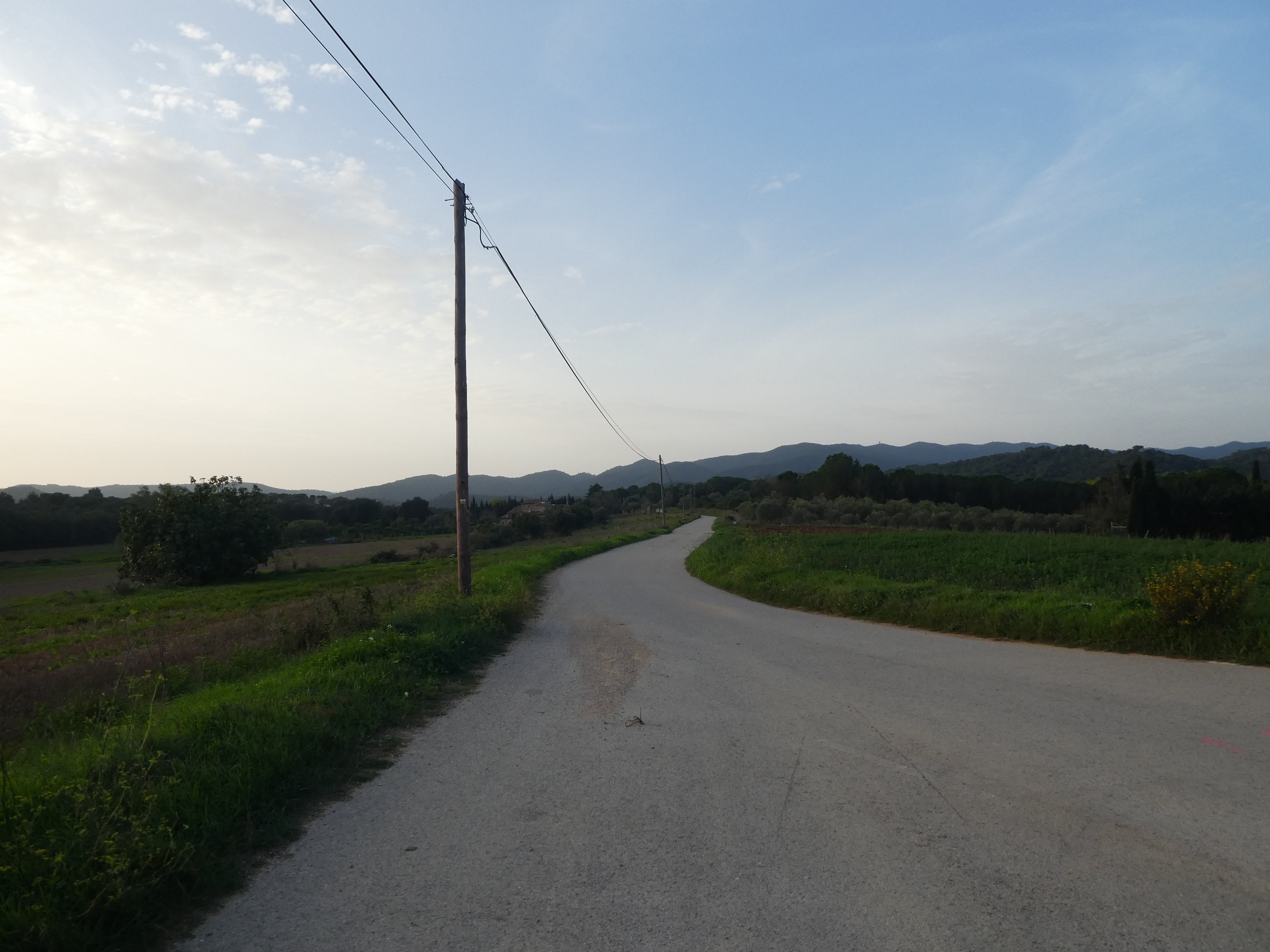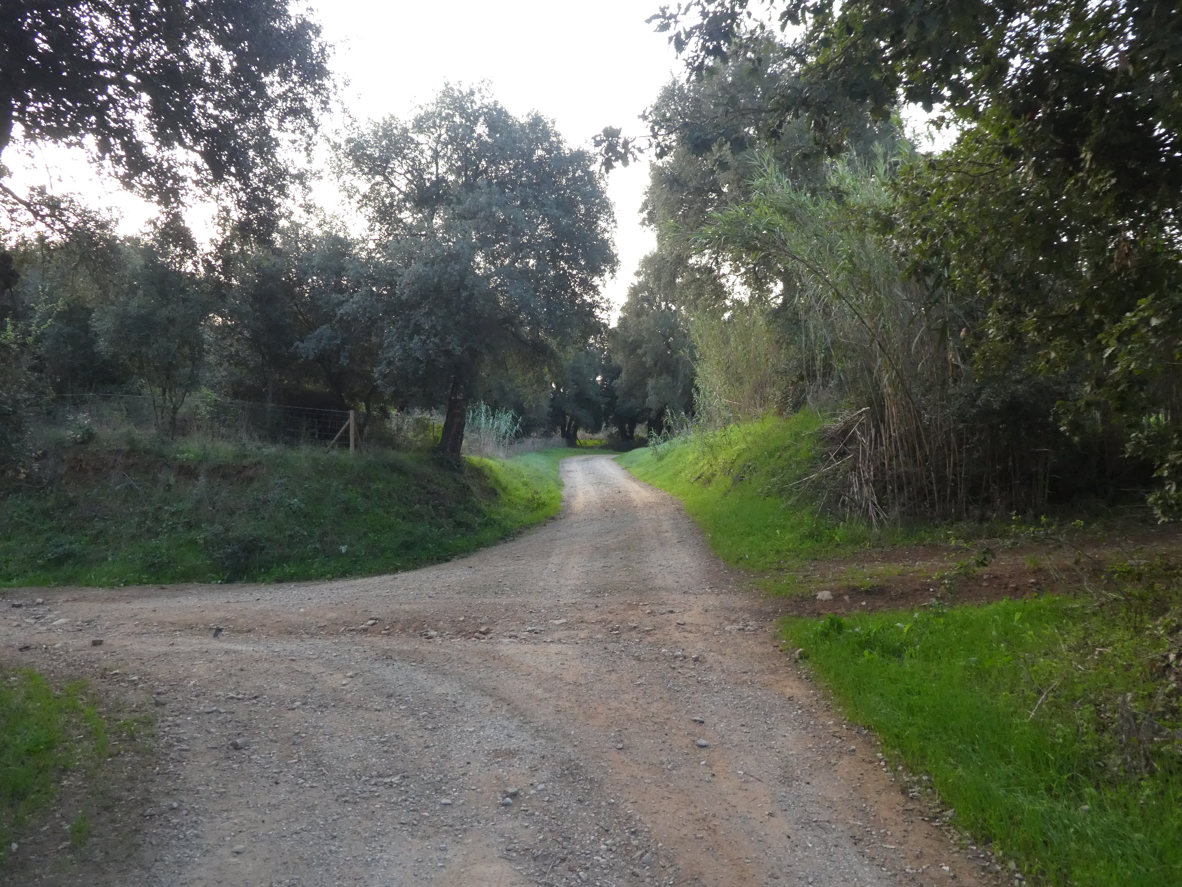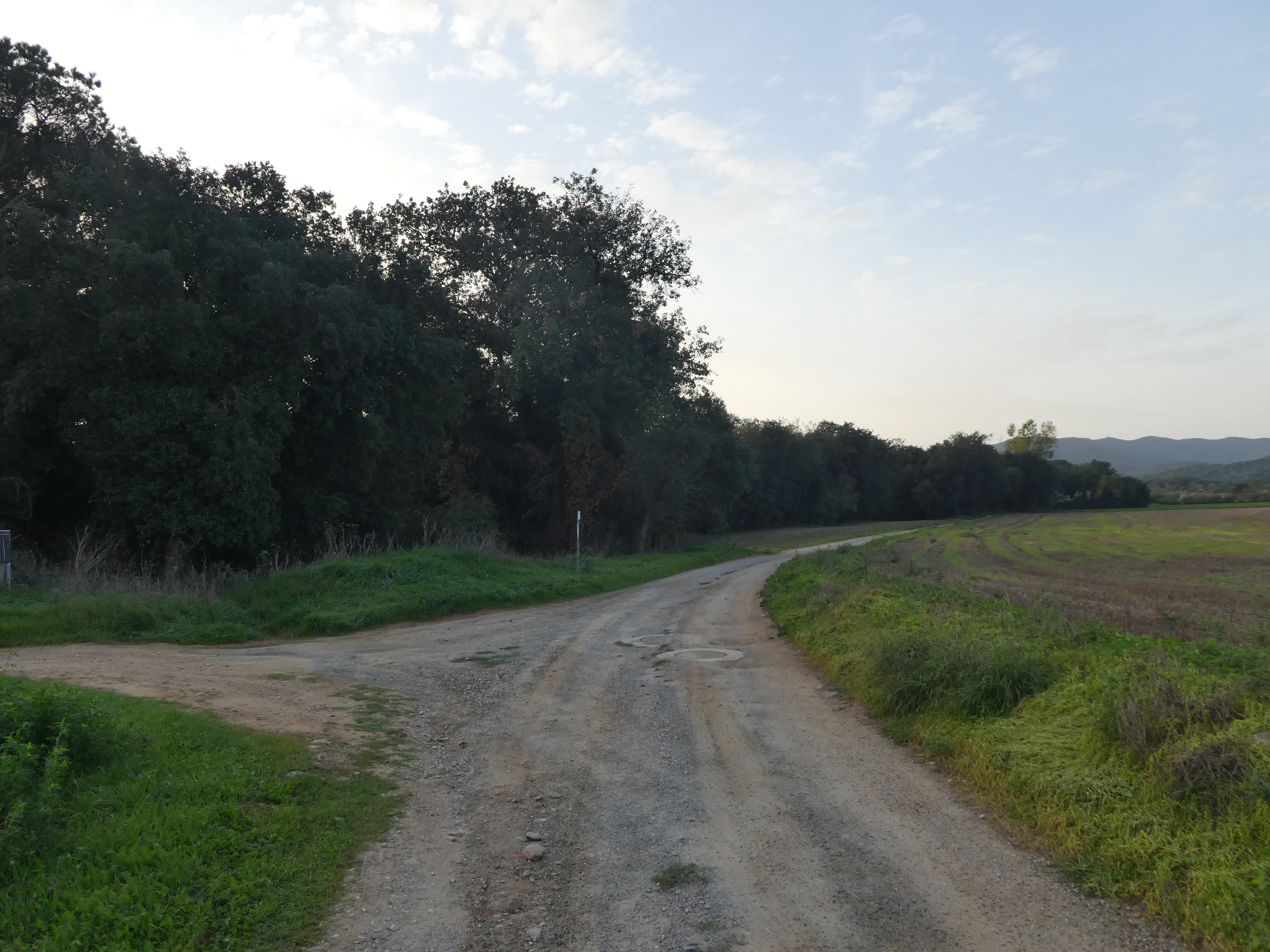 A ce croisement avec une large piste située au niveau du lieu-dit "Can Llobet" (3800 mètres après le précédent), suivre cette dernière sur la droite direction la Bisbal d'Empordà, balisé en jaune et blanc