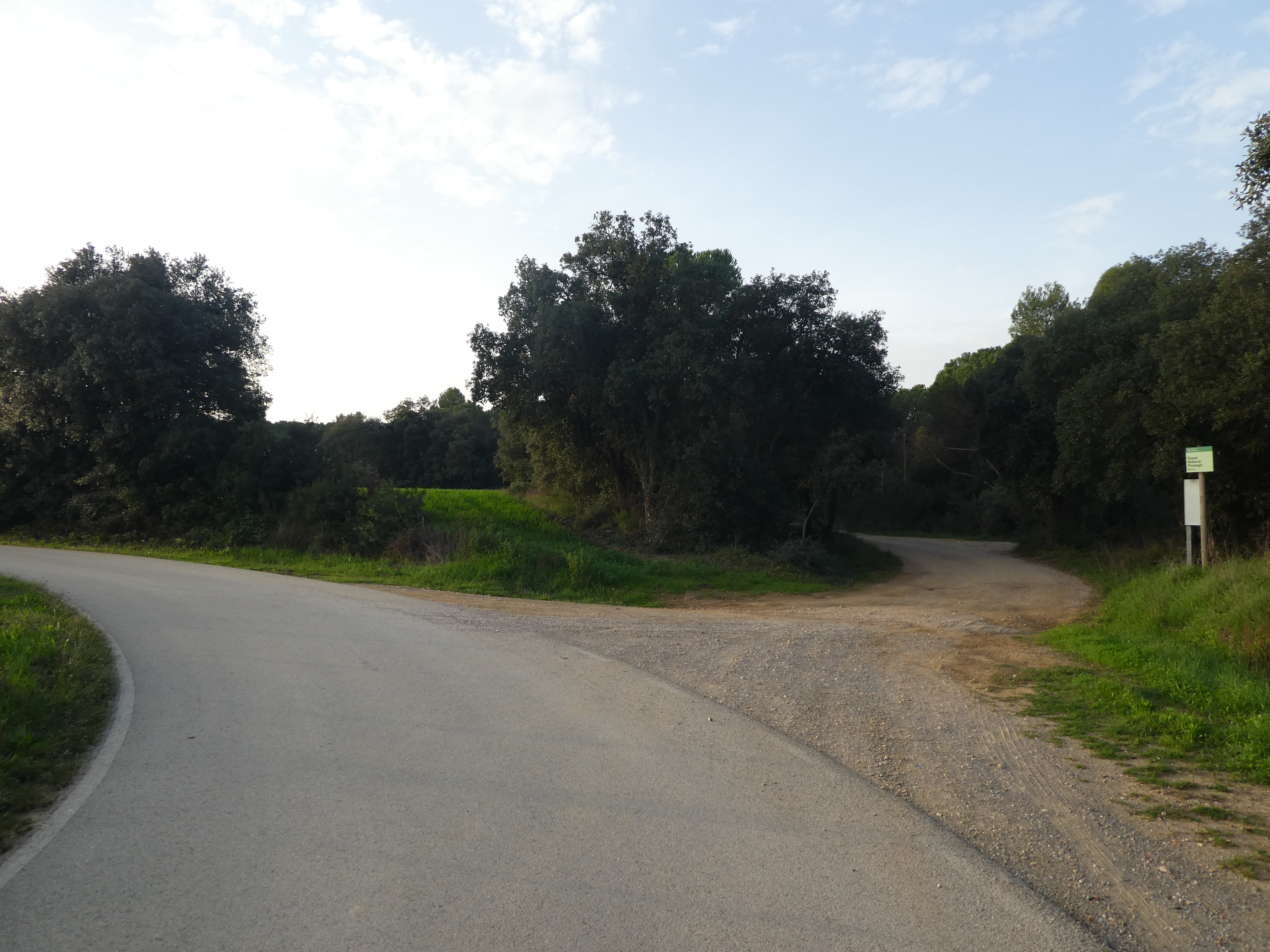 A ce croisement marqué par la présence d'un panneau d'information "Espai Natural Protegit" (250 mètres après le précédent), quitter la route partant sur la gauche pour suivre la piste partant légèrement sur la droite direction Coll de Bregó