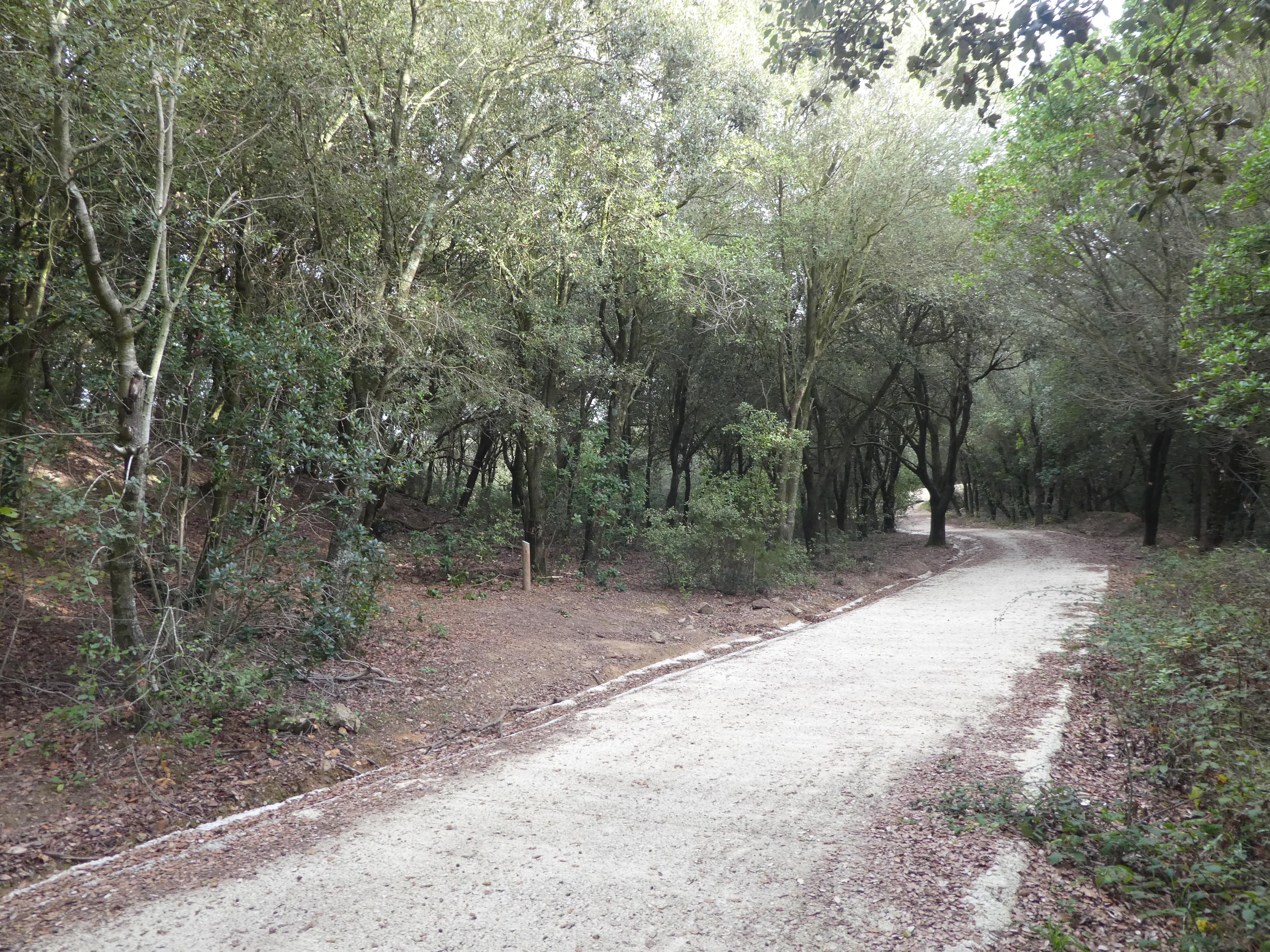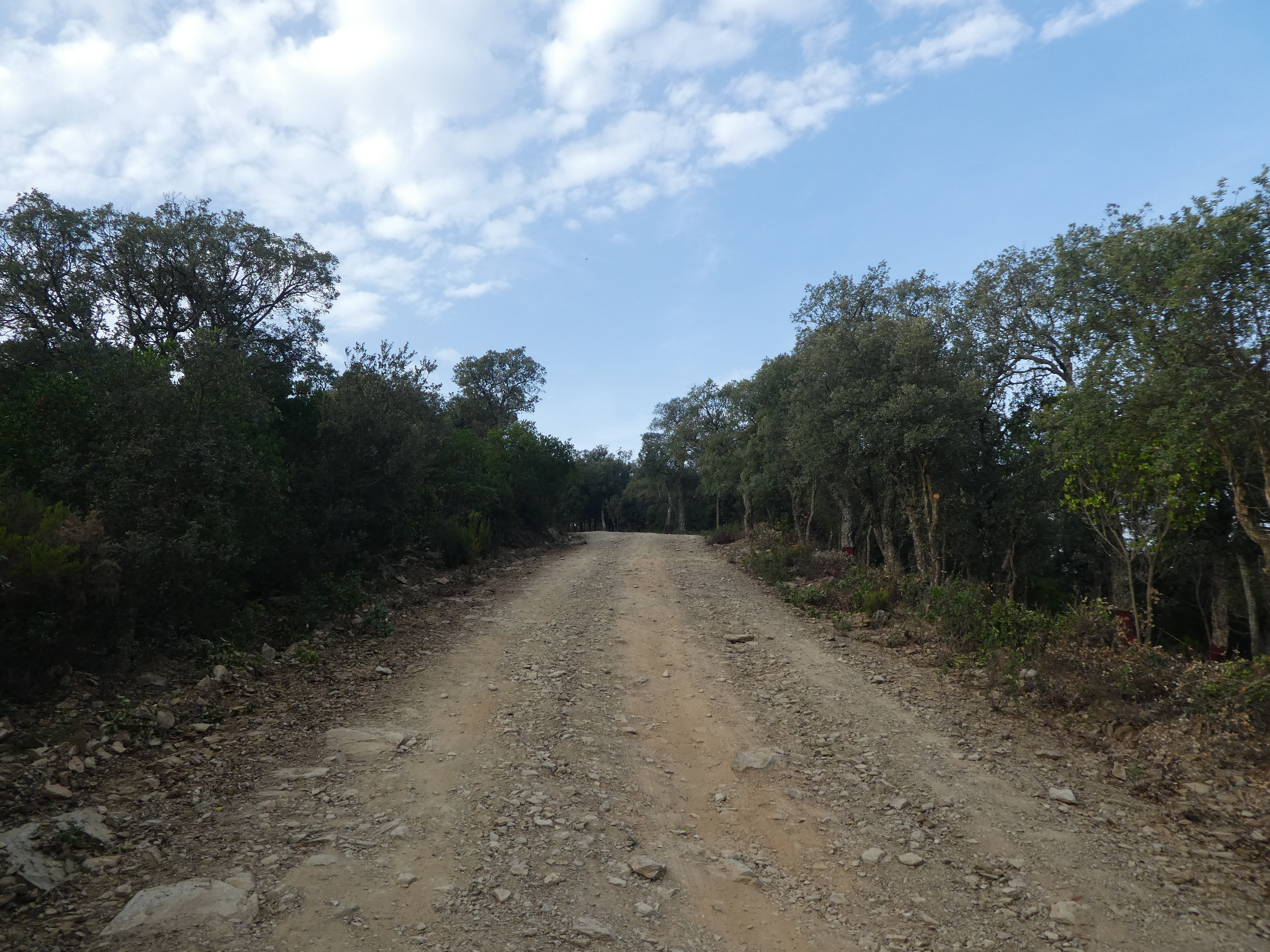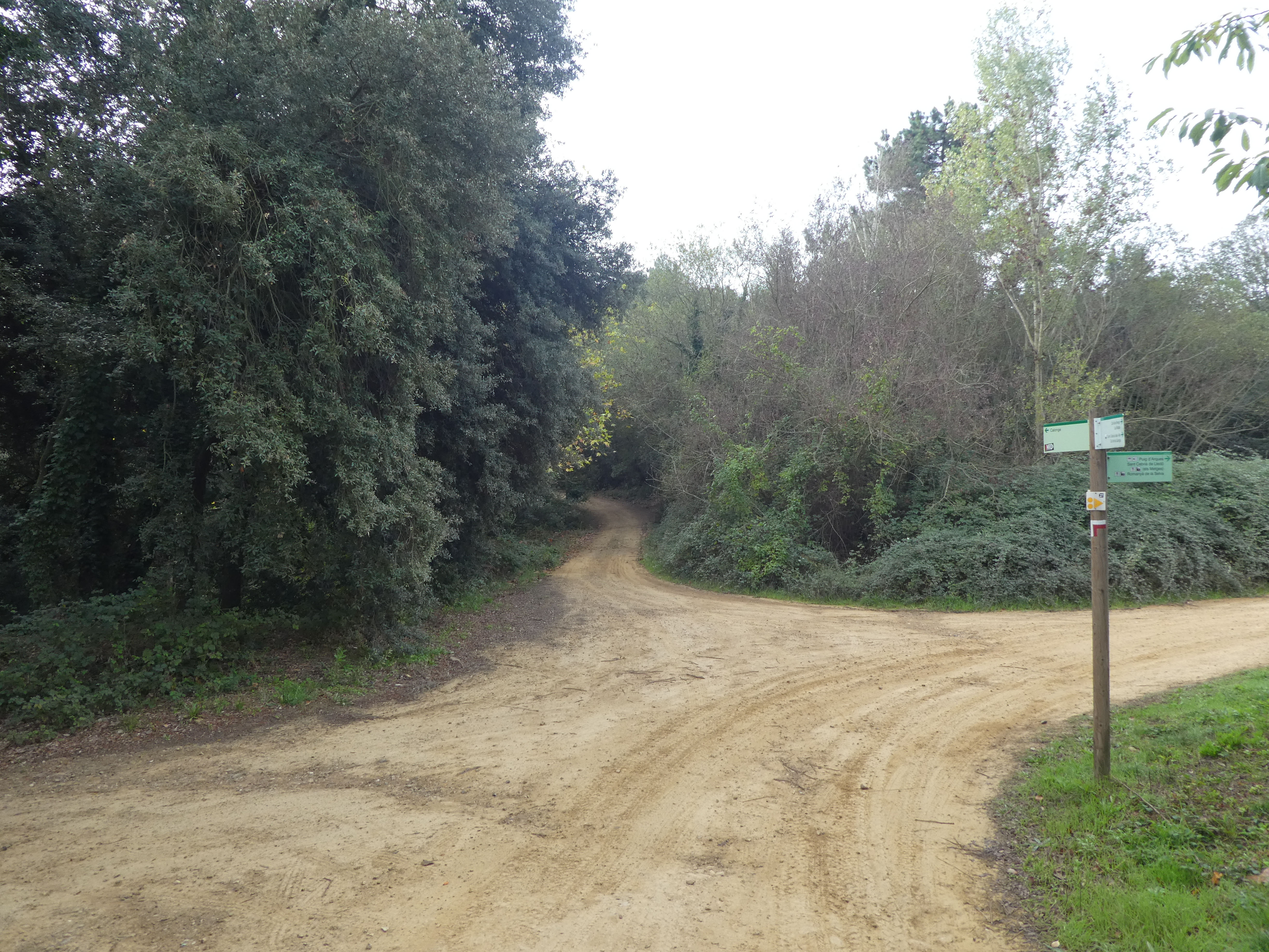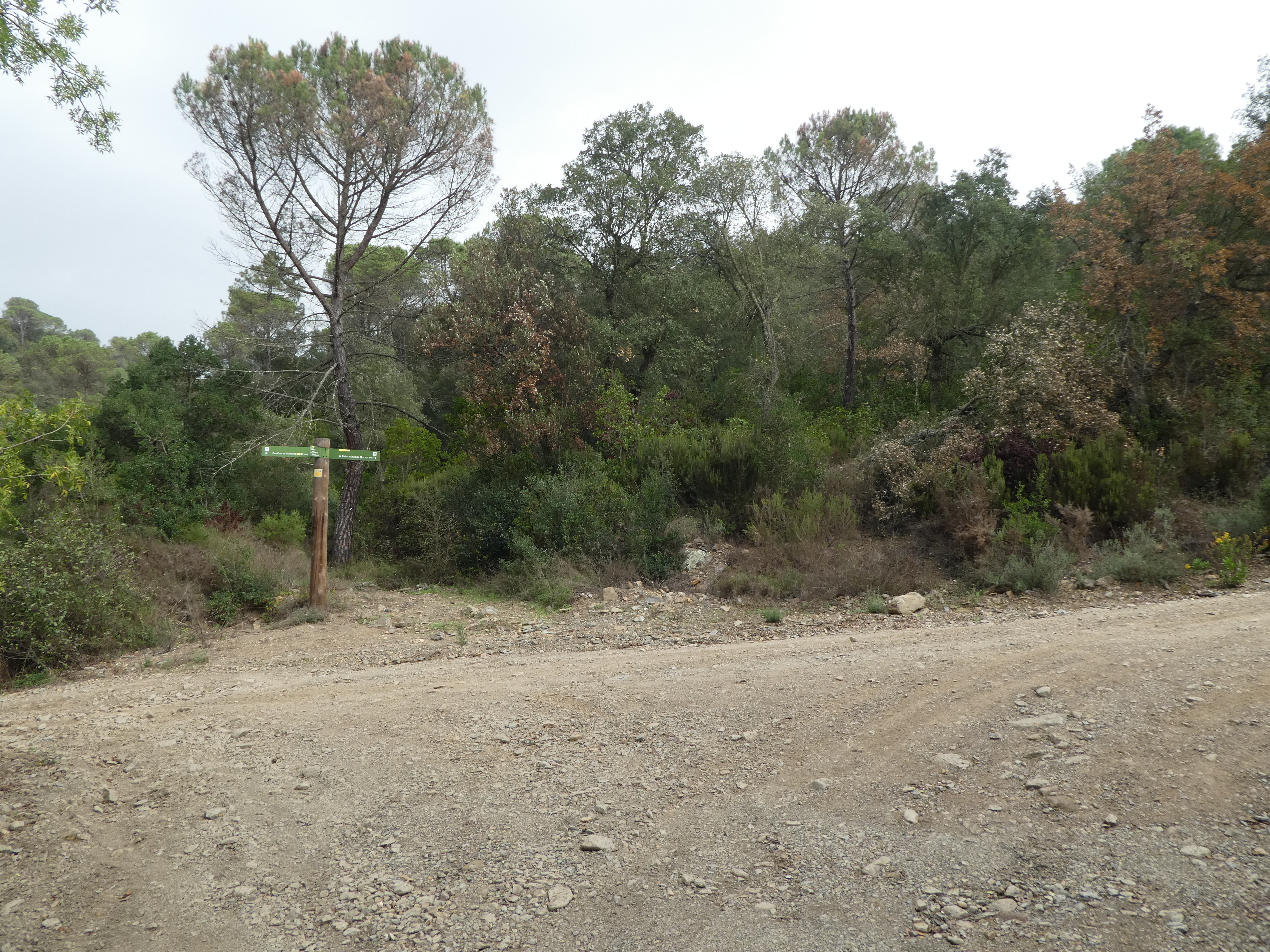 Plans de Can Sabater (465 m) : suivre le large chemin partant tout droit vers le parking du sentier d'interprétation du Puig d'Arques direction Puig d'Arques, balisé en rouge et blanc