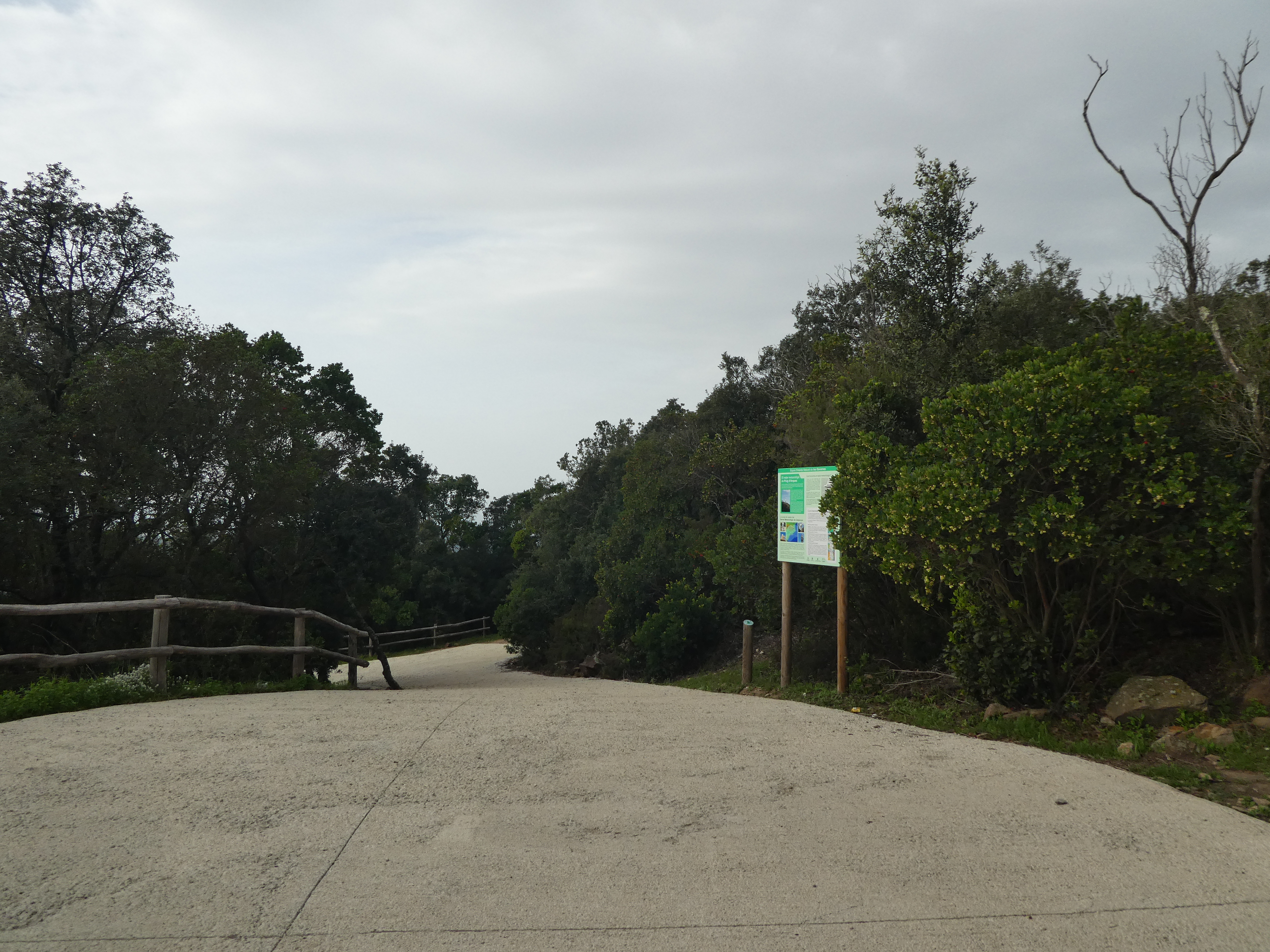 A ce croisement situé au niveau du parking du sentier d'interprétation du Puig d'Arques (25 mètres après le lieu-dit "Plans de Can Sabater"), suivre le sentier d'interprétation partant sur la droite dans le sous-bois direction Puig d'Arques, balisé en vert dorénavant