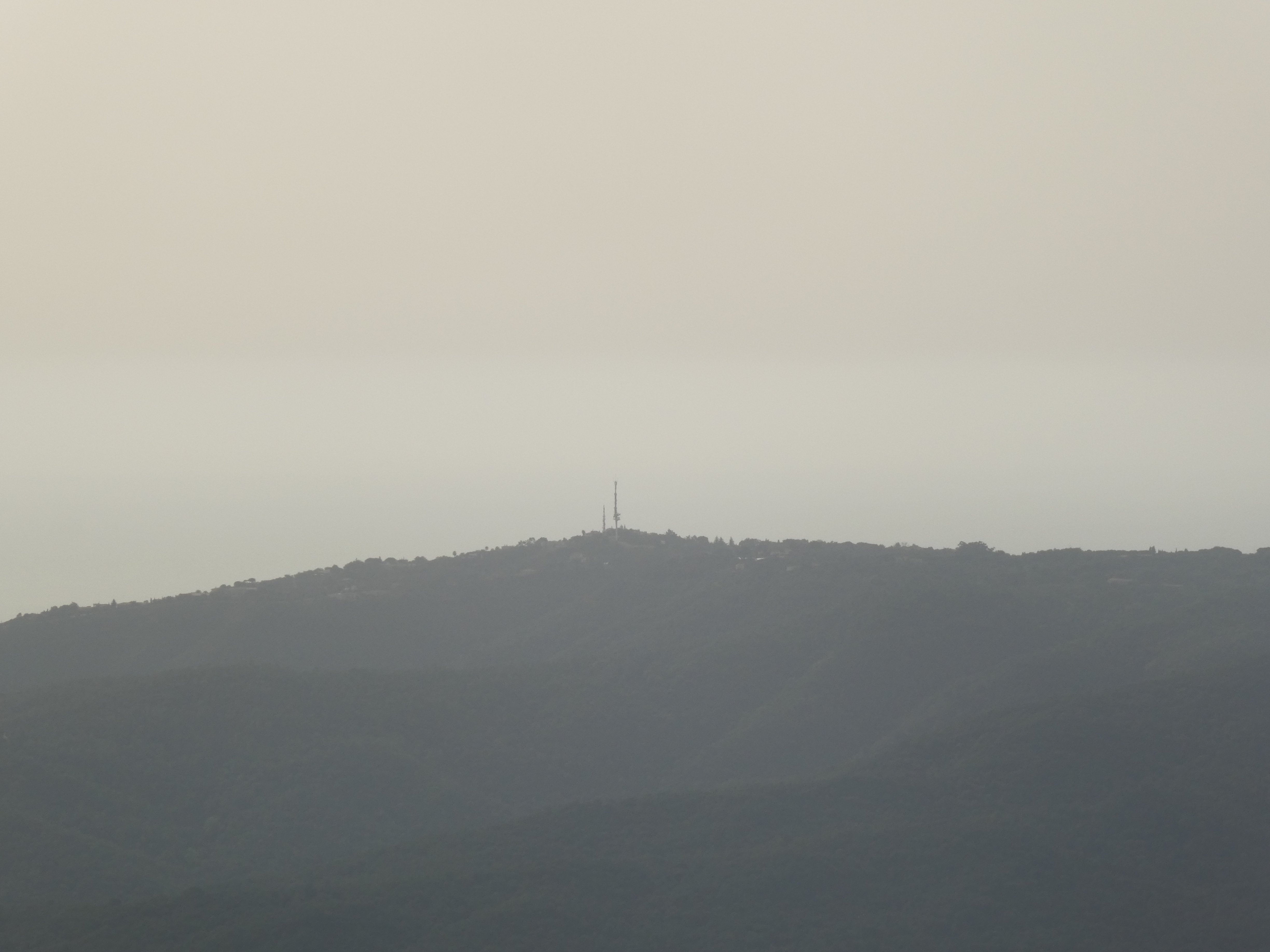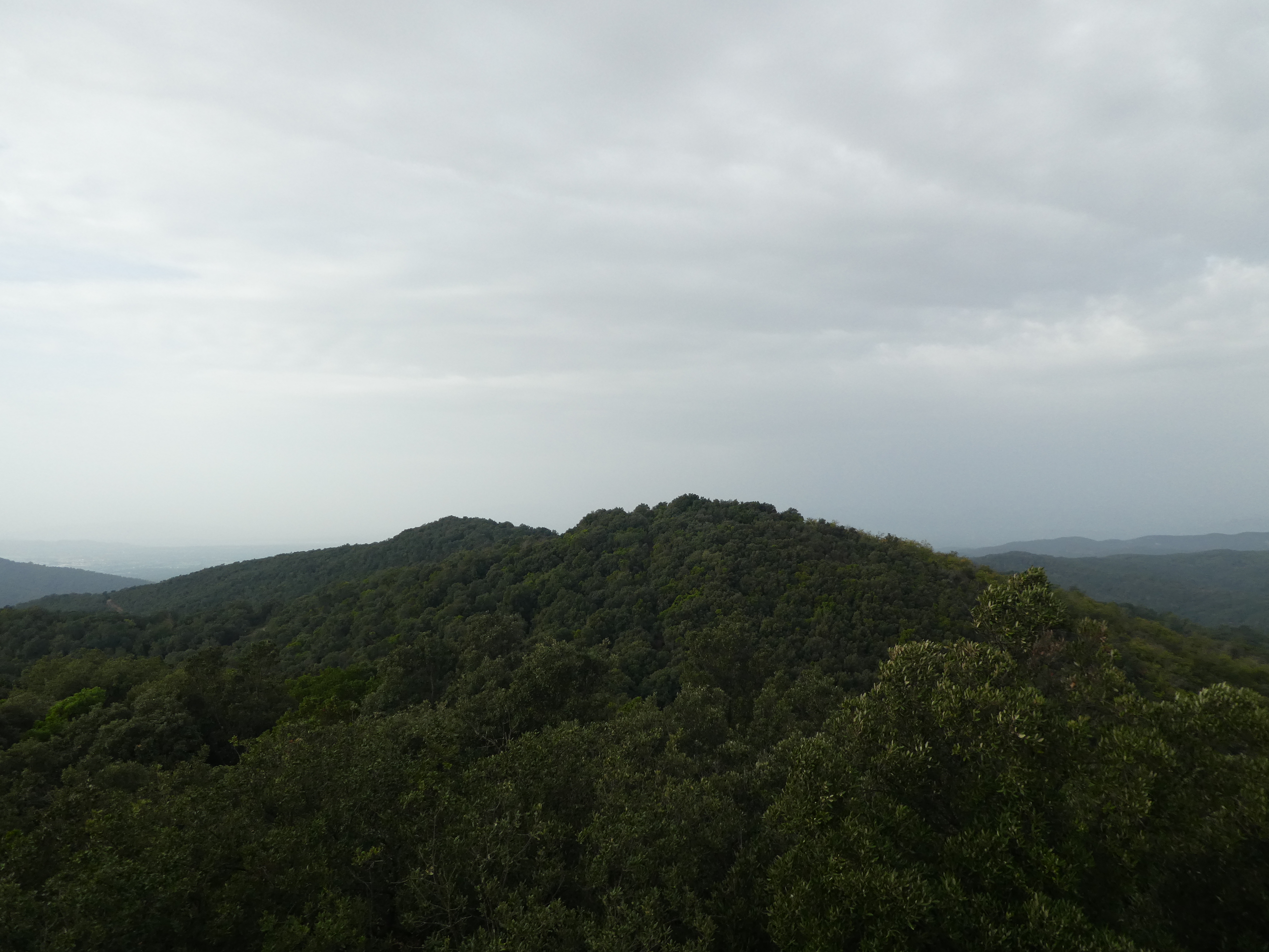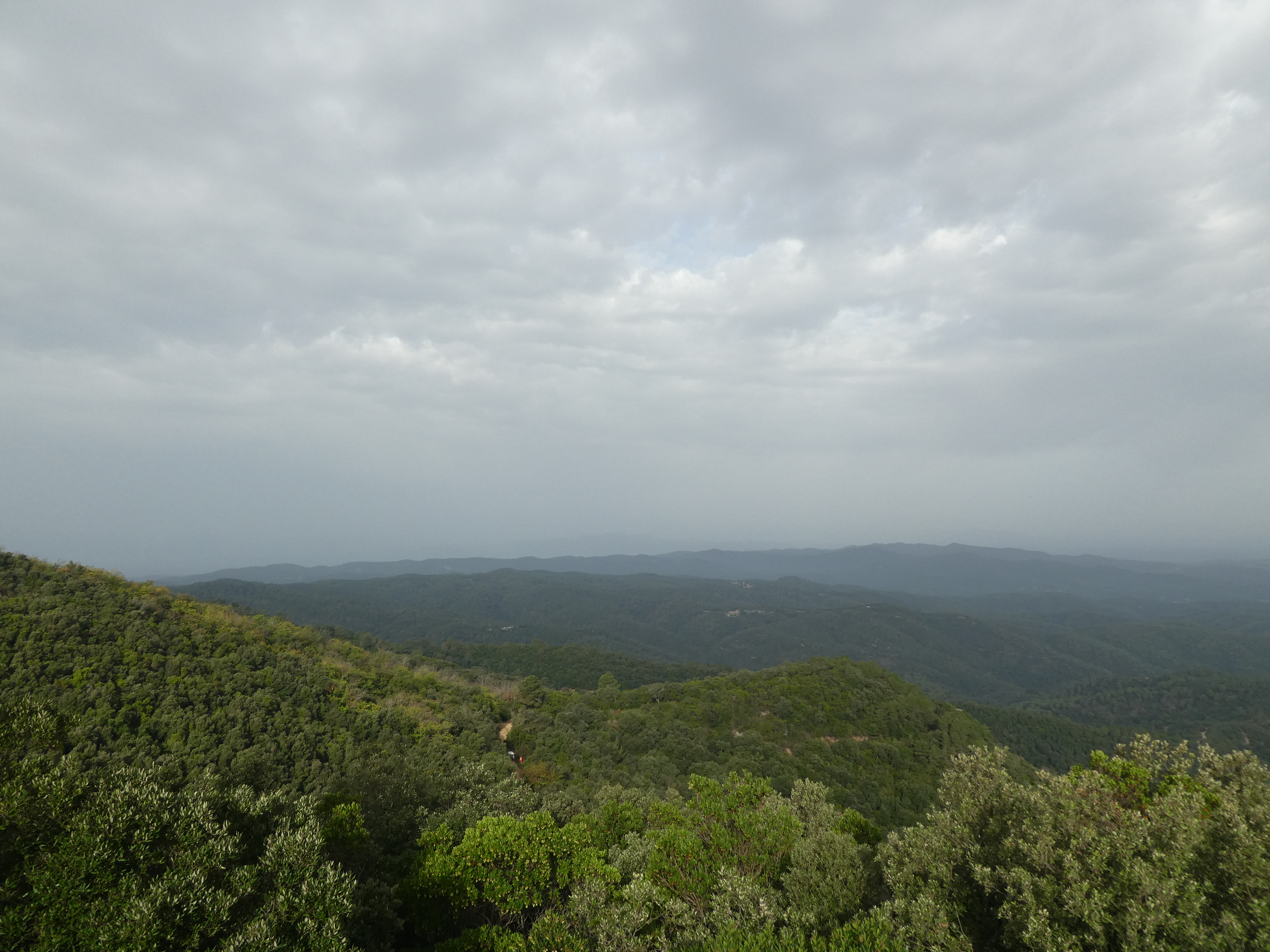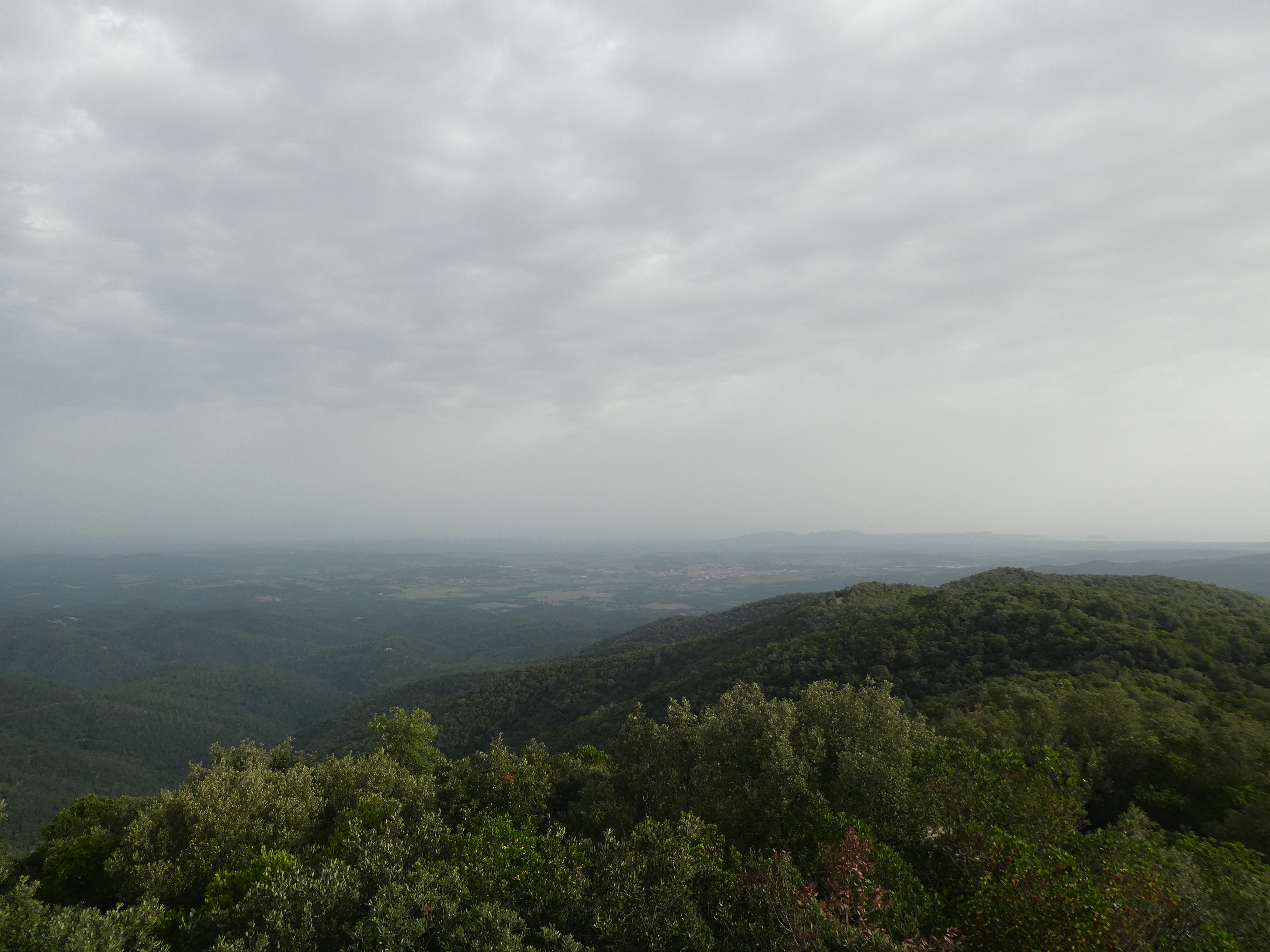 Arrivée au sommet du Puig d'Arques (535 m) : visibilité très réduite aujourd'hui en raison de la présence de sable saharien dans l'atmosphère ... on aperçoit quand même les sommets côtiers de la Costa Brava, des Gavarres, du Montgrí ainsi que la Plaine du Montgrí et la Baie de Roses au loin