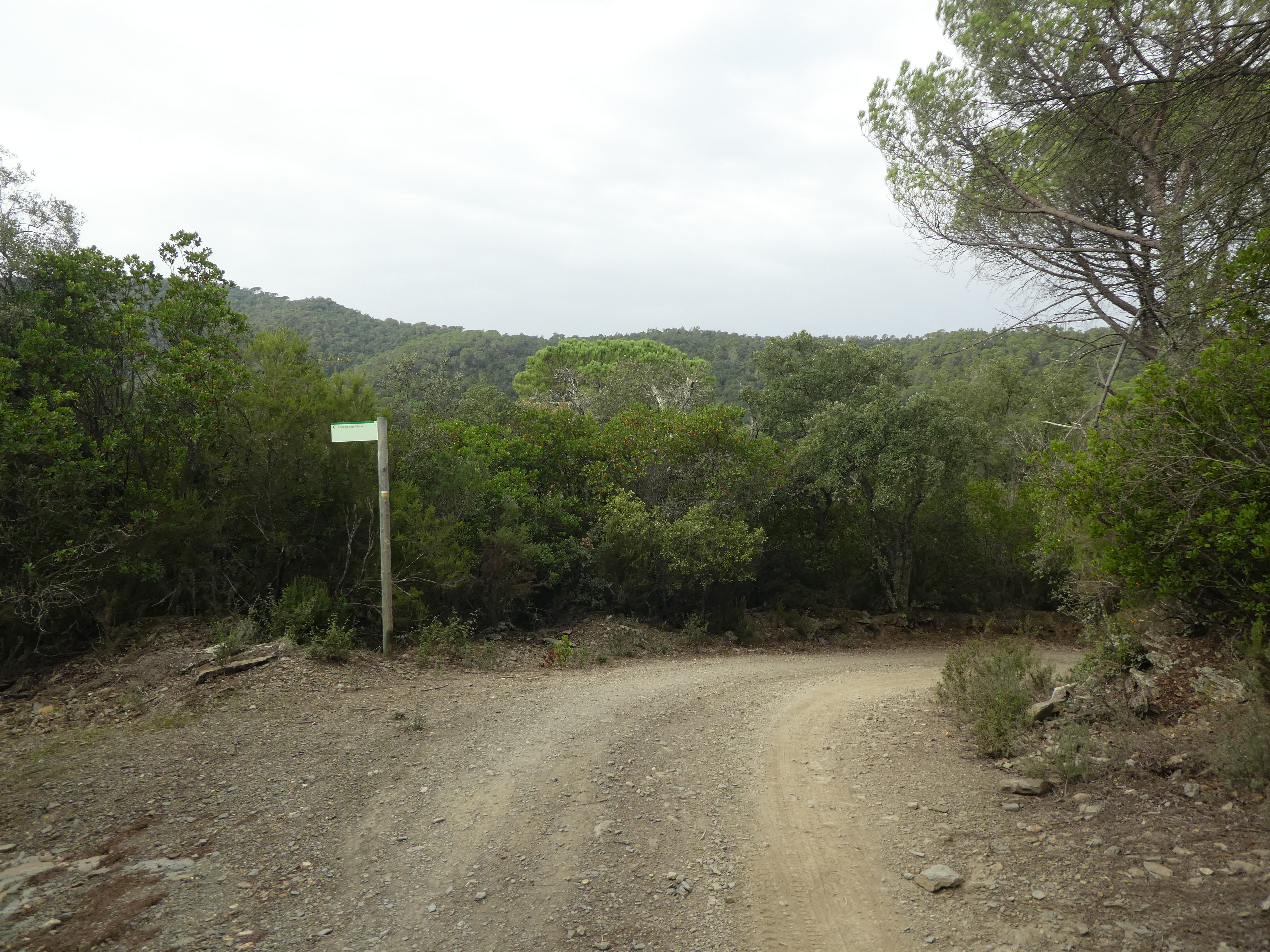 A ce croisement avec le chemin menant à la Font del Mas Mates marqué par la présence d'un panneau directionnel (200 mètres après le lieu-dit "Mas Mates"), suivre le chemin partant sur la droite direction la Bisbal d'Empordà, balisé en jaune et blanc
