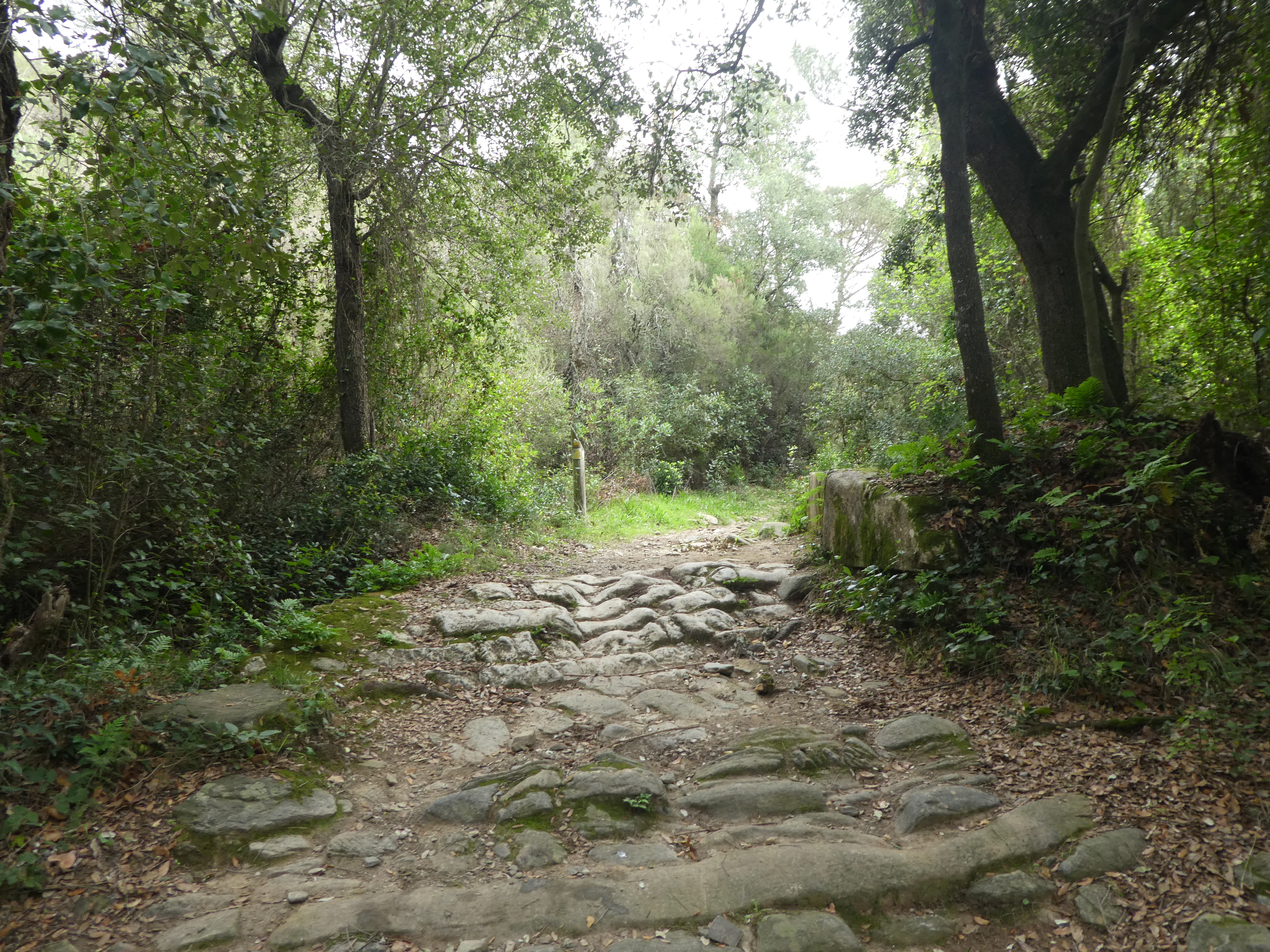 A ce croisement avec le sentier balisé menant au Mas Mates marqué par la présence d'un panneau d'informations sur la Castanyeda d'en Genoer (300 mètres après le précédent), suivre ce dernier sur la gauche direction la Bisbal d'Empordà, balisé en jaune et blanc dorénavant