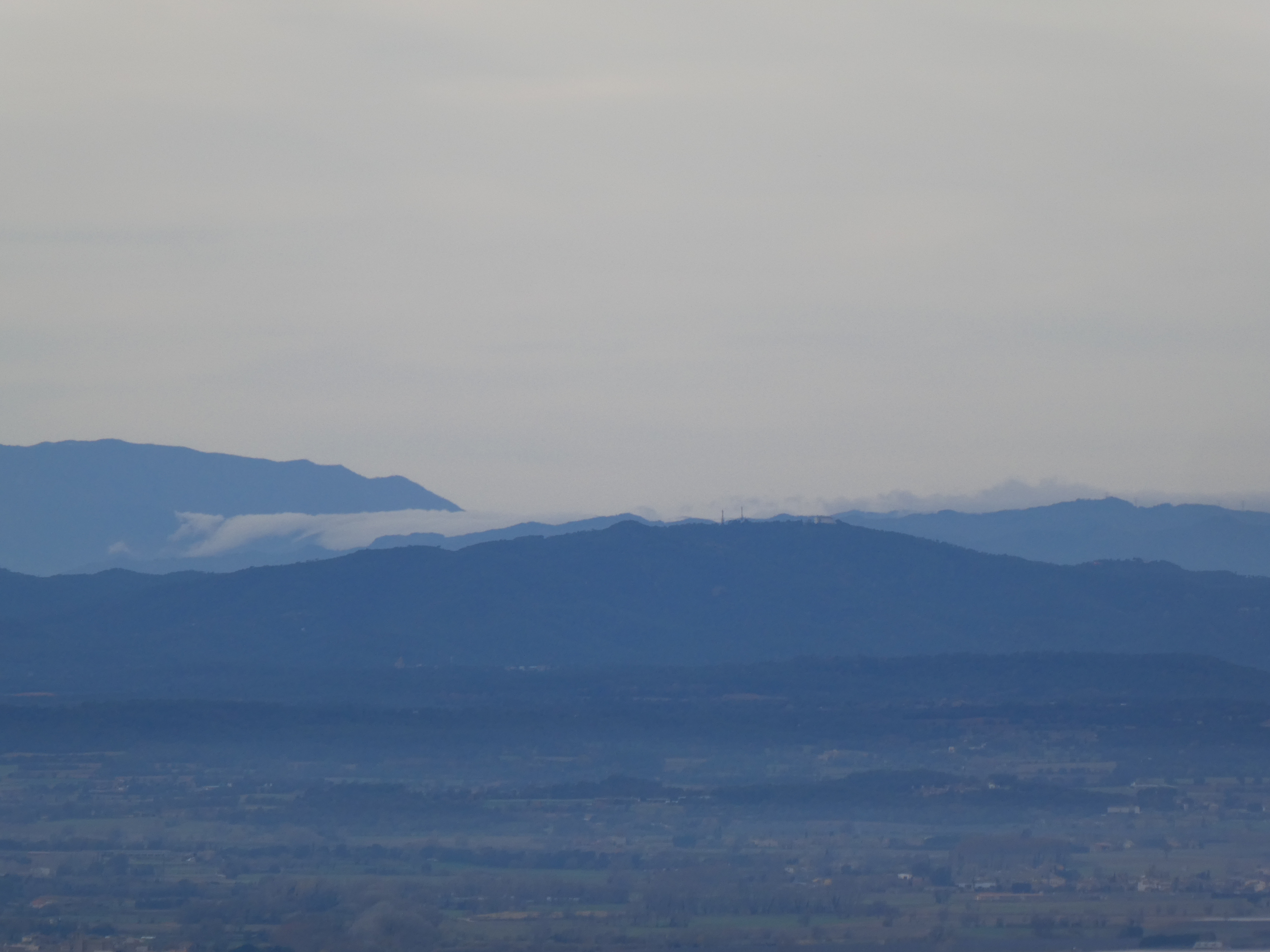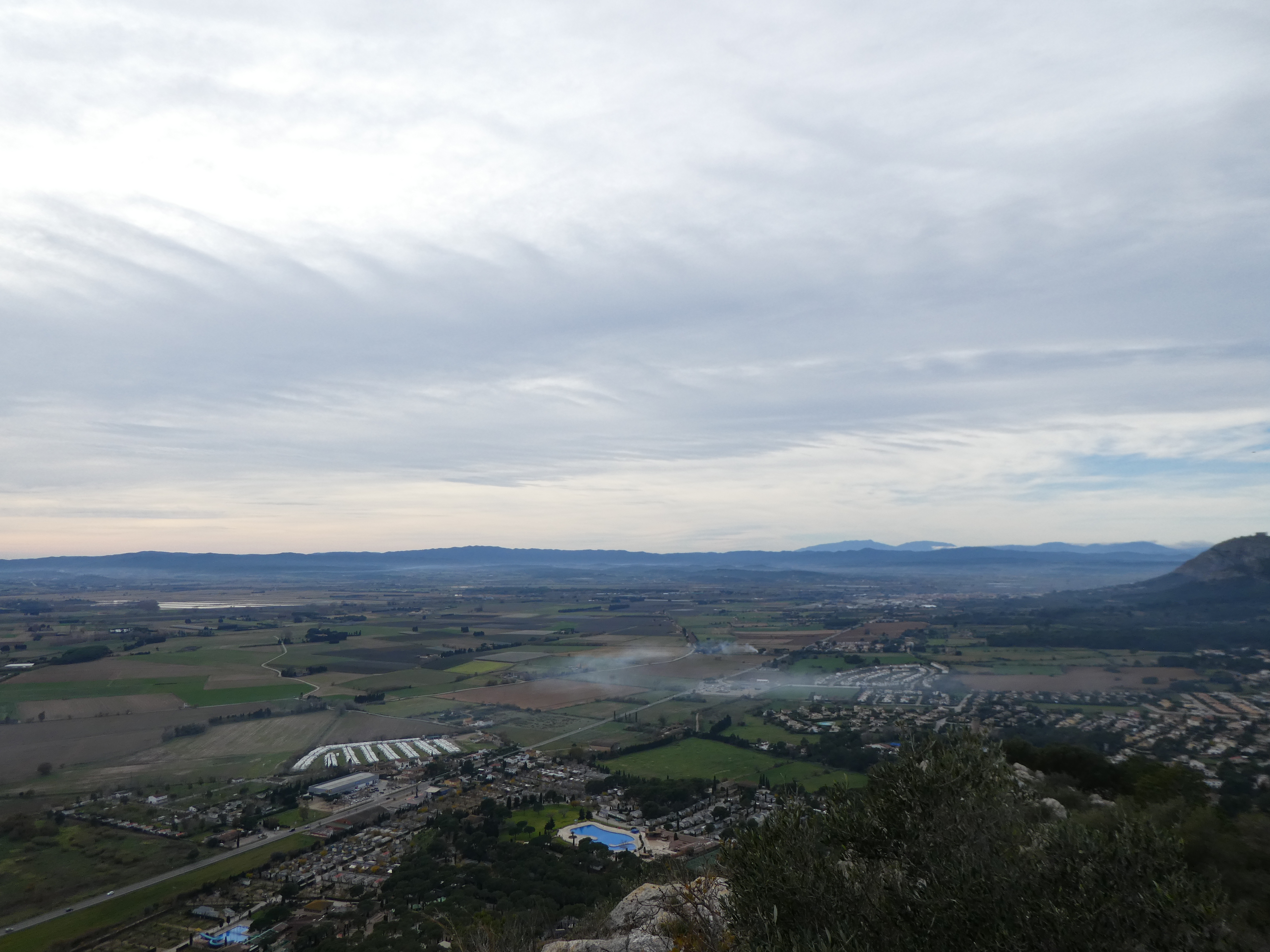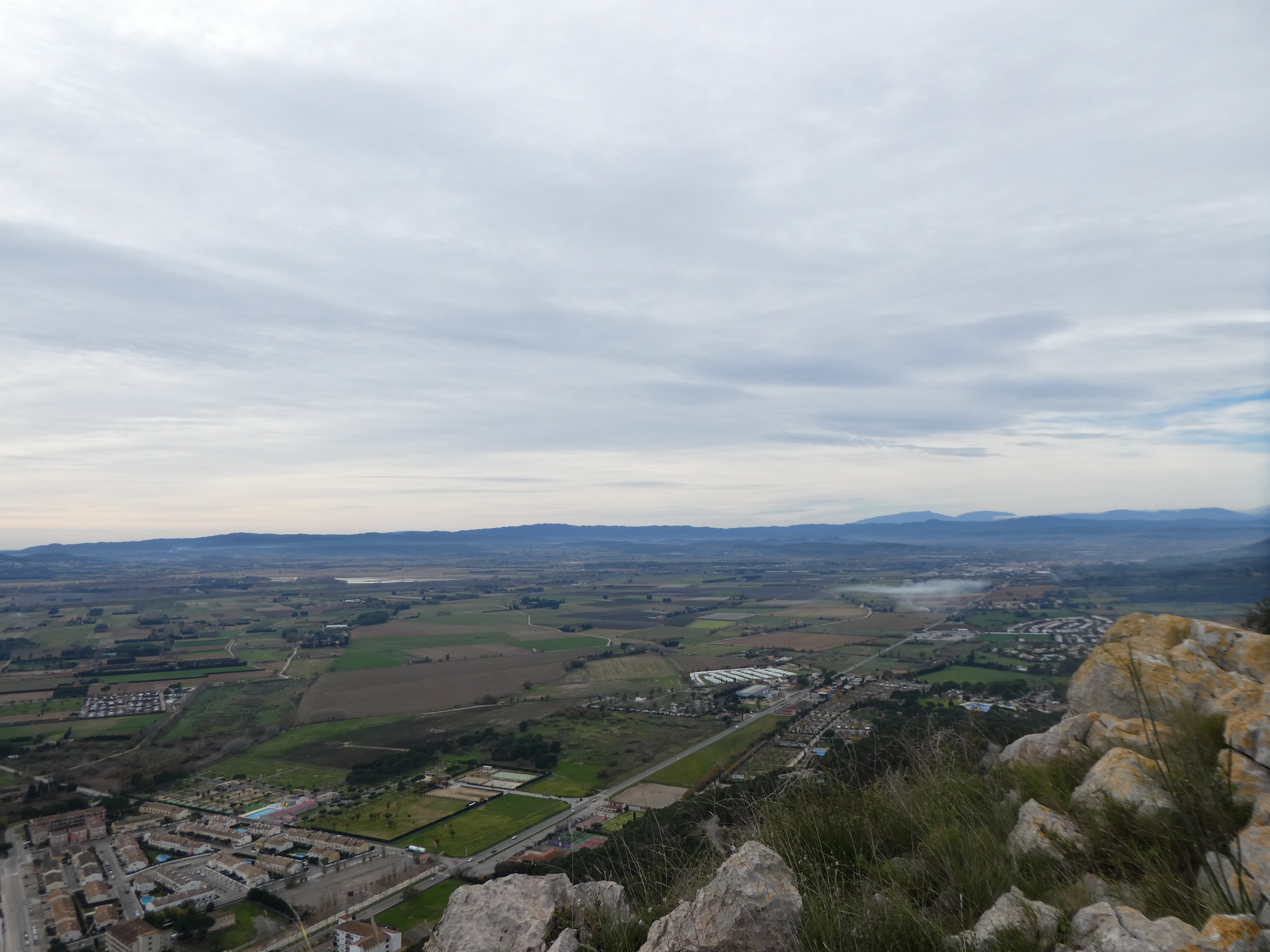 Arrivée au sommet de la Roca Maura (225 m) : beau panorama malgré le ciel couvert sur les sommets de l'Empordà, de la Selva, du Ripollès, de la Garrotxa, du Haut-Vallespir, des Albères ainsi que sur la plaine de l'Empordà et du Ter