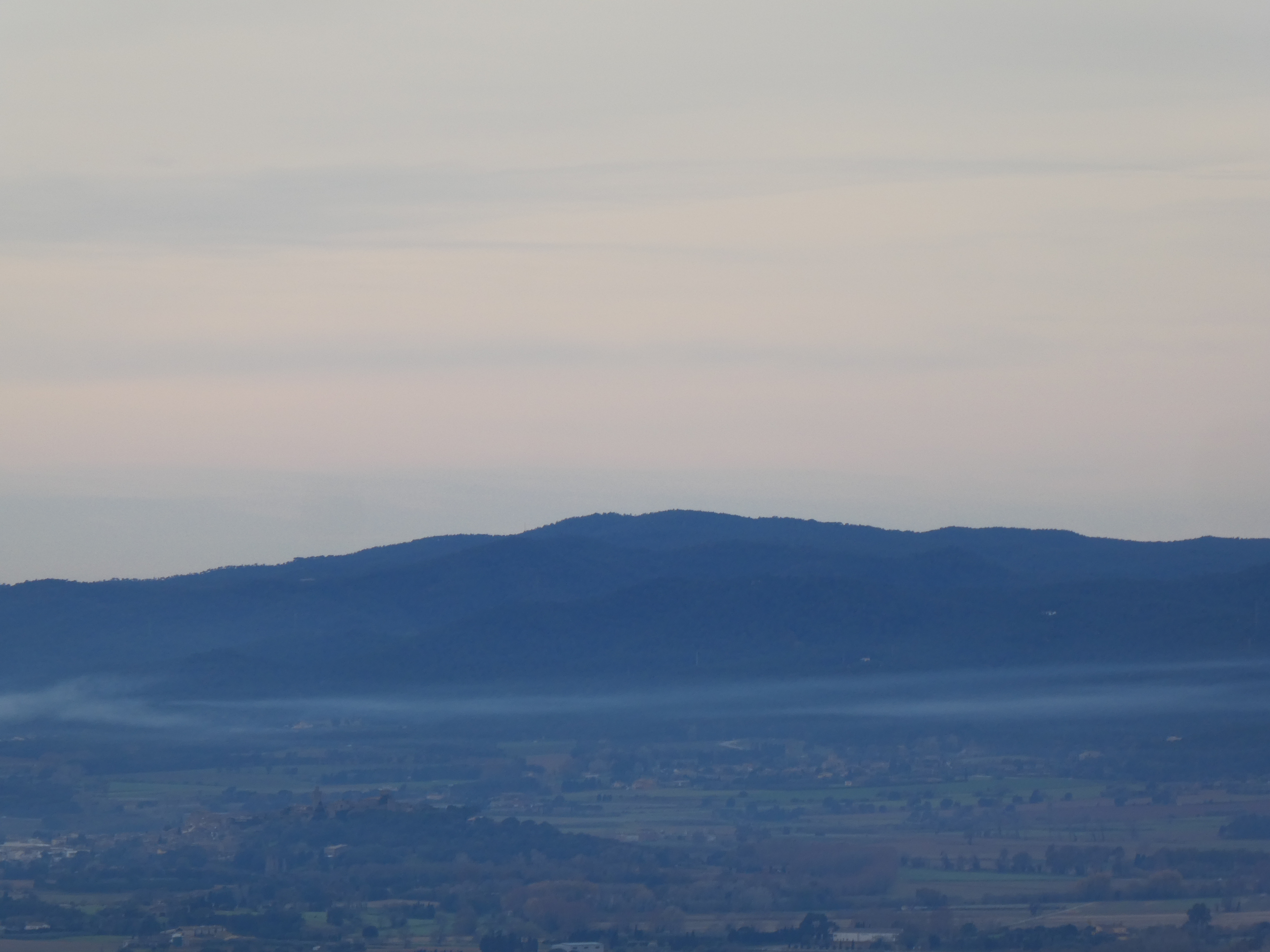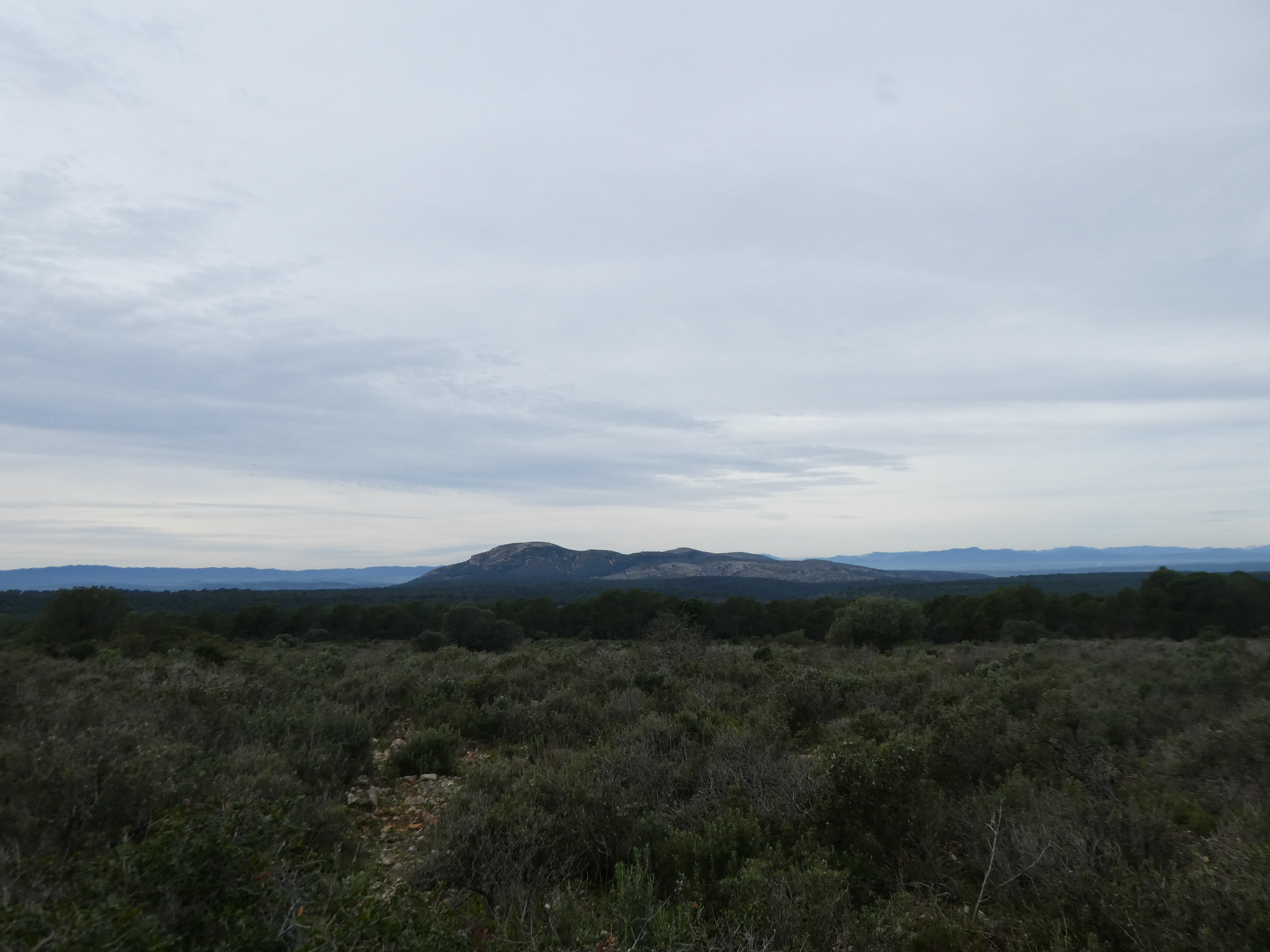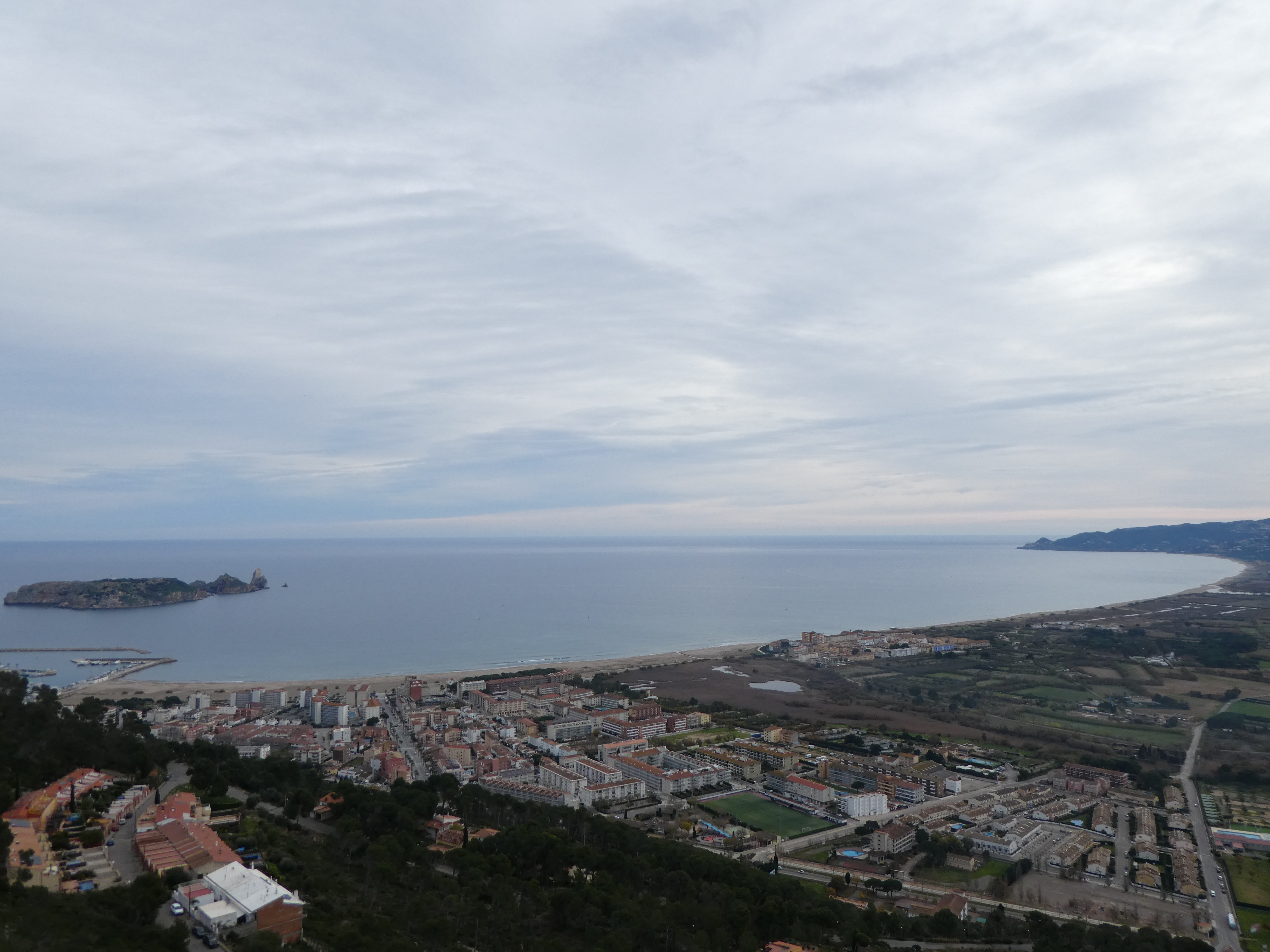 Arrivée au sommet de la Roca Maura (225 m) : beau panorama malgré le ciel couvert sur les sommets de l'Empordà, de la Selva, du Ripollès, de la Garrotxa, du Haut-Vallespir, des Albères ainsi que sur la plaine de l'Empordà et du Ter