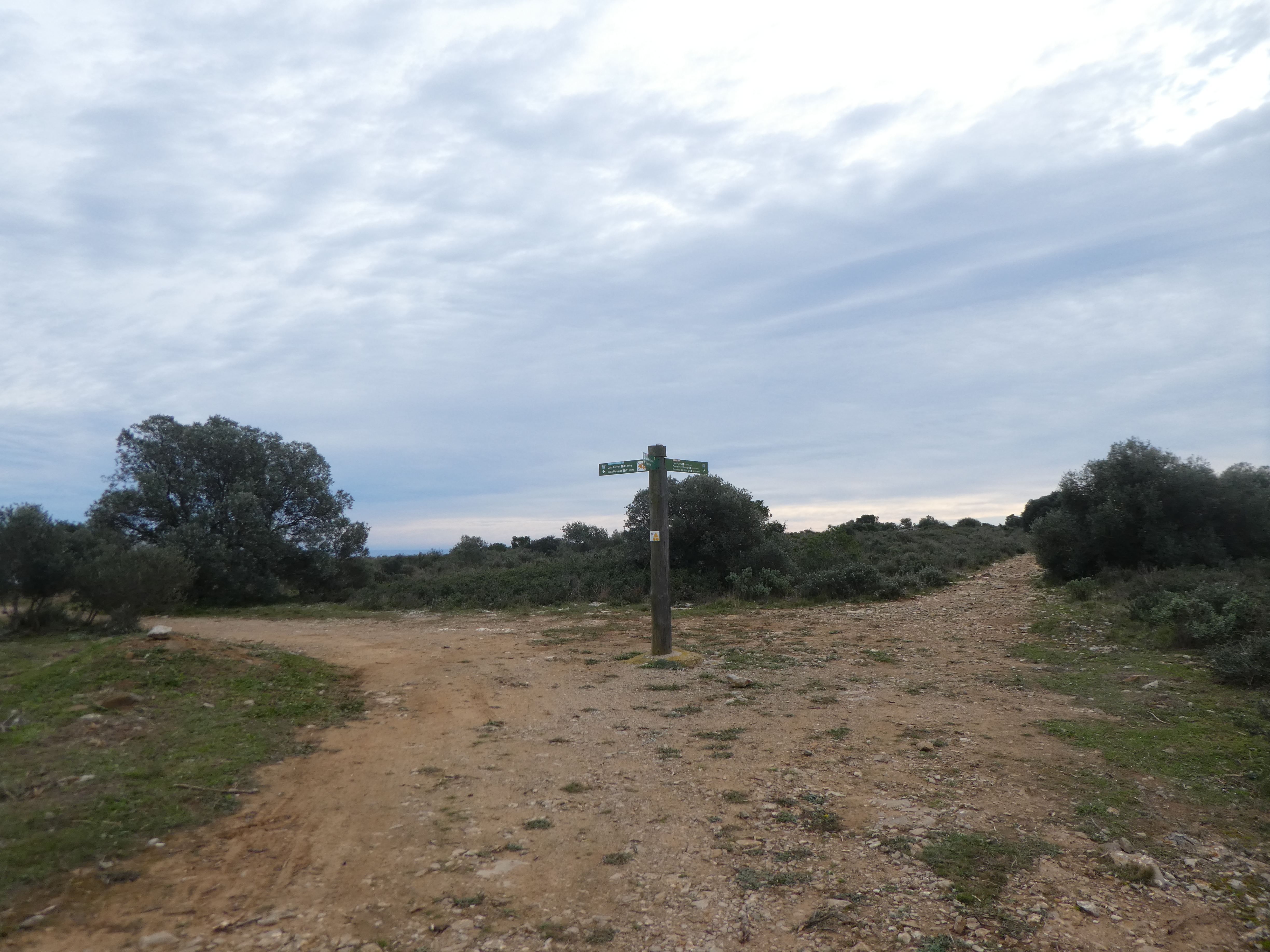 A ce croisement avec l'itinéaire balisé en vert et blanc venant de l'Estartit marqué par la présence d'un panneau directionnel (600 mètres après le précédent), suivre ce dernier partant sur la droite direction Cala Pedrosa, balisé en vert et blanc, et en points bleus et verts dorénavant (ceux qui auraient suivi l'itinéraire de montée vers la Cala Pedrosa depuis l'Estartit sans passer par la Cala Calella et le Port del Falaguer devraient se retrouver ici)