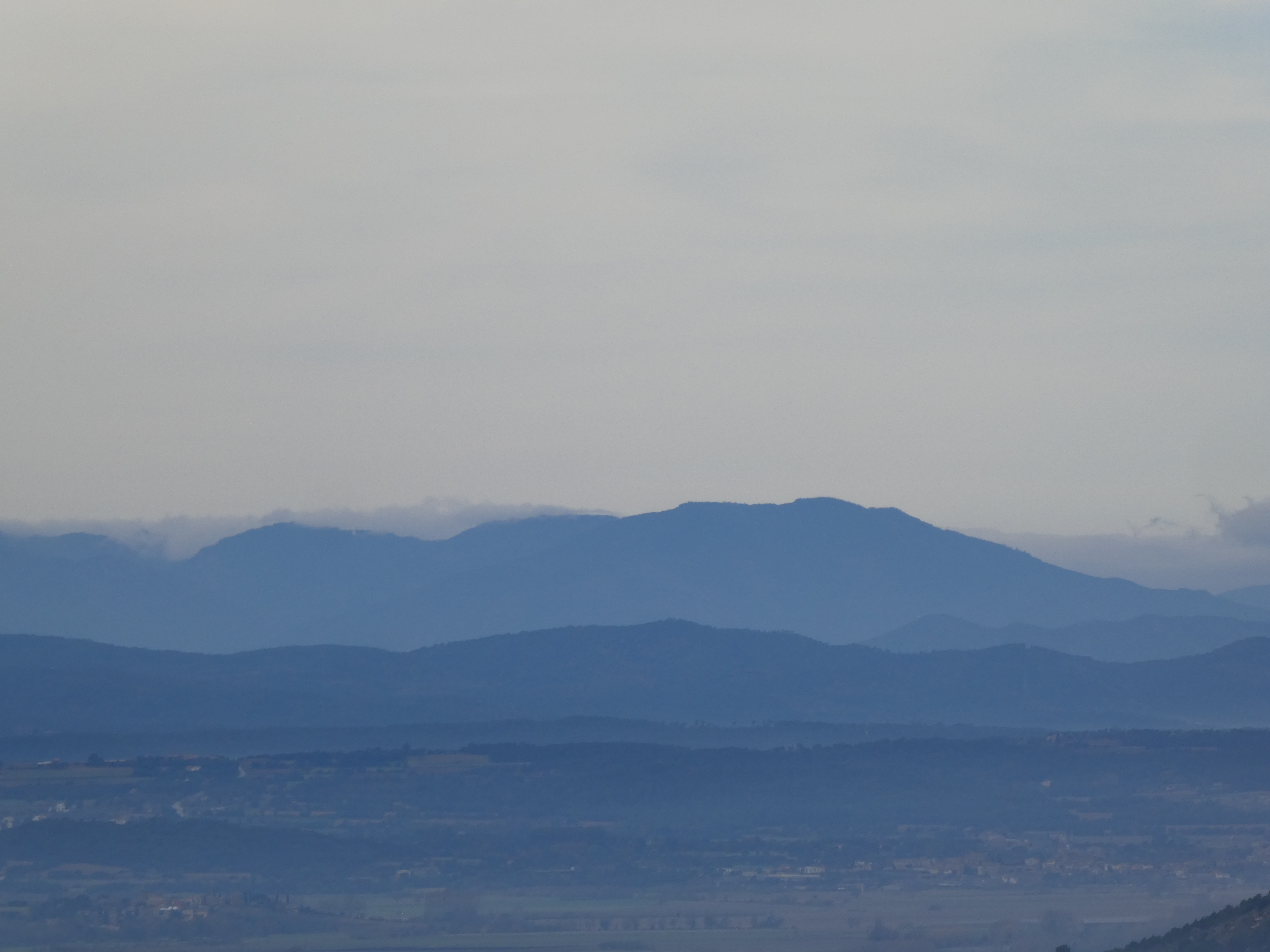 Zoom sur le Golany (877 m) au centre-gauche et le Puigsacalm (1514 m) au centre-droit