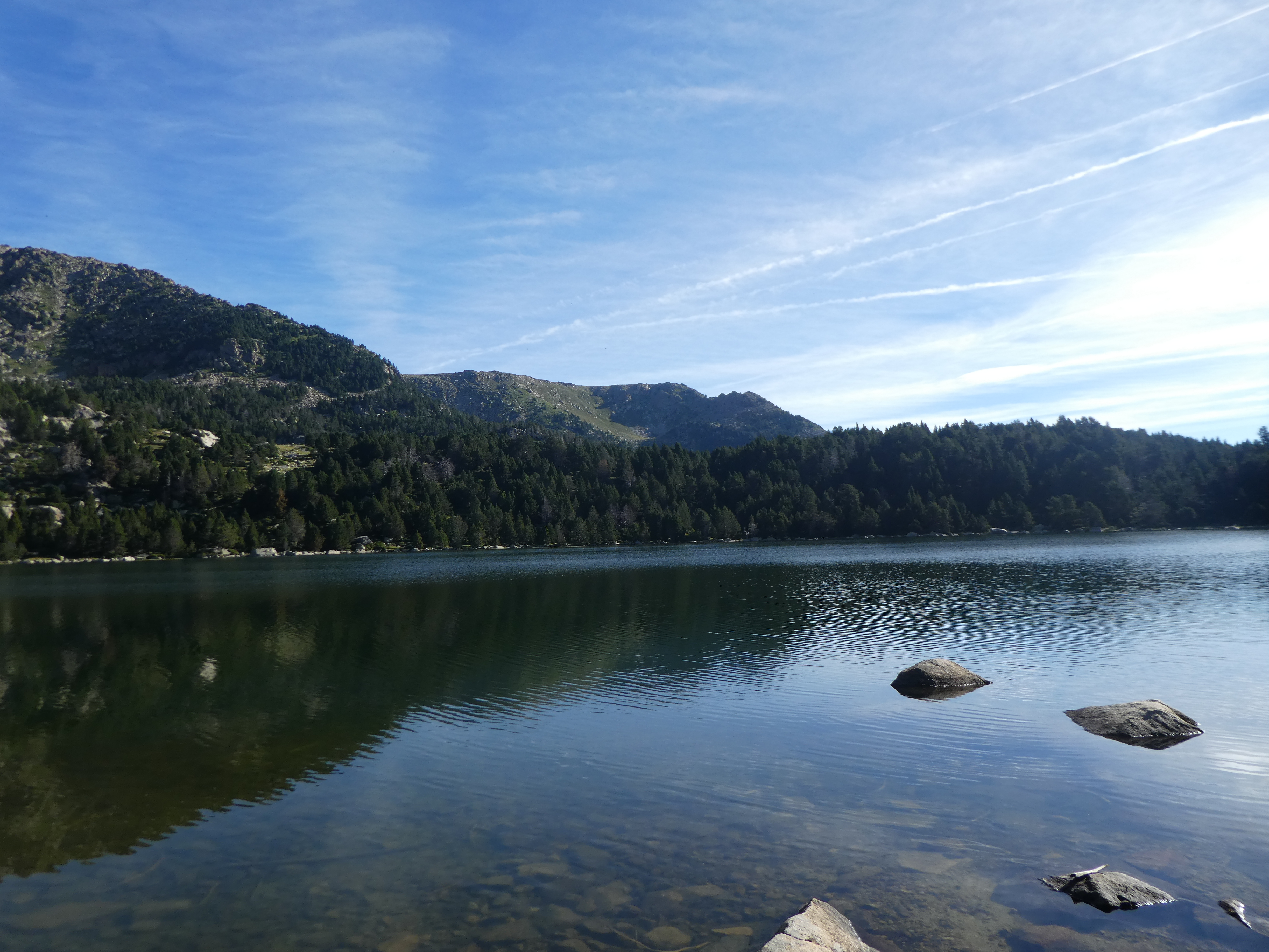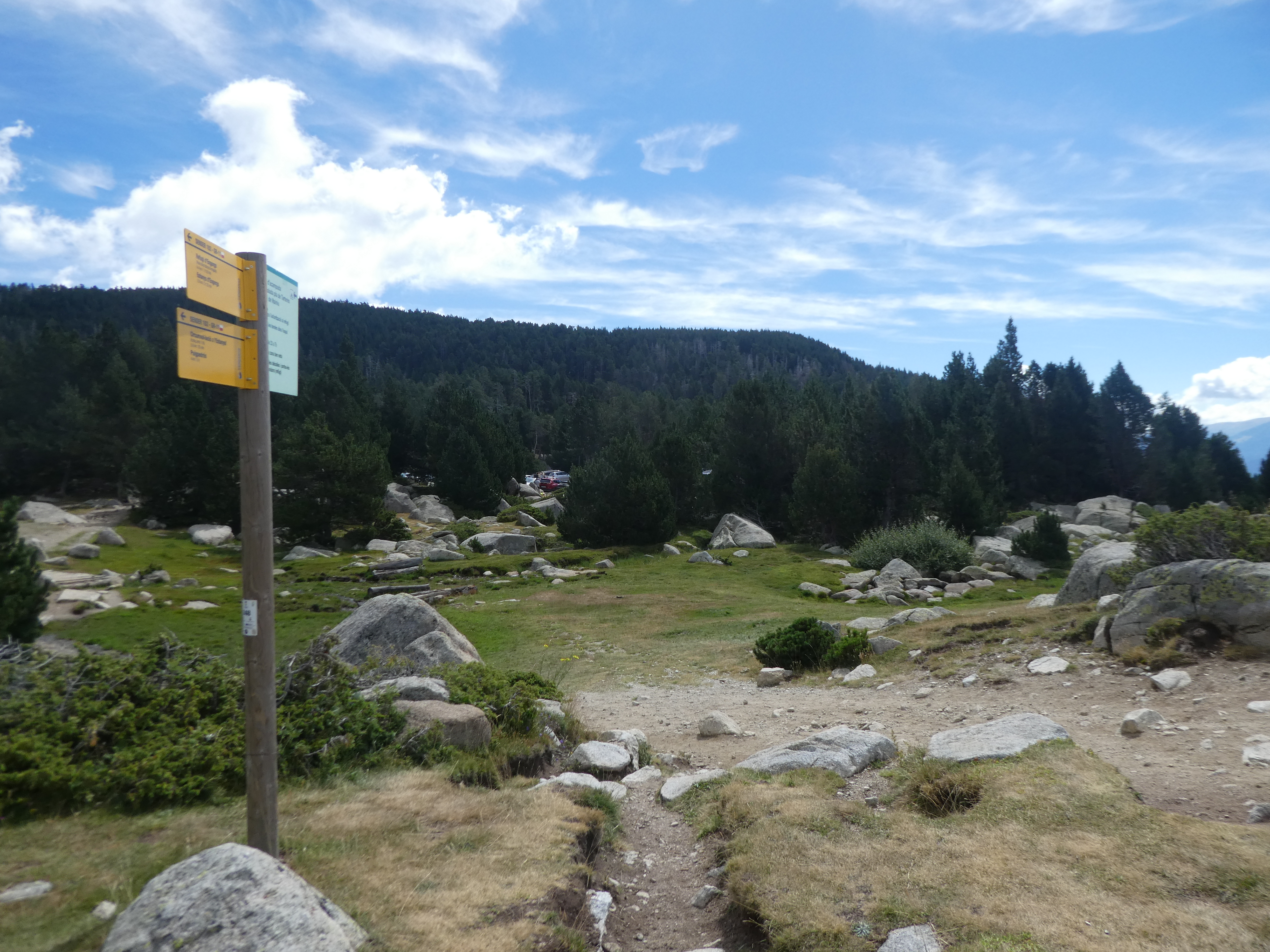Estany Sec (2140 m) : suivre le GR11 partant tout droit direction Refugi de Malniu, balisé en rouge et blanc