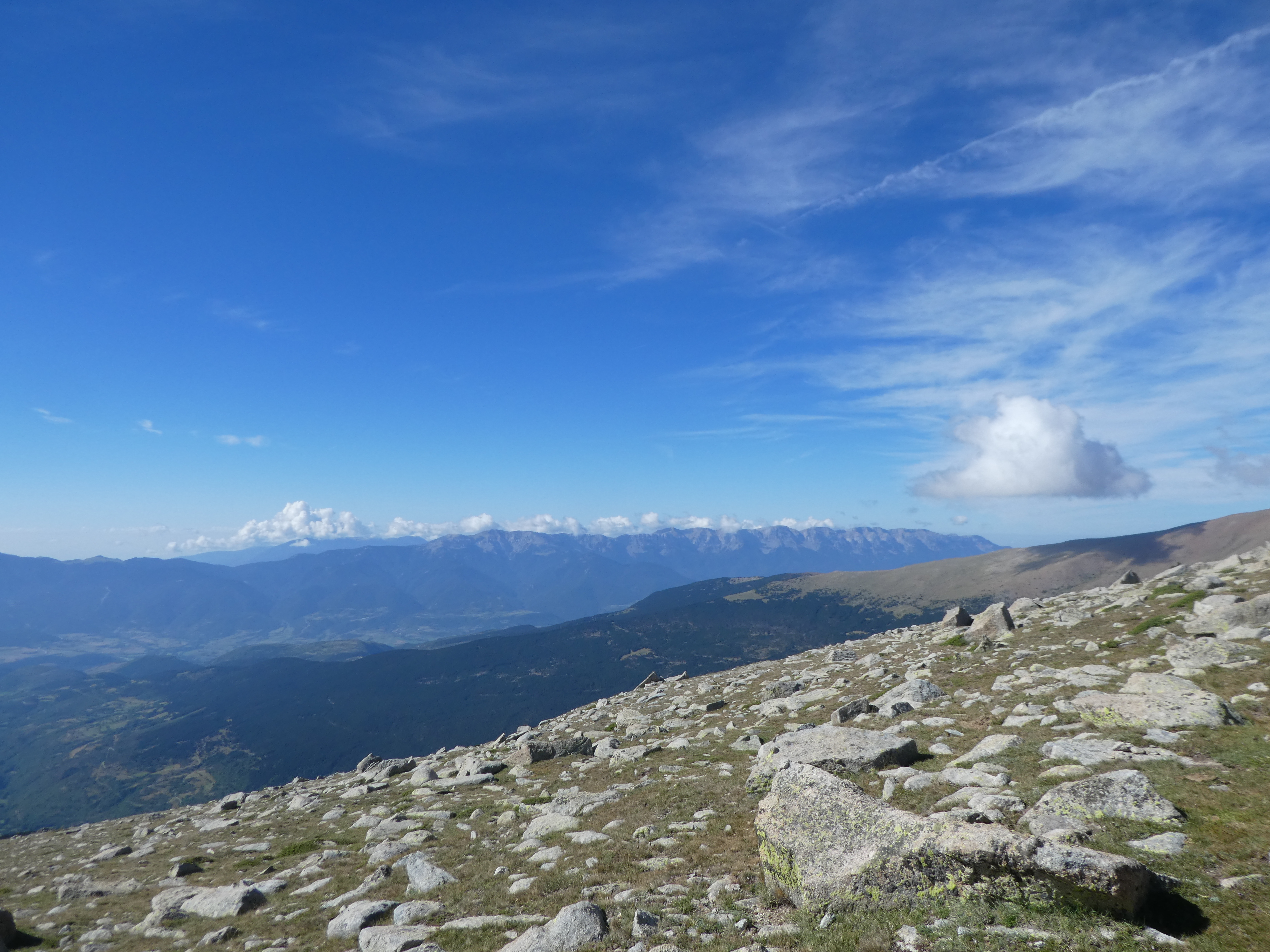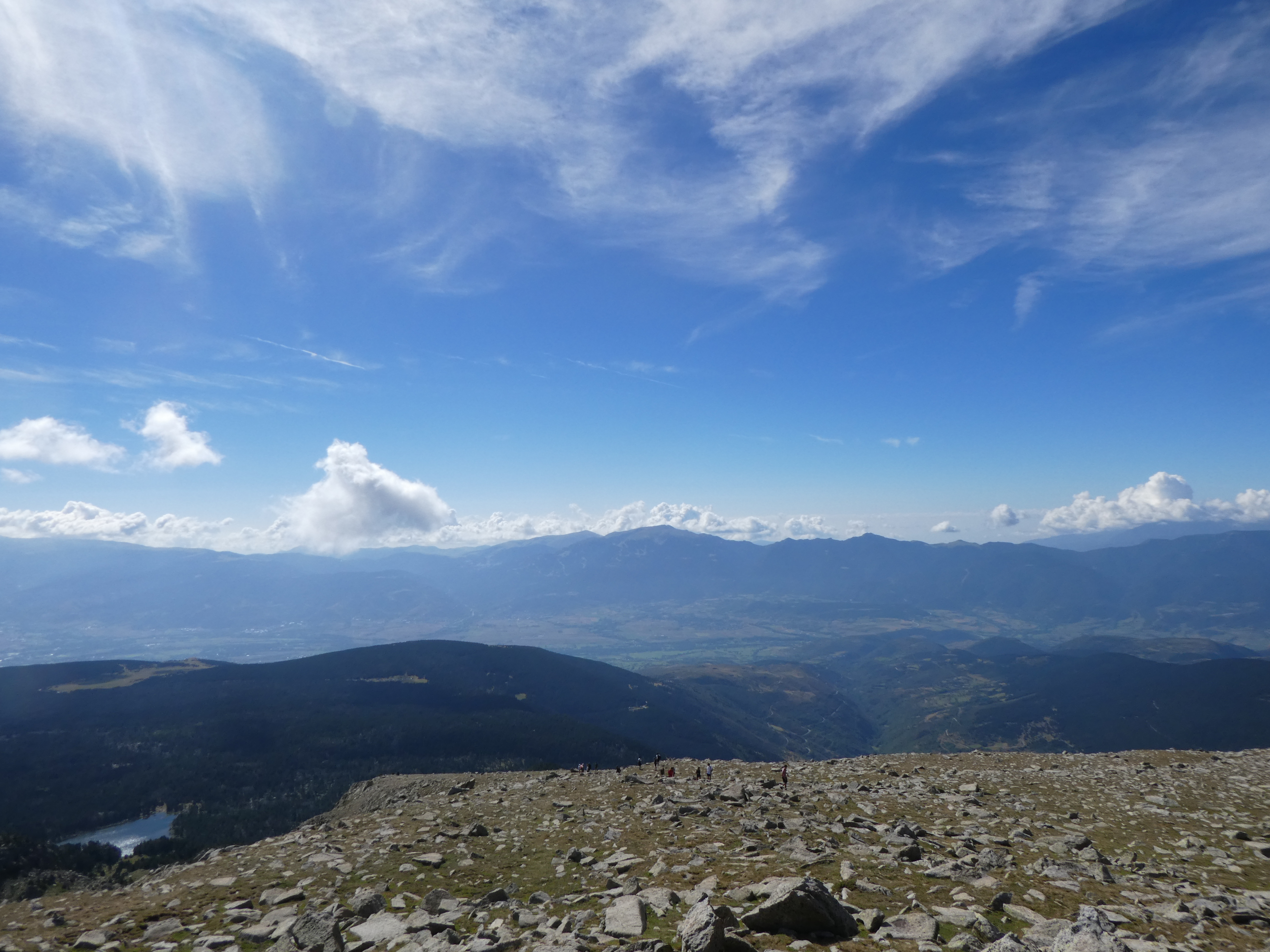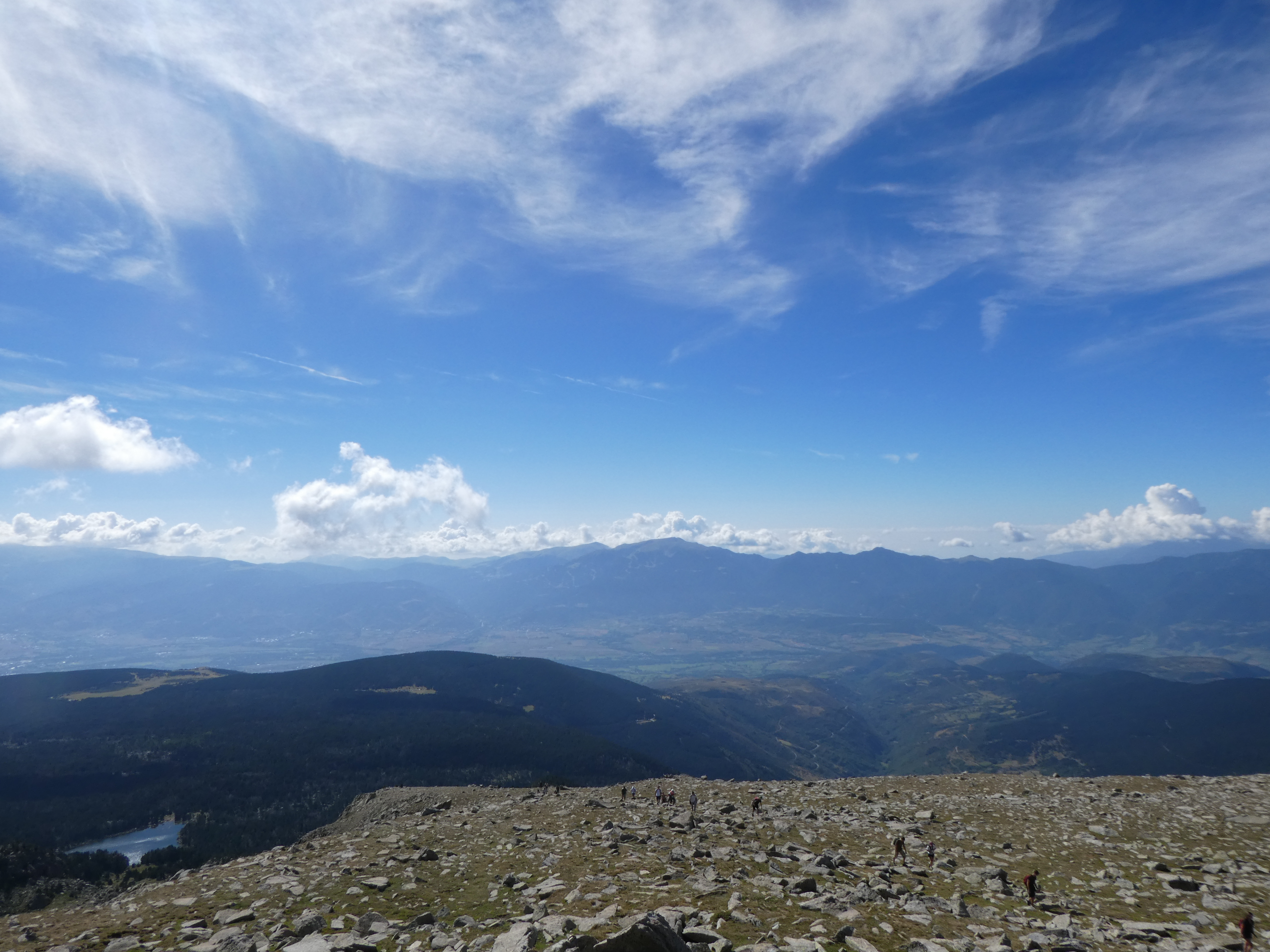 Arrivée au sommet du Pic de les Molleres del Puigpedrós (2739 m) : beau panorama sur les sommets de la Cerdanya, de la Haute-Cerdagne, du Conflent, de la Serra del Cadí-Moixeró ainsi que sur la Vall del Segre