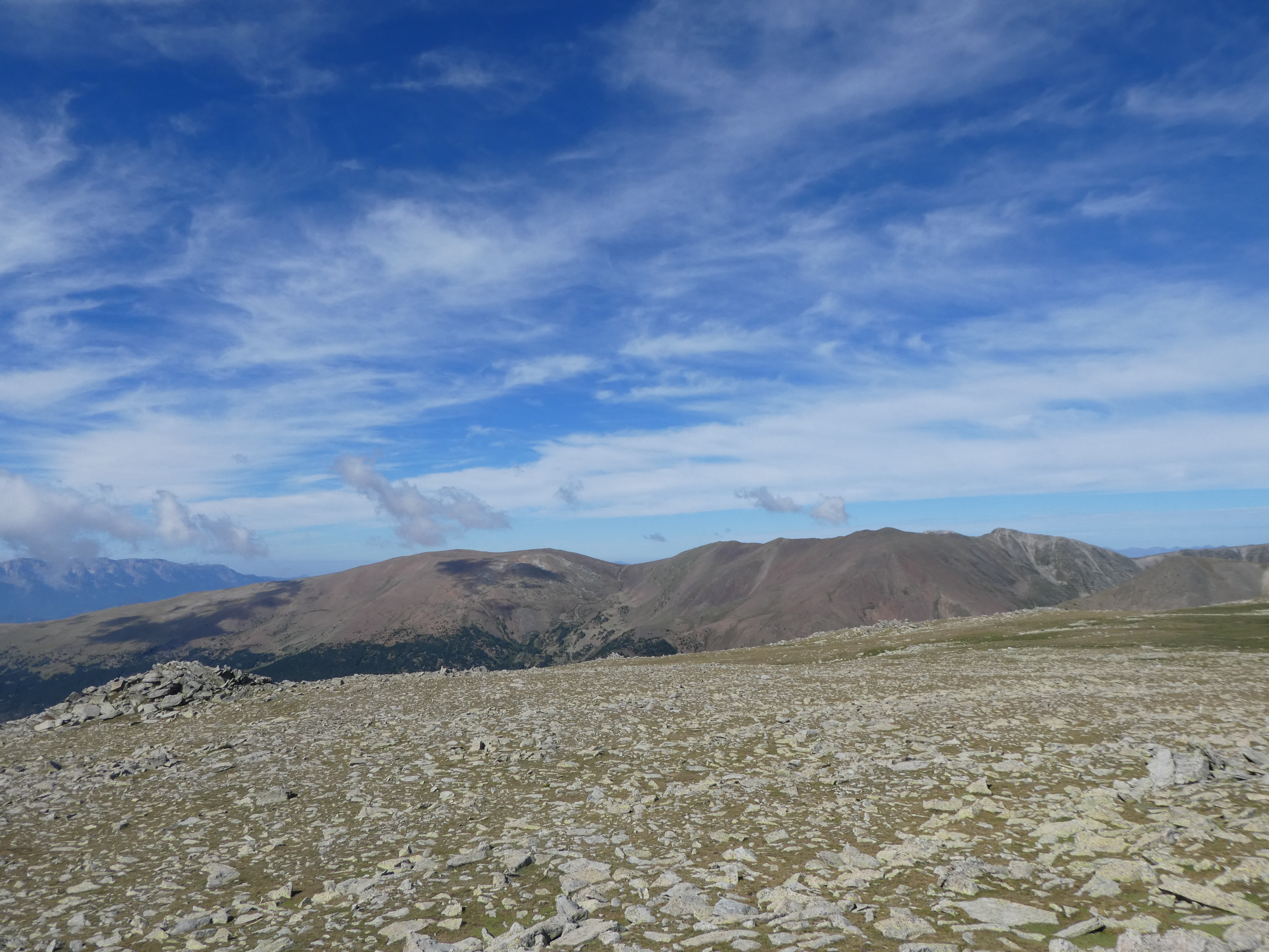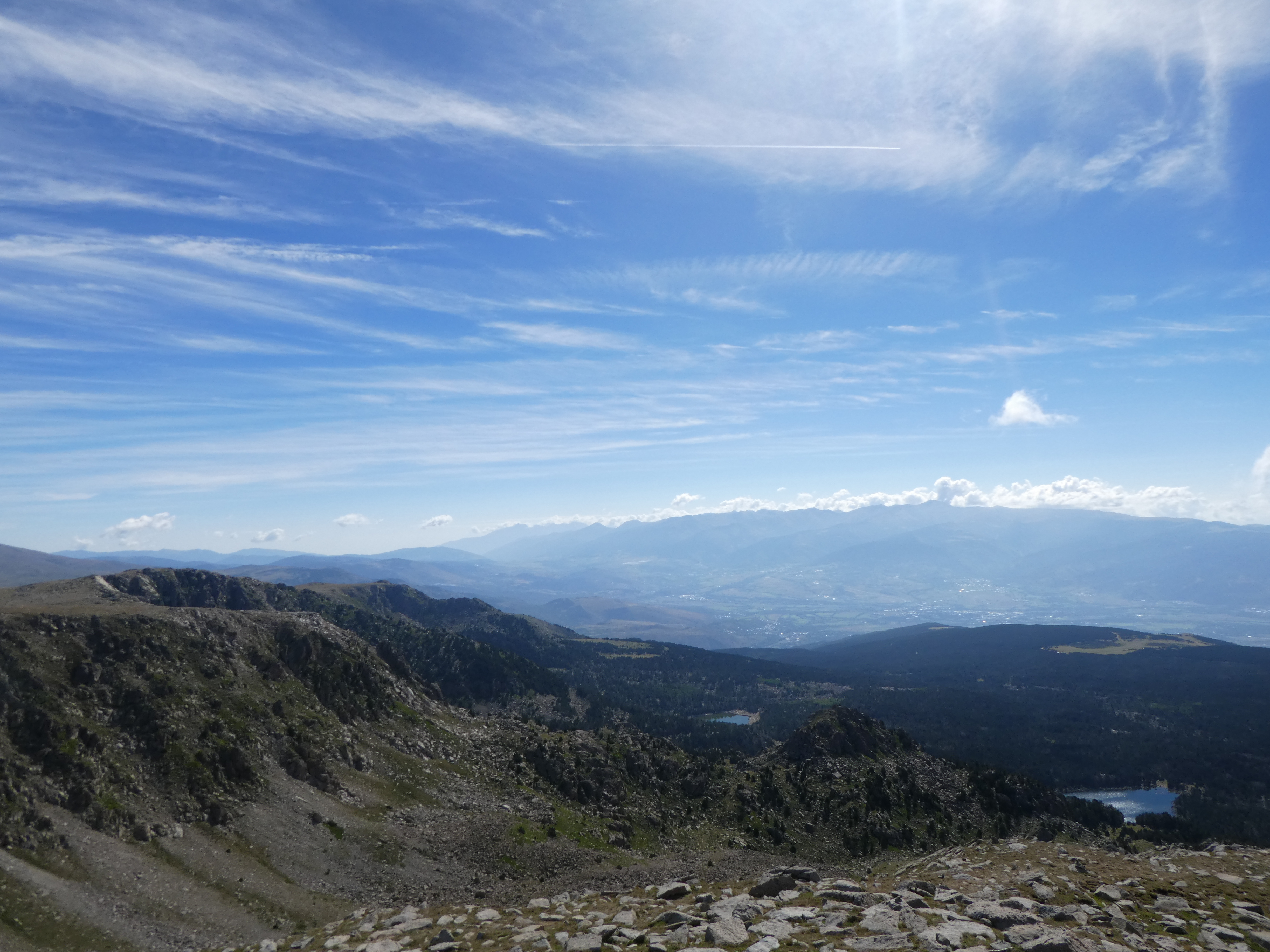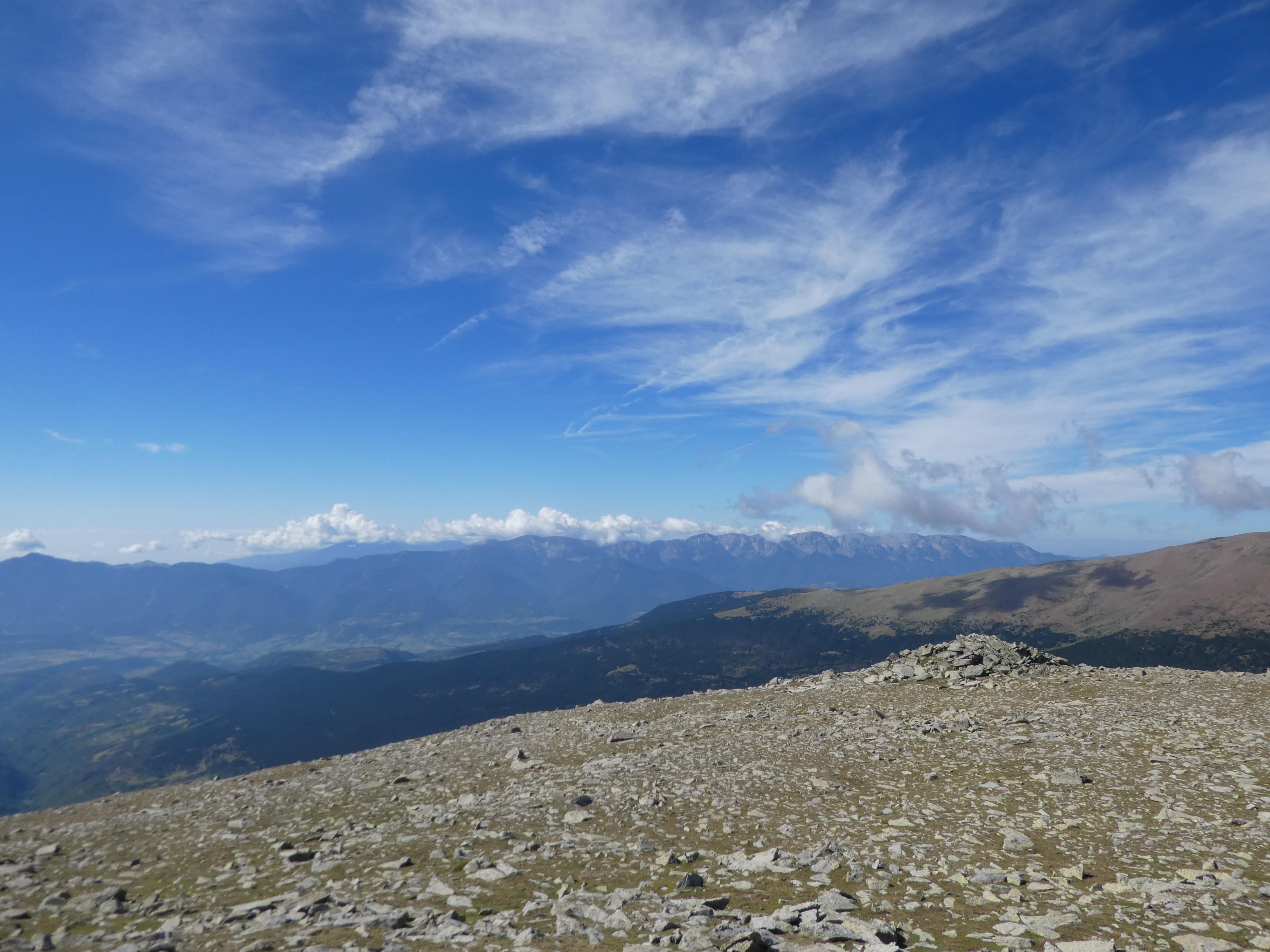 Arrivée au sommet du Pic de les Molleres del Puigpedrós (2739 m) : beau panorama sur les sommets de la Cerdanya, de la Haute-Cerdagne, du Conflent, de la Serra del Cadí-Moixeró ainsi que sur la Vall del Segre