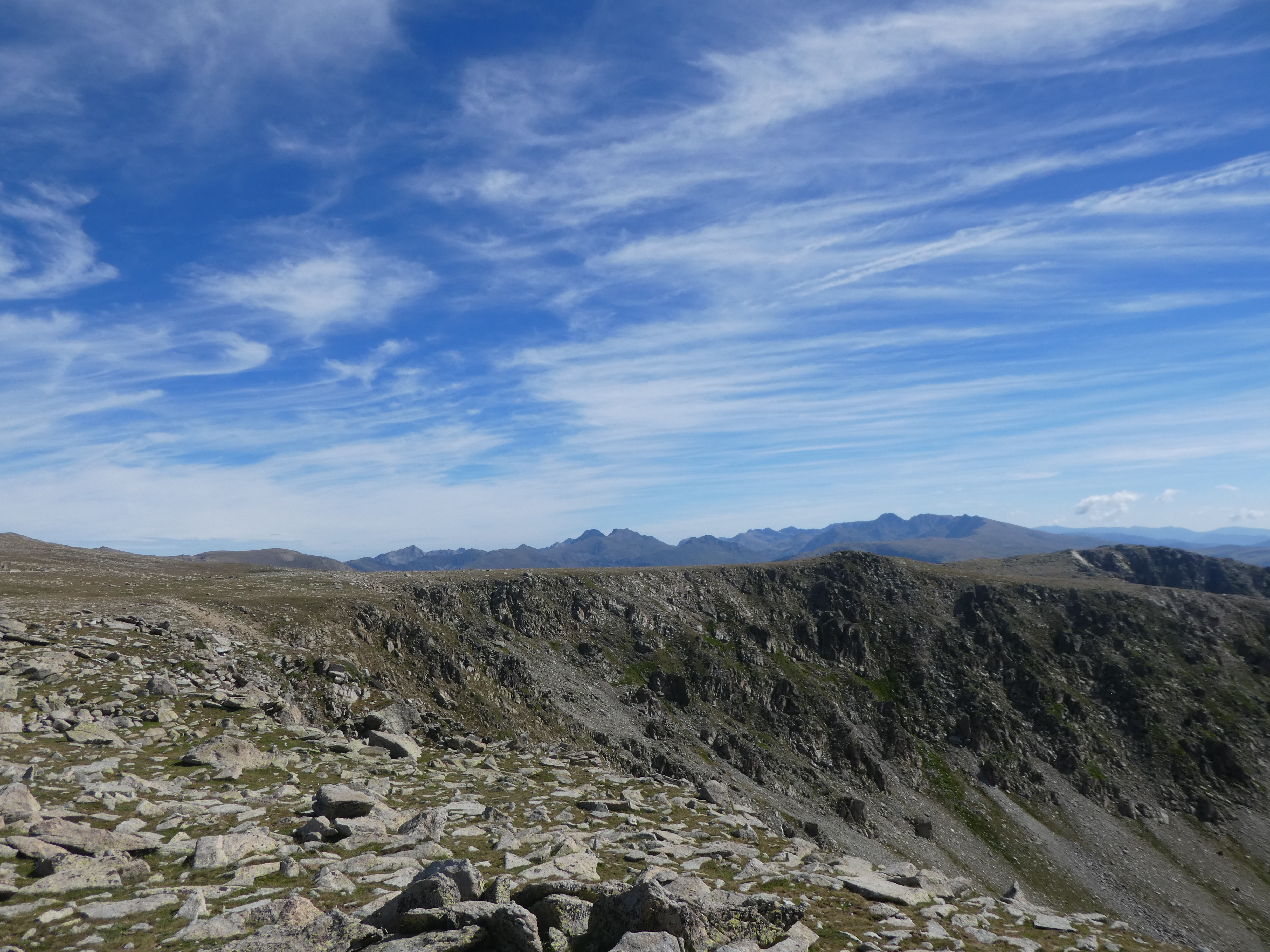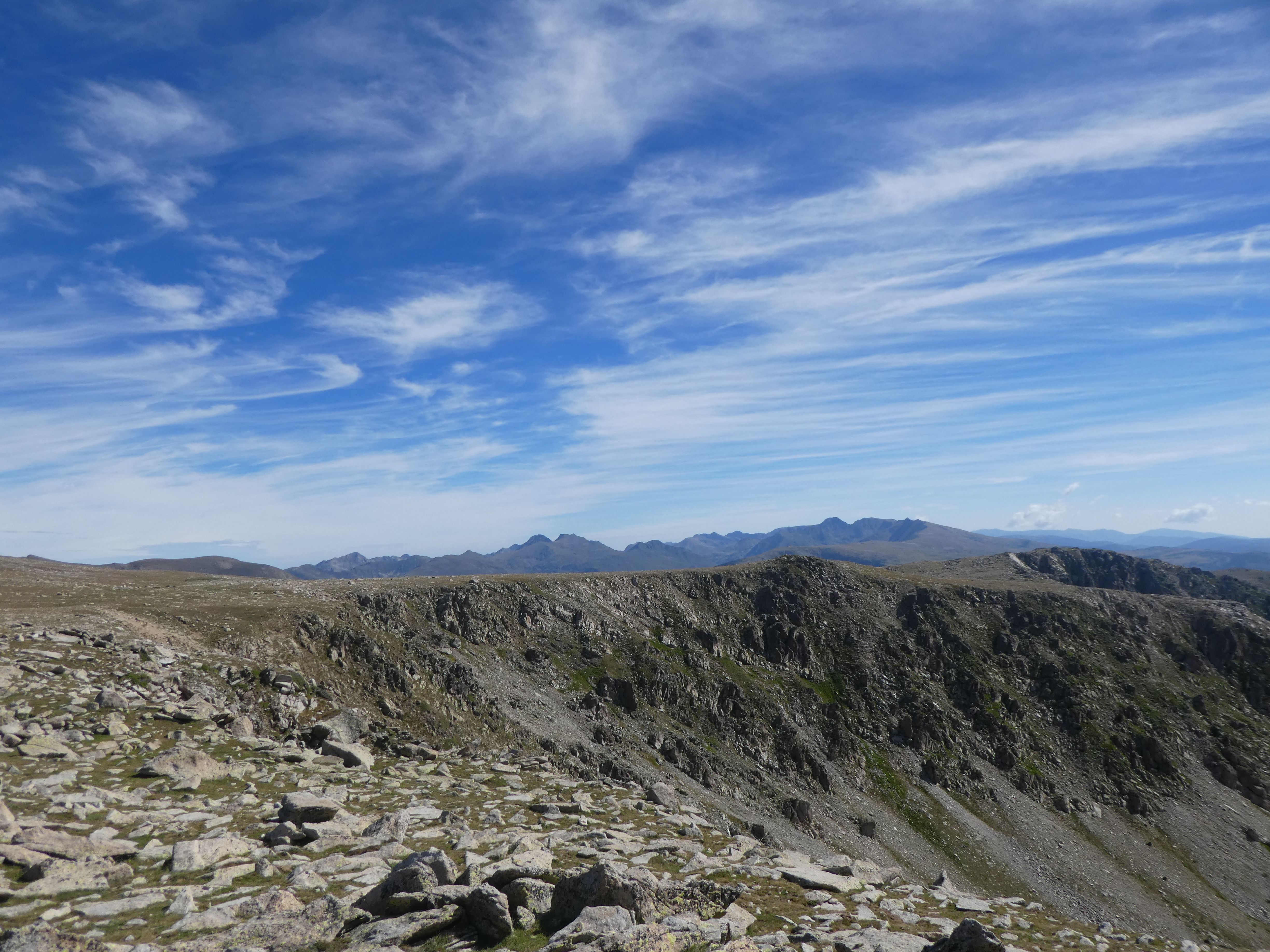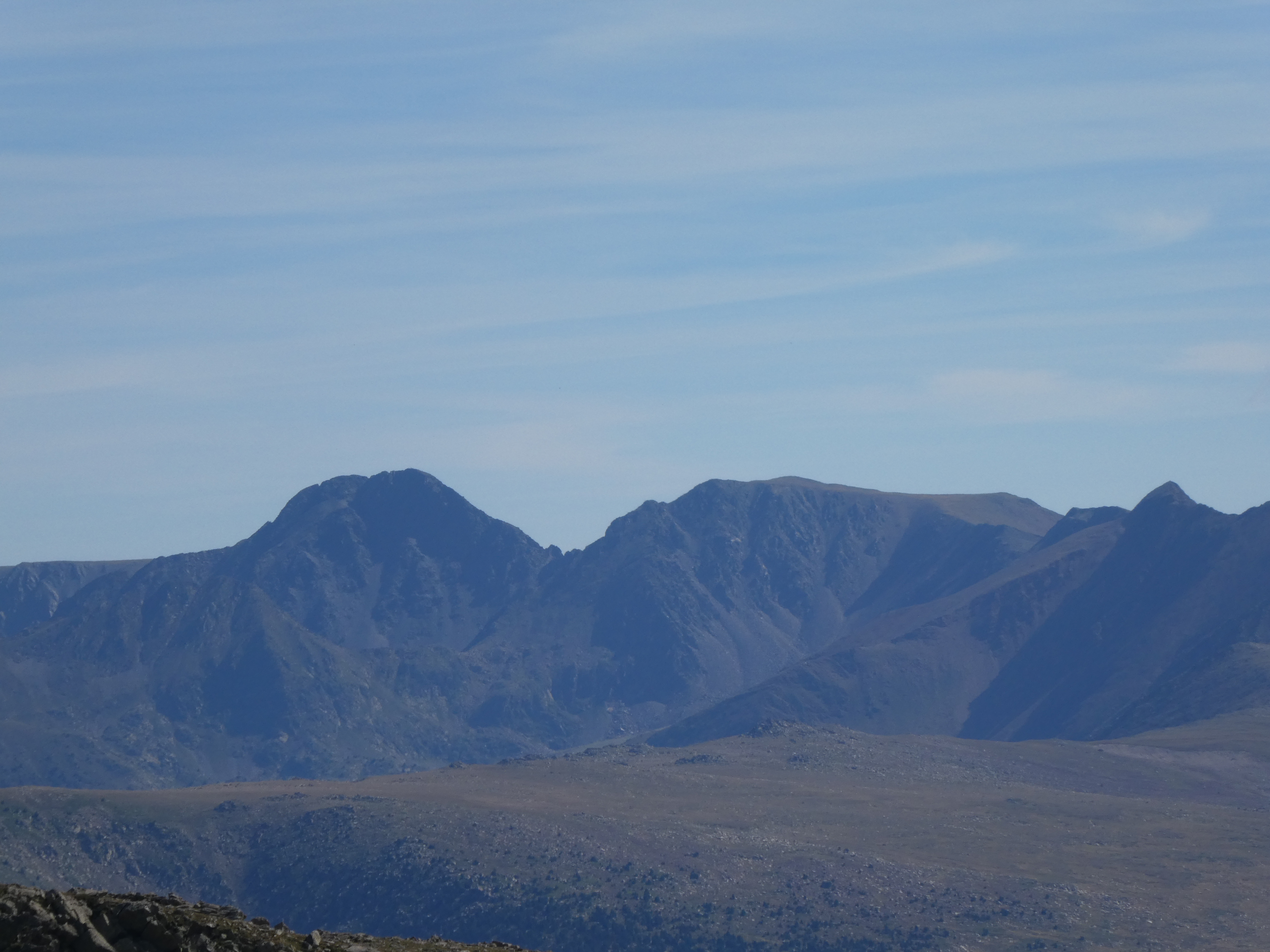 Zoom sur le Puig de la Grava (2671 m) à gauche, le Puig de la Cometa d'Espagne (2763 m) au centre-gauche et le Puig de la Portella Gran (2765 m) à droite