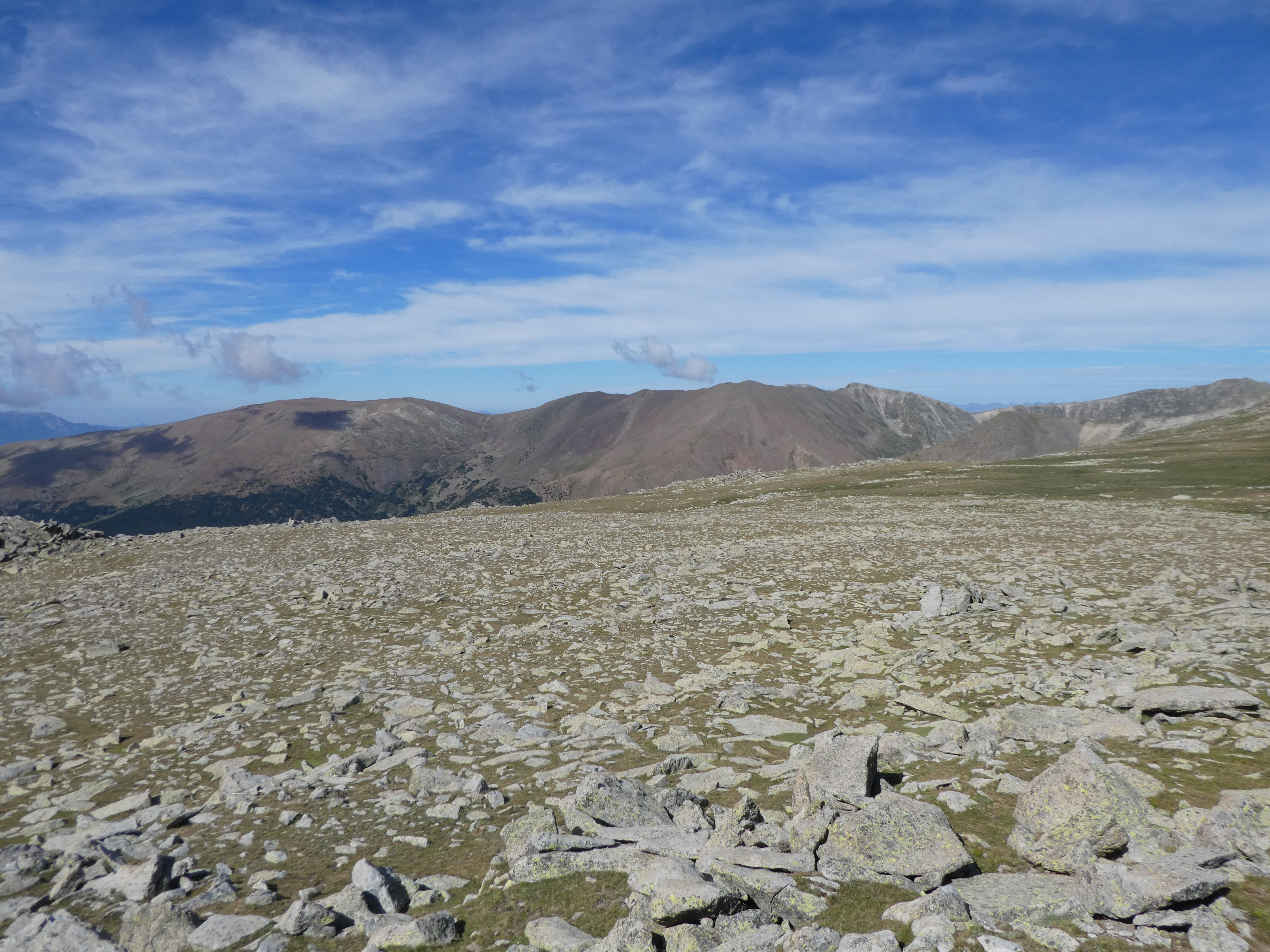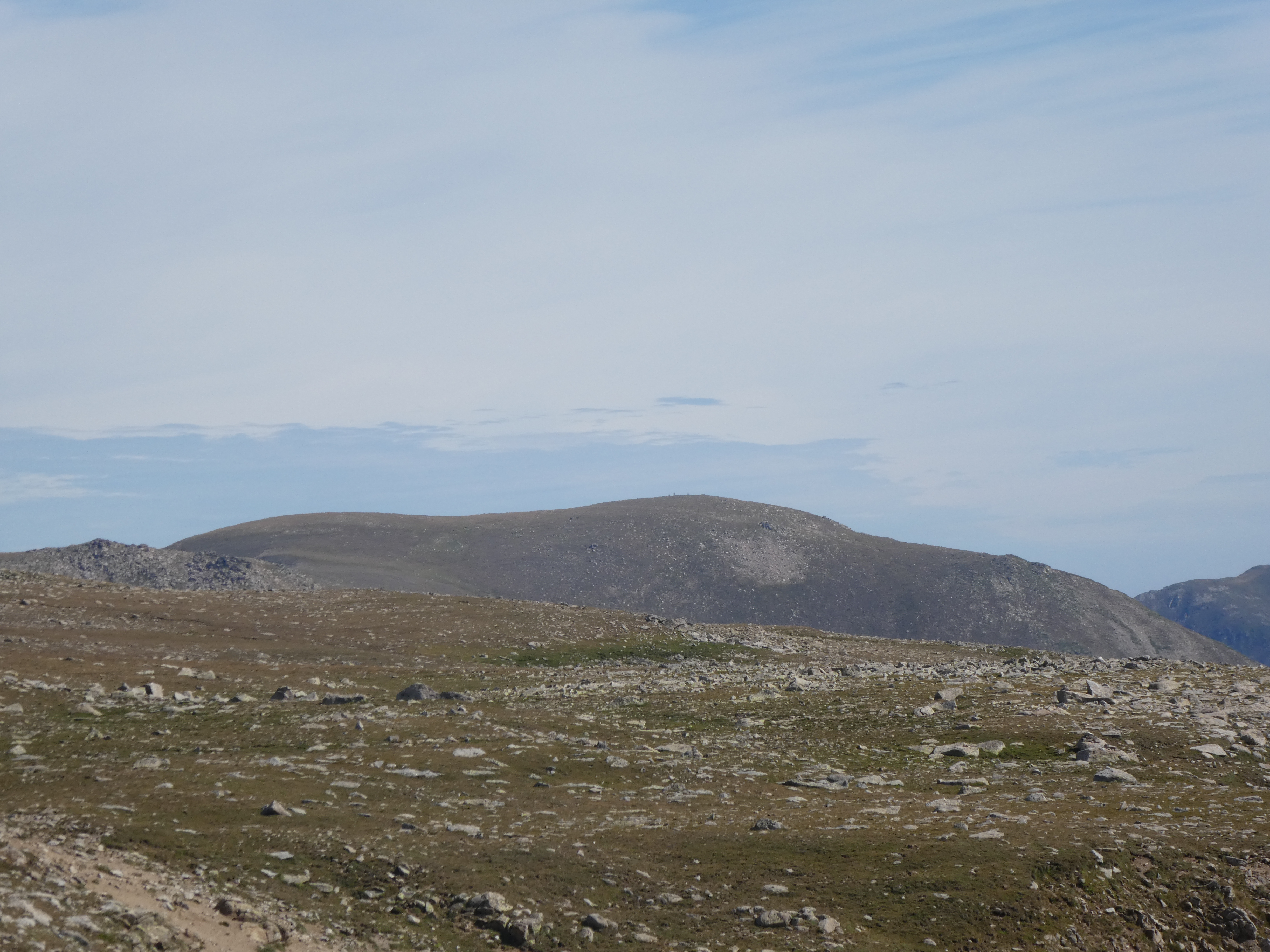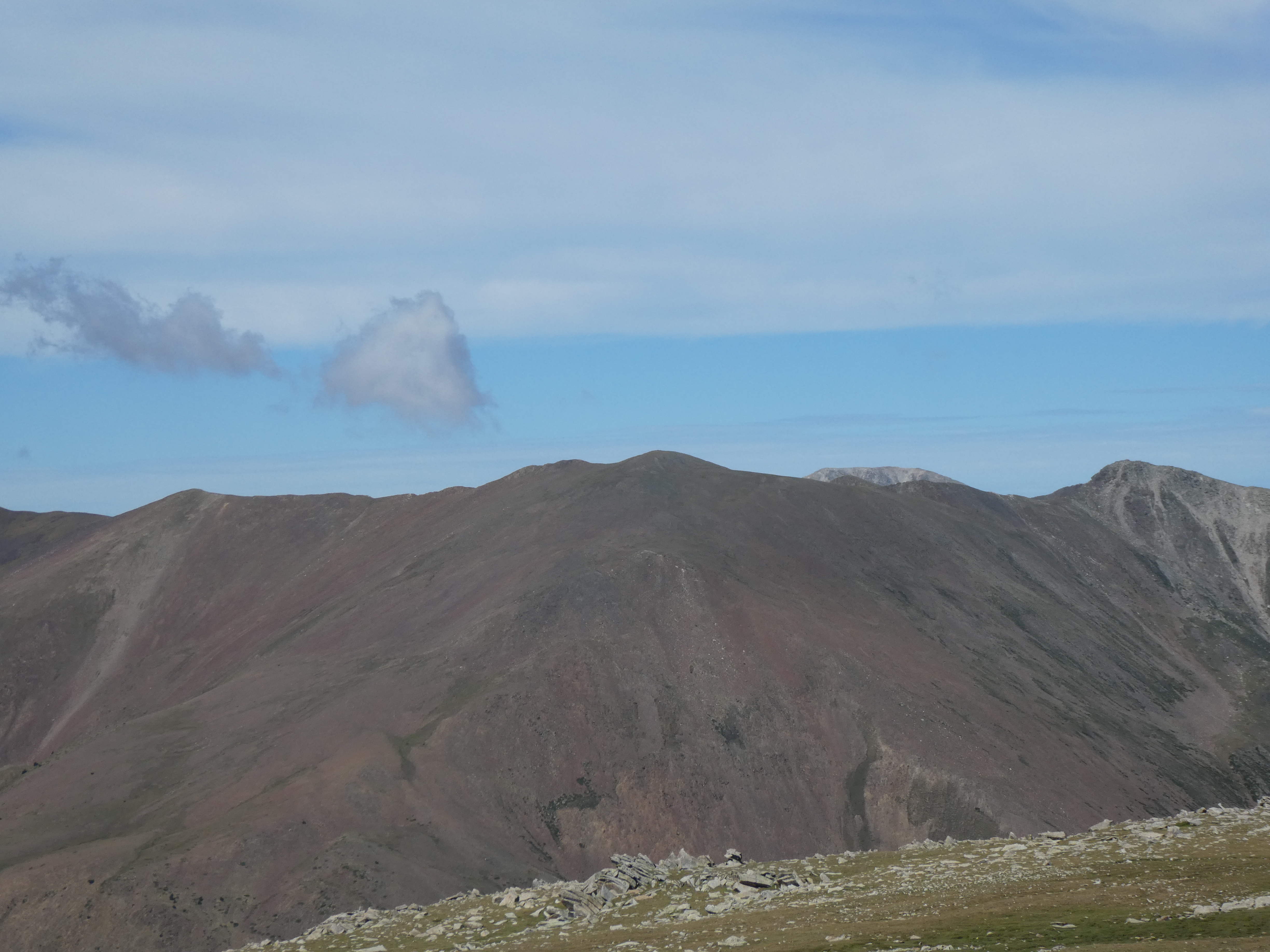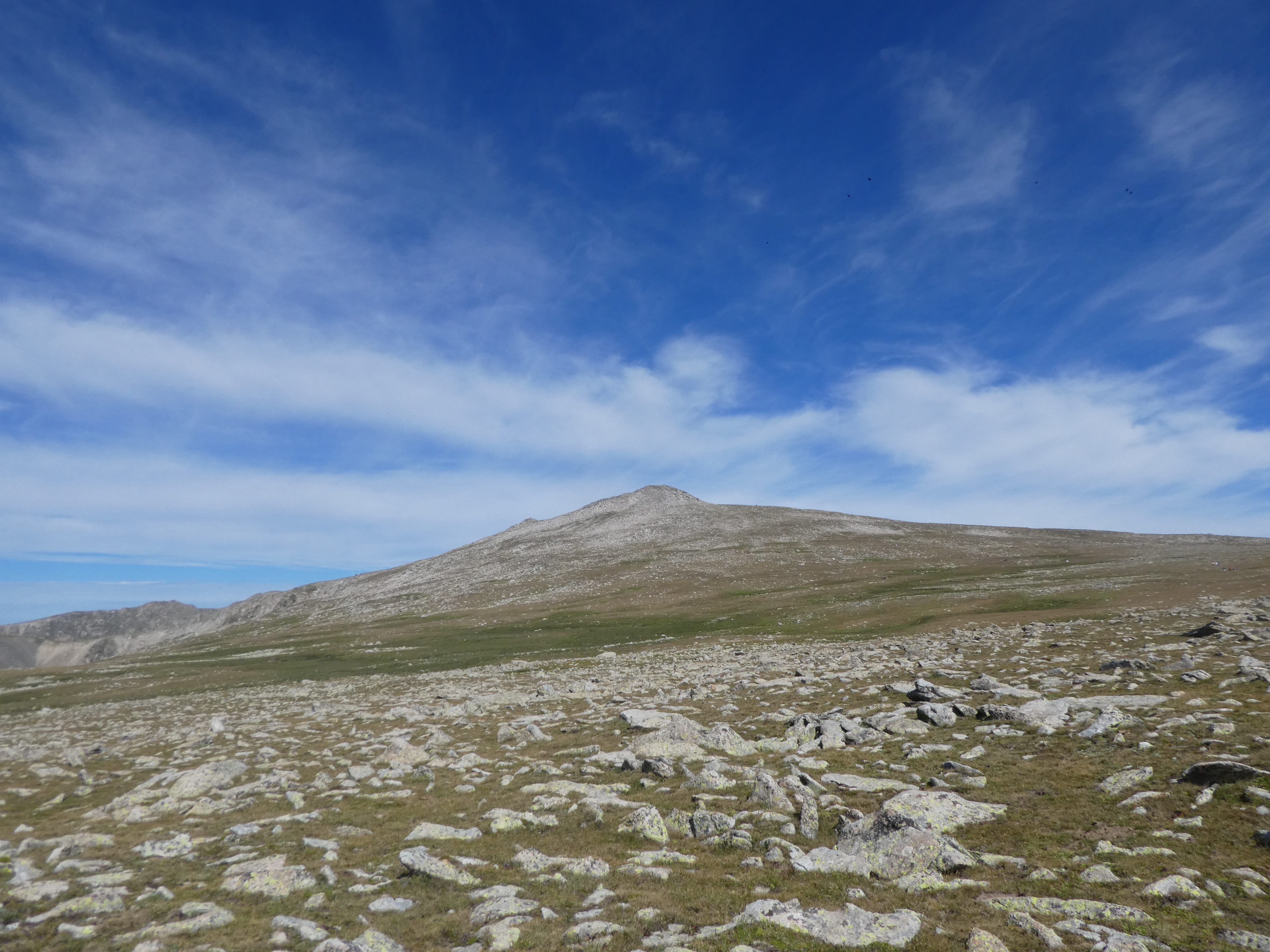 Zoom sur le Puig de la Grava (2671 m) à gauche, le Puig de la Cometa d'Espagne (2763 m) au centre-gauche et le Puig de la Portella Gran (2765 m) à droite