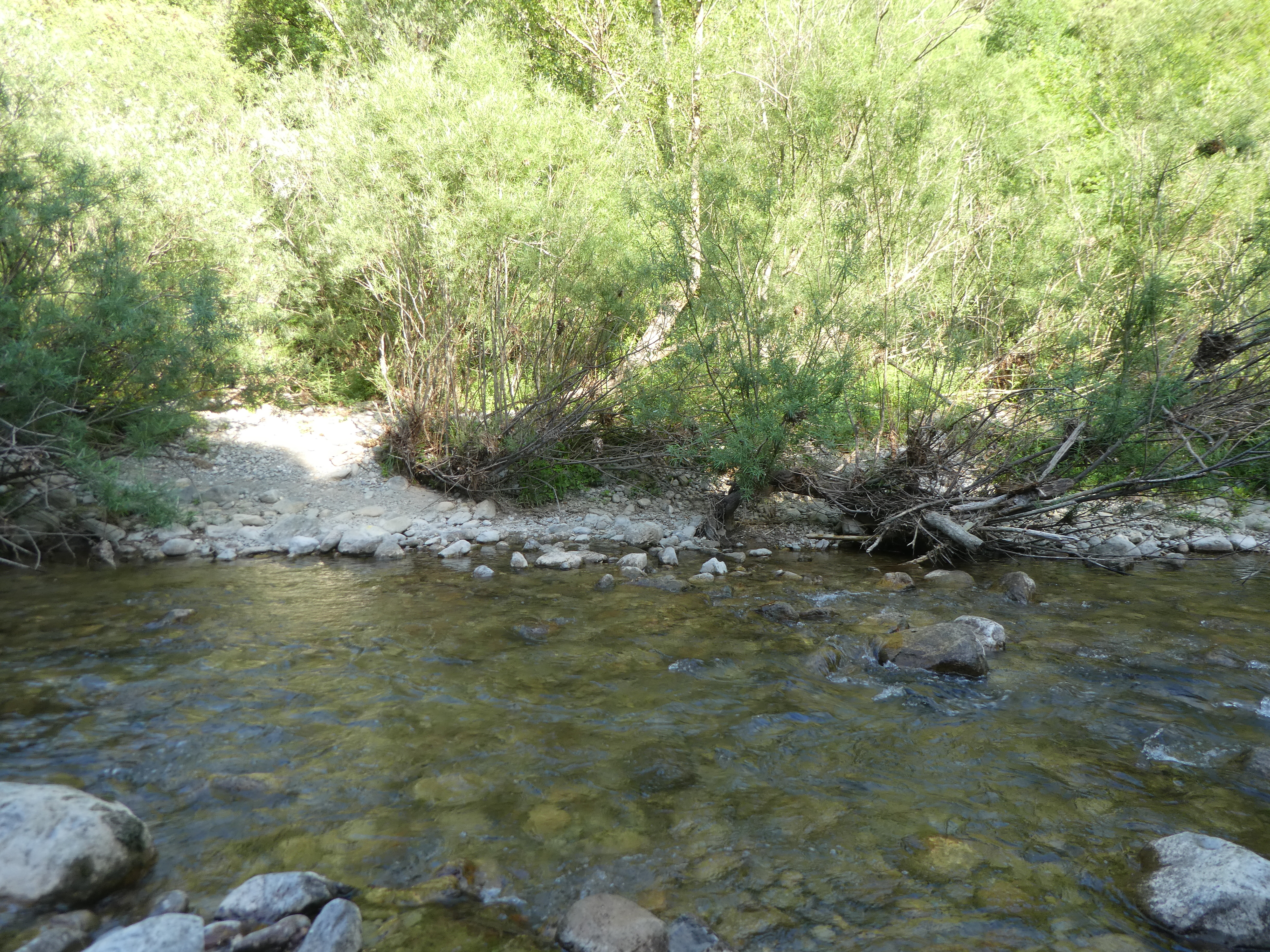 Au niveau de ce passage à gué de la Riera d'Escales (1800 mètres après le lieu-dit "la Sala"), traverser la rivière puis suivre le semblant de chemin partant sur la droite rive droite de la Riera d'Escales direction Ermita de la Mare de Déu d'Escales