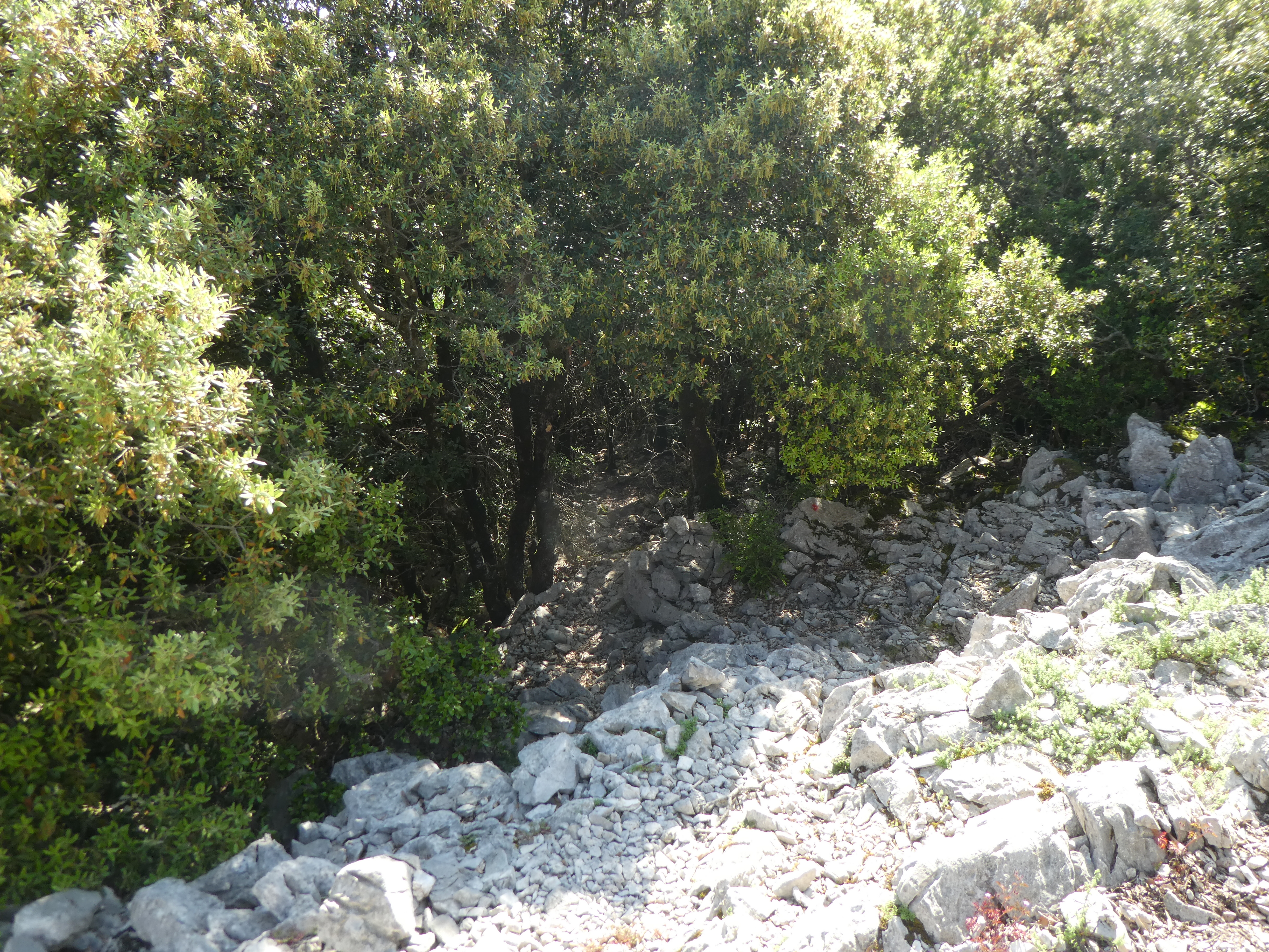 A ce croisement cairné marqué par la présence de directions peintes en bleu sur les rochers (200 mètres après le précédent), suivre le chemin montant raidement sur la gauche direction Coll de Terres (le chemin partant tout droit mène au Coll de la Bassa)