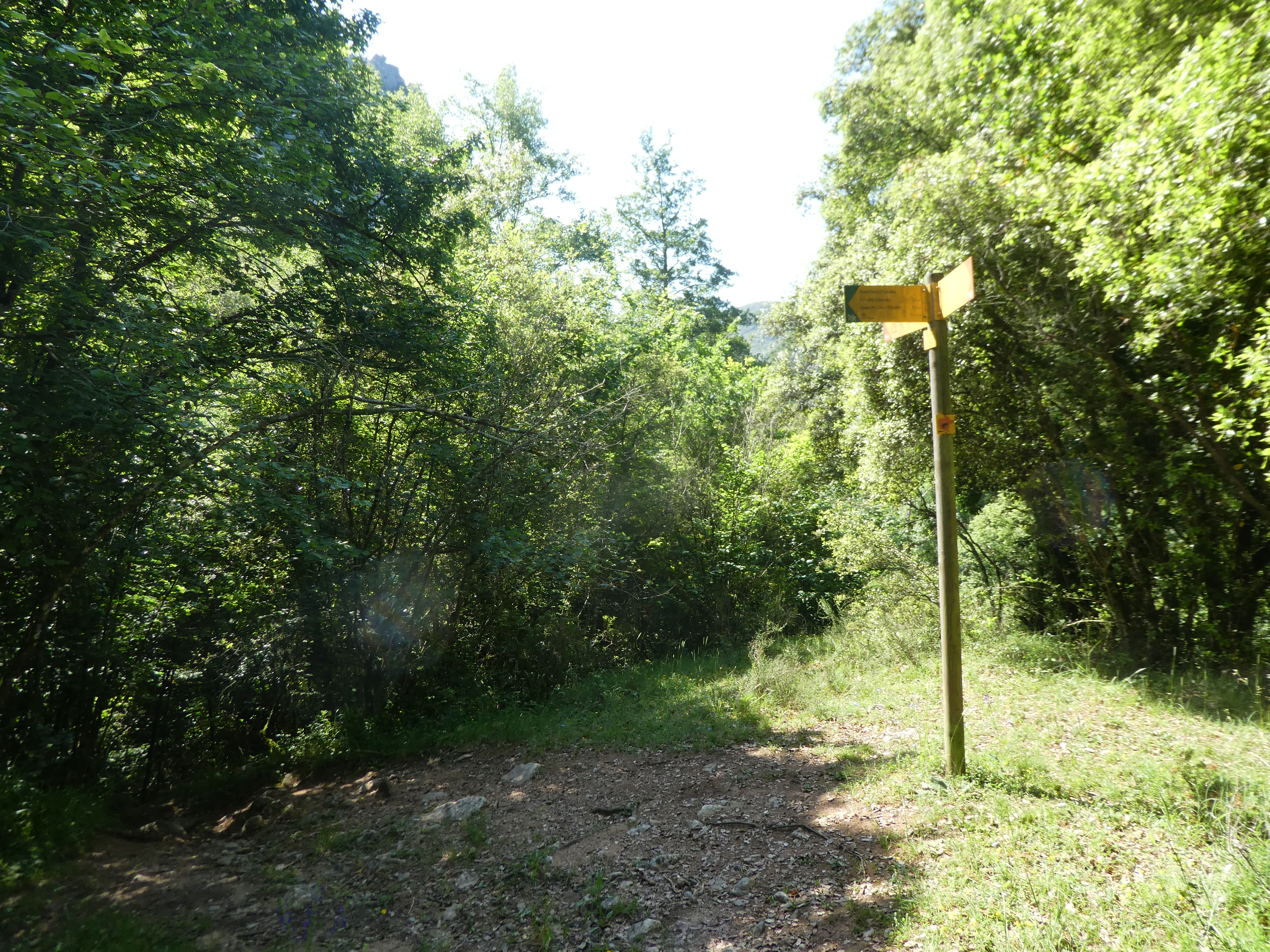 Coll de Palomeres (610 m) : suivre le chemin partant tout droit direction Sadernes, balisé uniquement en jaune dorénavant