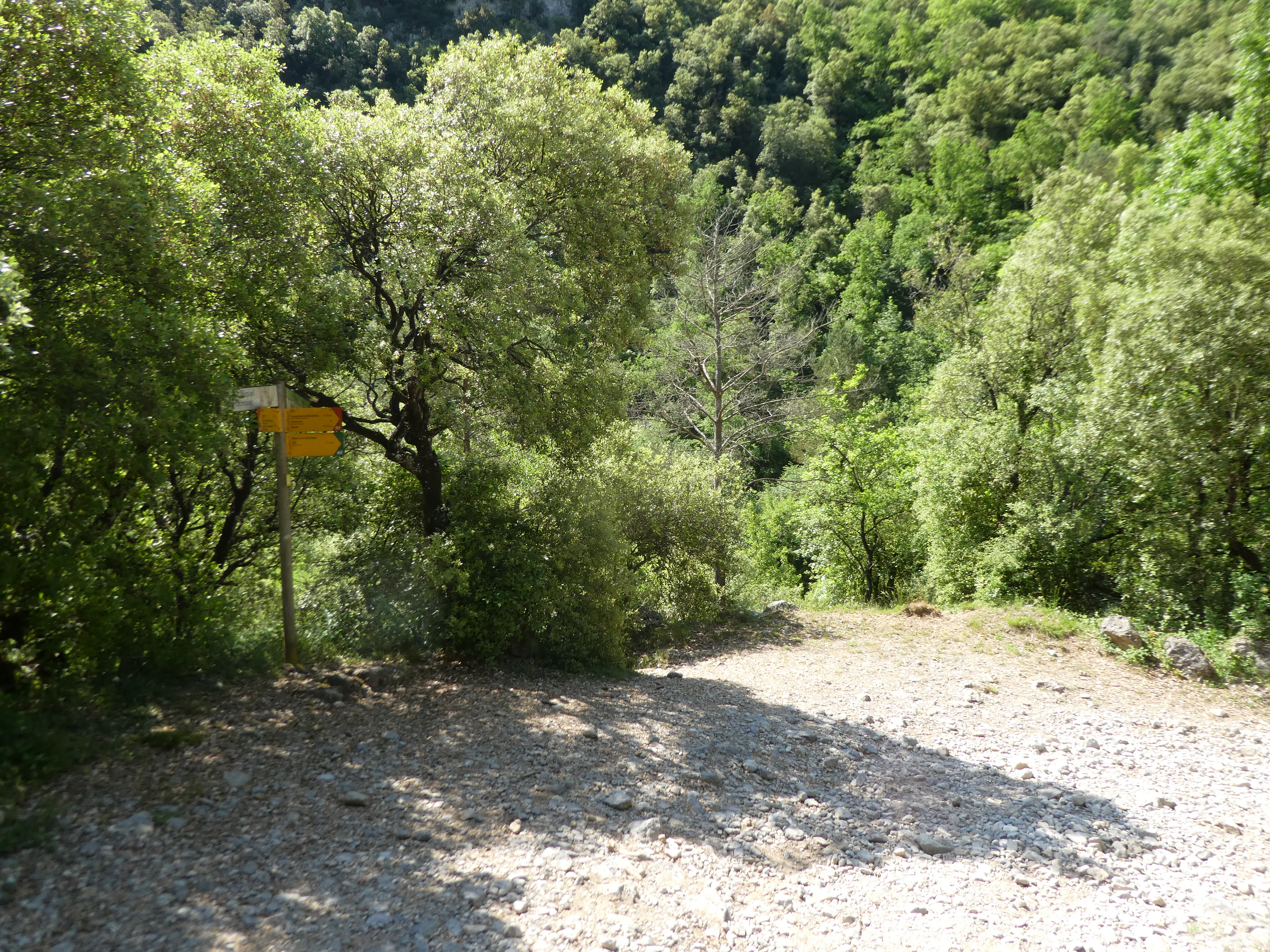 A ce croisement cairné avec le chemin montant à l'Ermita de la Mare de Déu d'Escales (50 mètres après le passage à gué), suivre ce dernier partant sur la gauche direction Ermita de la Mare de Déu d'Escales