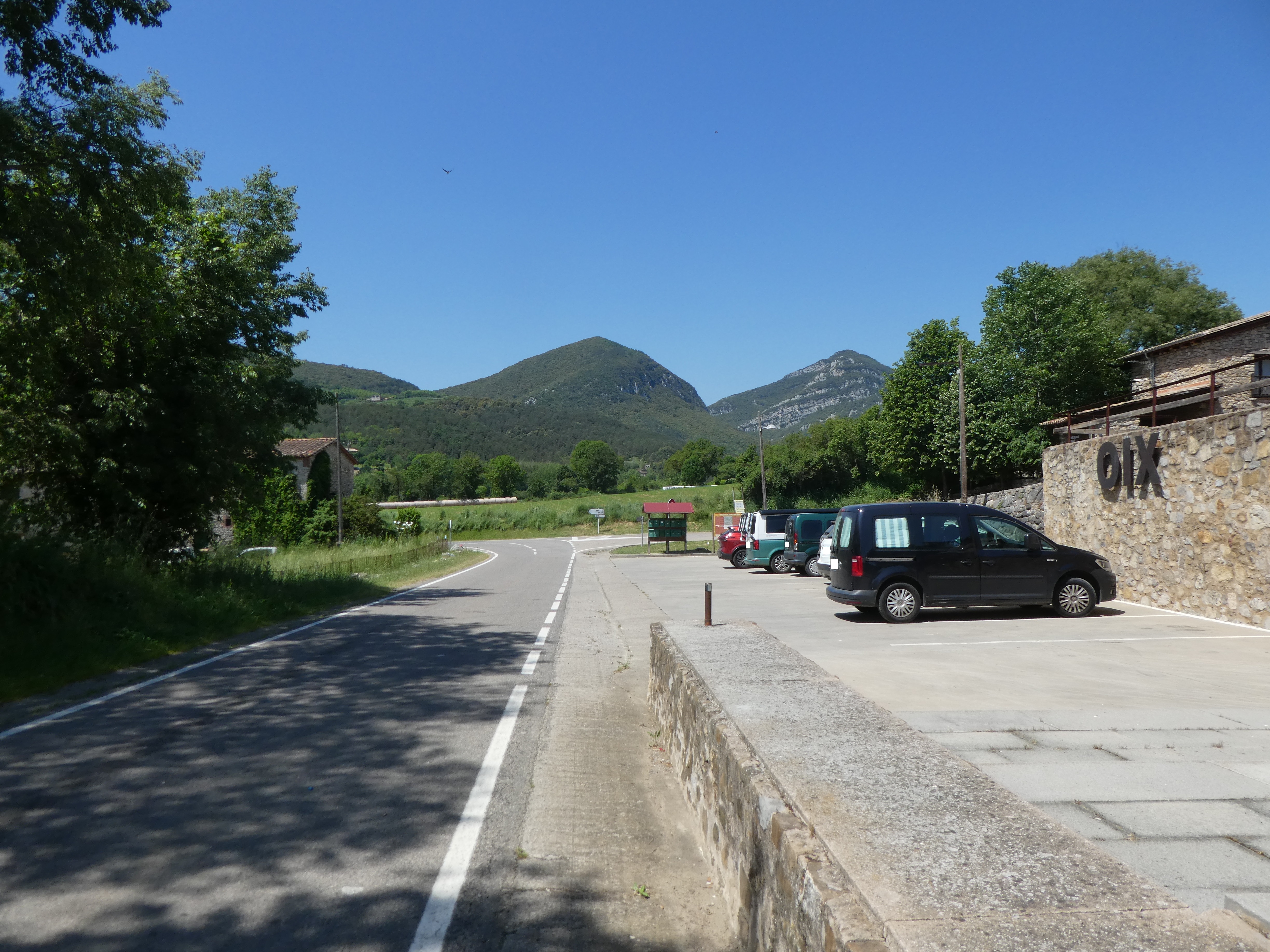 A ce croisement avec le GR1 marqué par la présence d'un panneau directionnel (100 mètres après le lieu-dit "Oix"), suivre la GIV-5221 partant tout droit direction Oix - Aparcament Visitants, balisé en rouge et blanc, et en jaune dorénavant