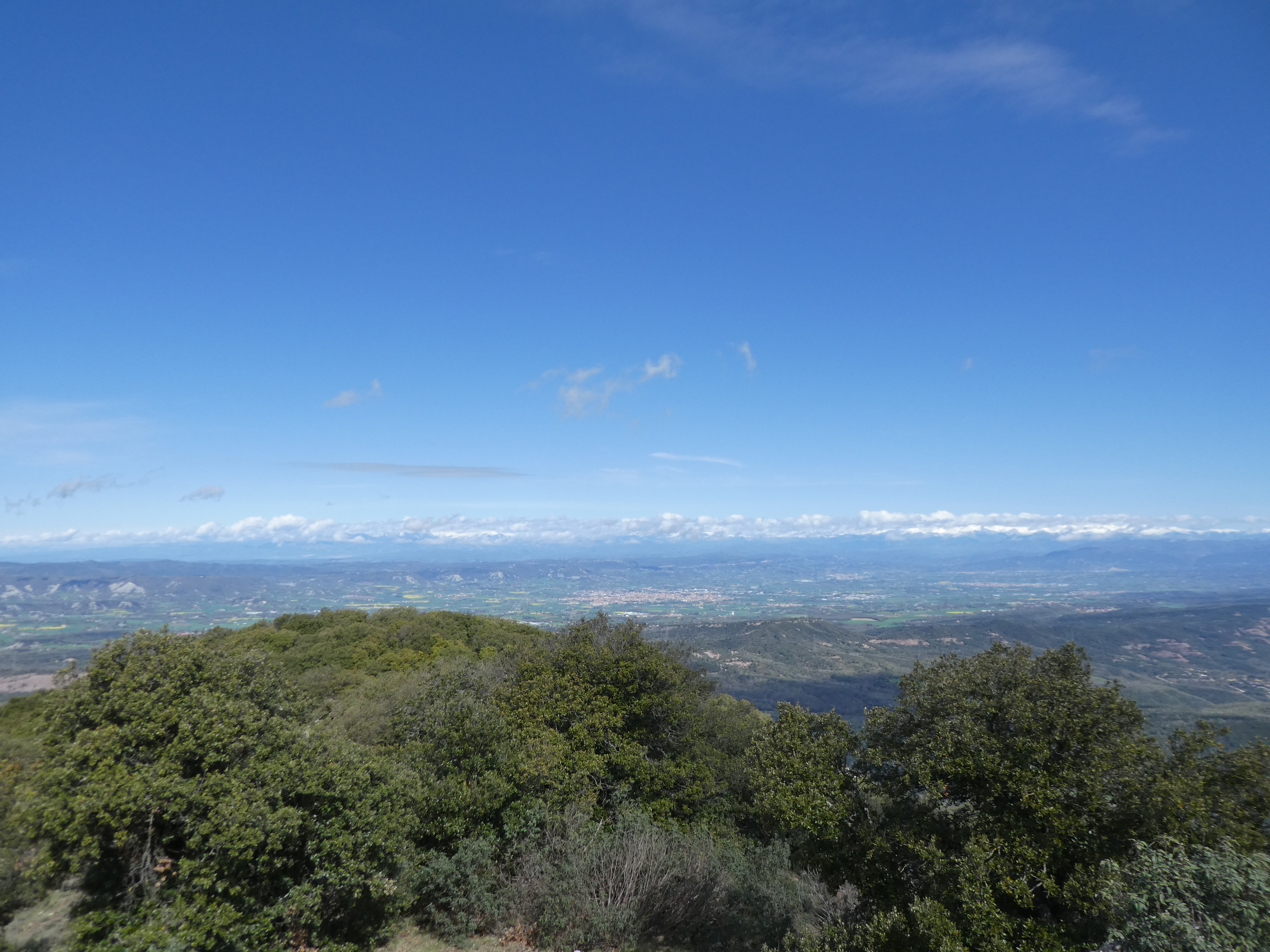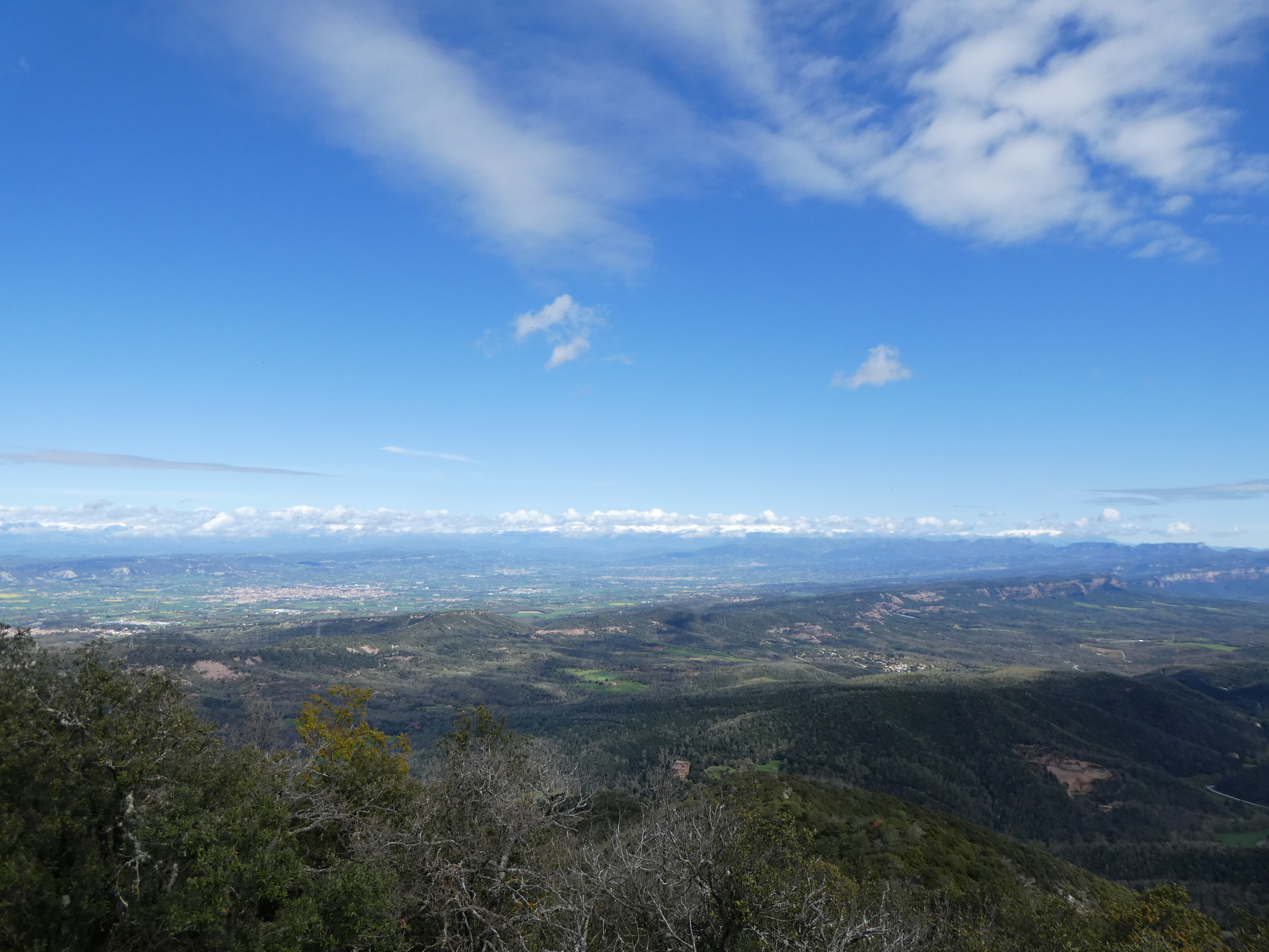 Arrivée au sommet du Serrat de l'Oriol (1191 m) : beau point de vue sur les sommets du Bages, du Moianès, du Berguedà, du Lluçanès, de la Cerdanya, de la Haute-Cerdagne, du Ripollès et du Haut-Vallespir