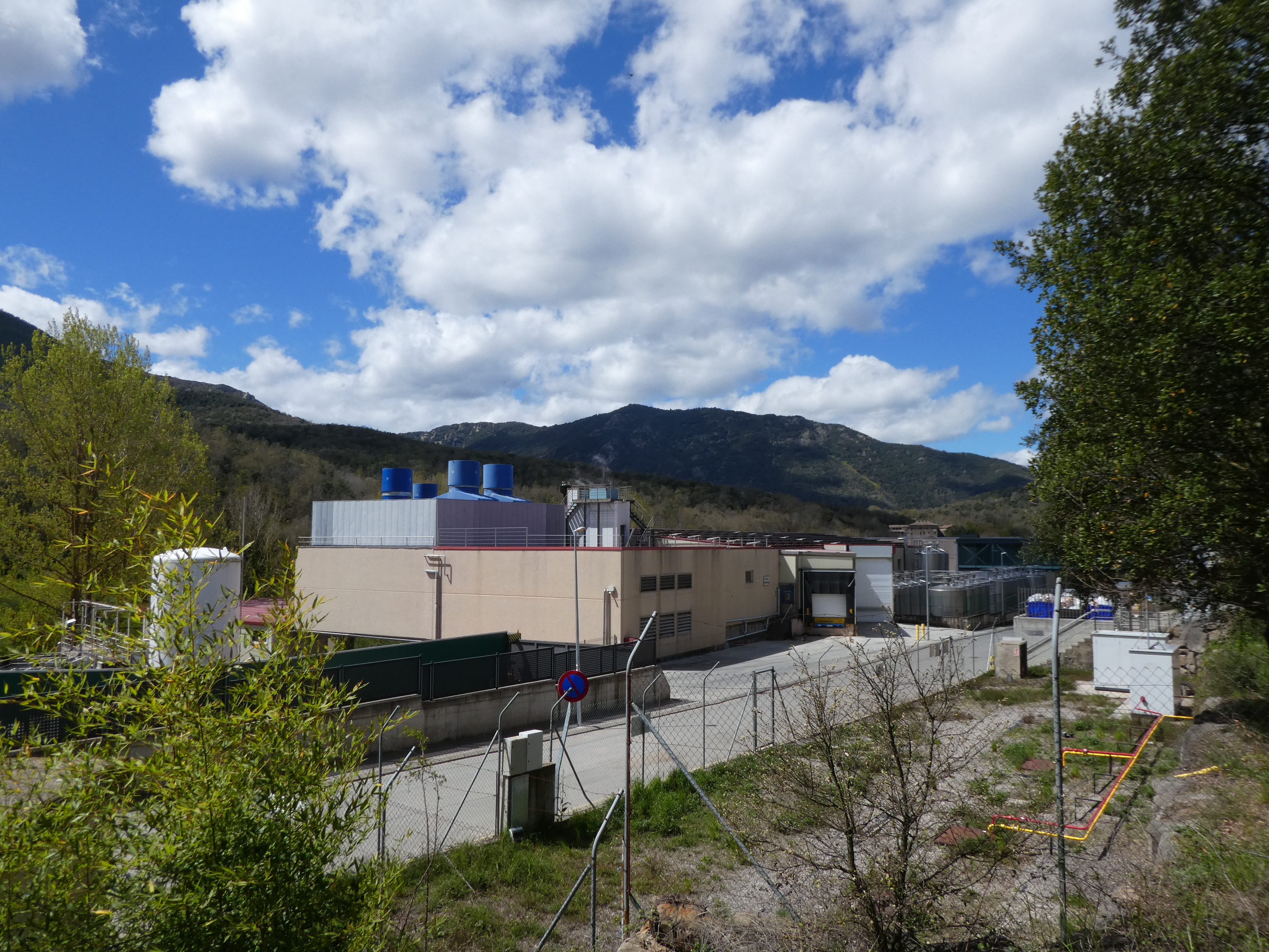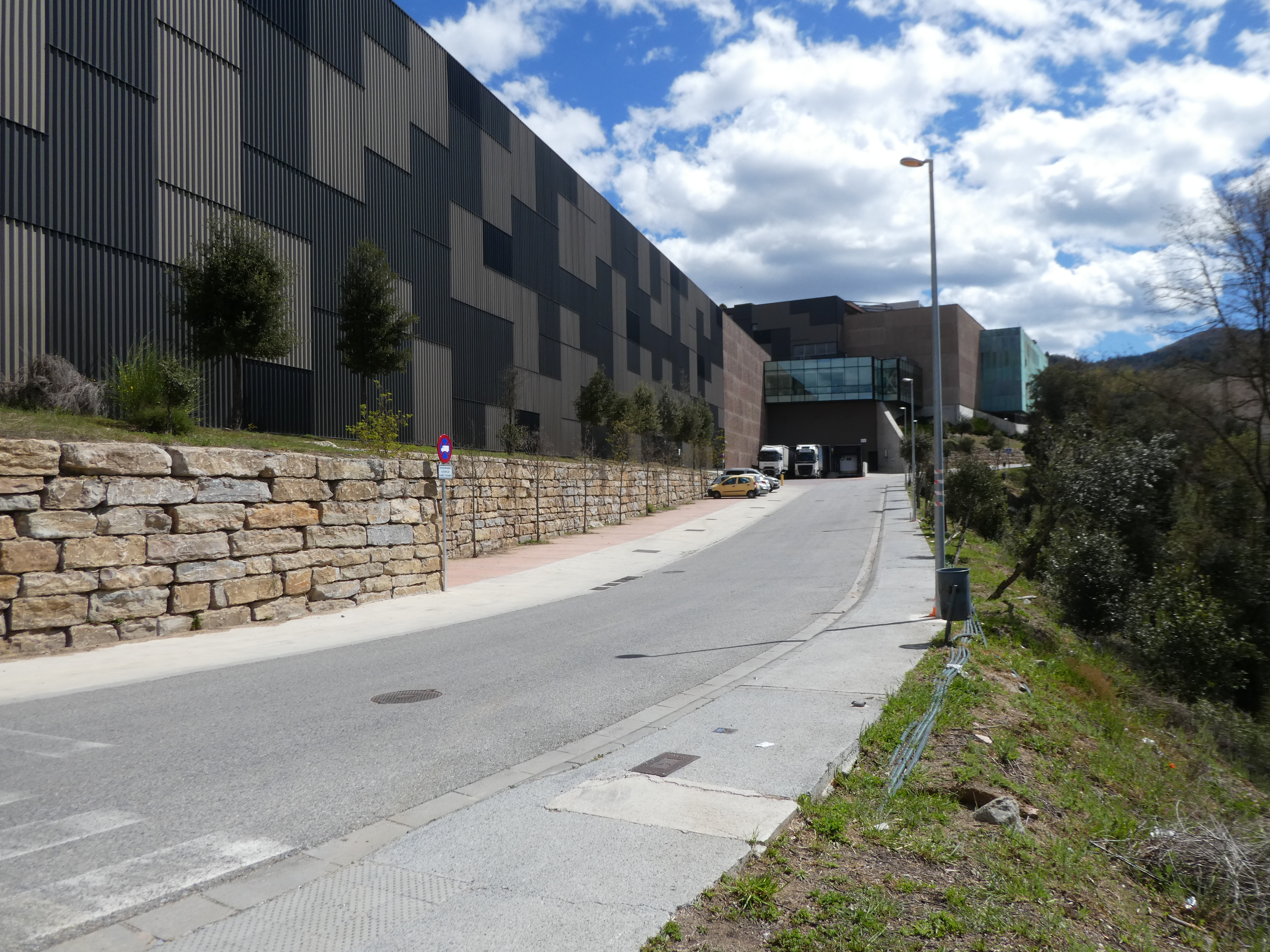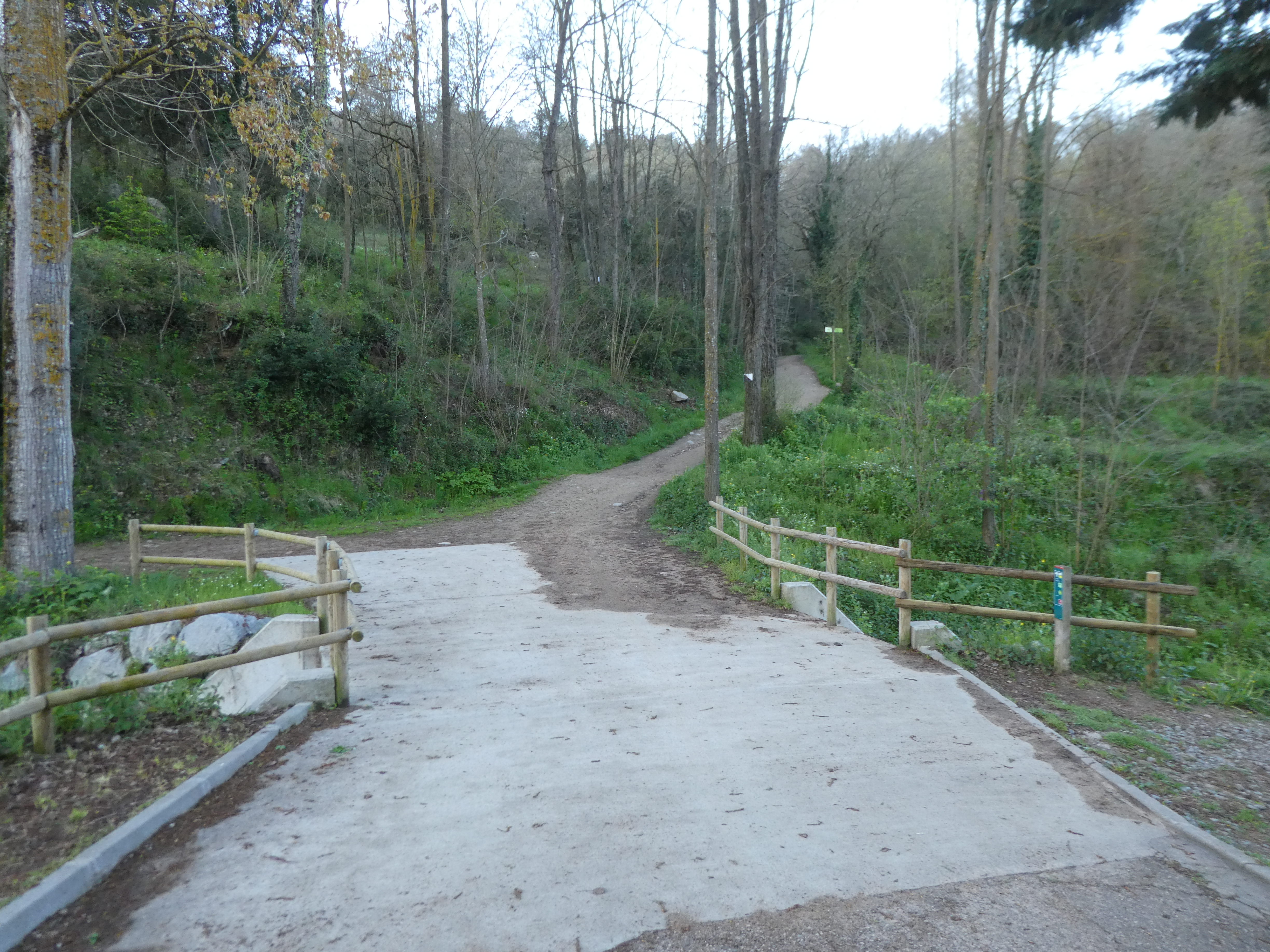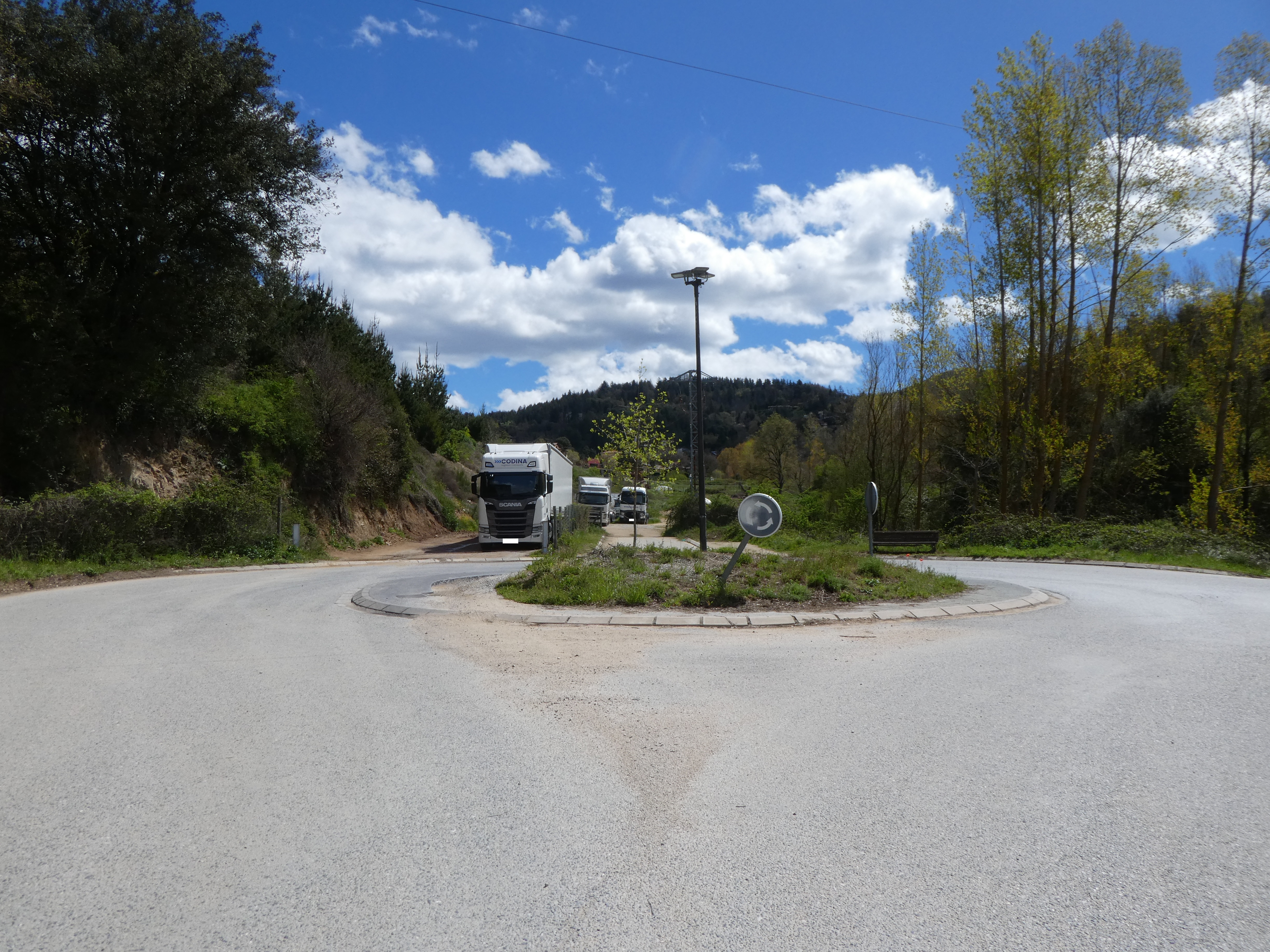 Au niveau de ce rond-point situé à la sortie de l'usine (350 mètres après le précédent croisement), suivre la route partant sur la gauche (troisième sortie) puis monter les escaliers menant à la GI-520 direction Viladrau