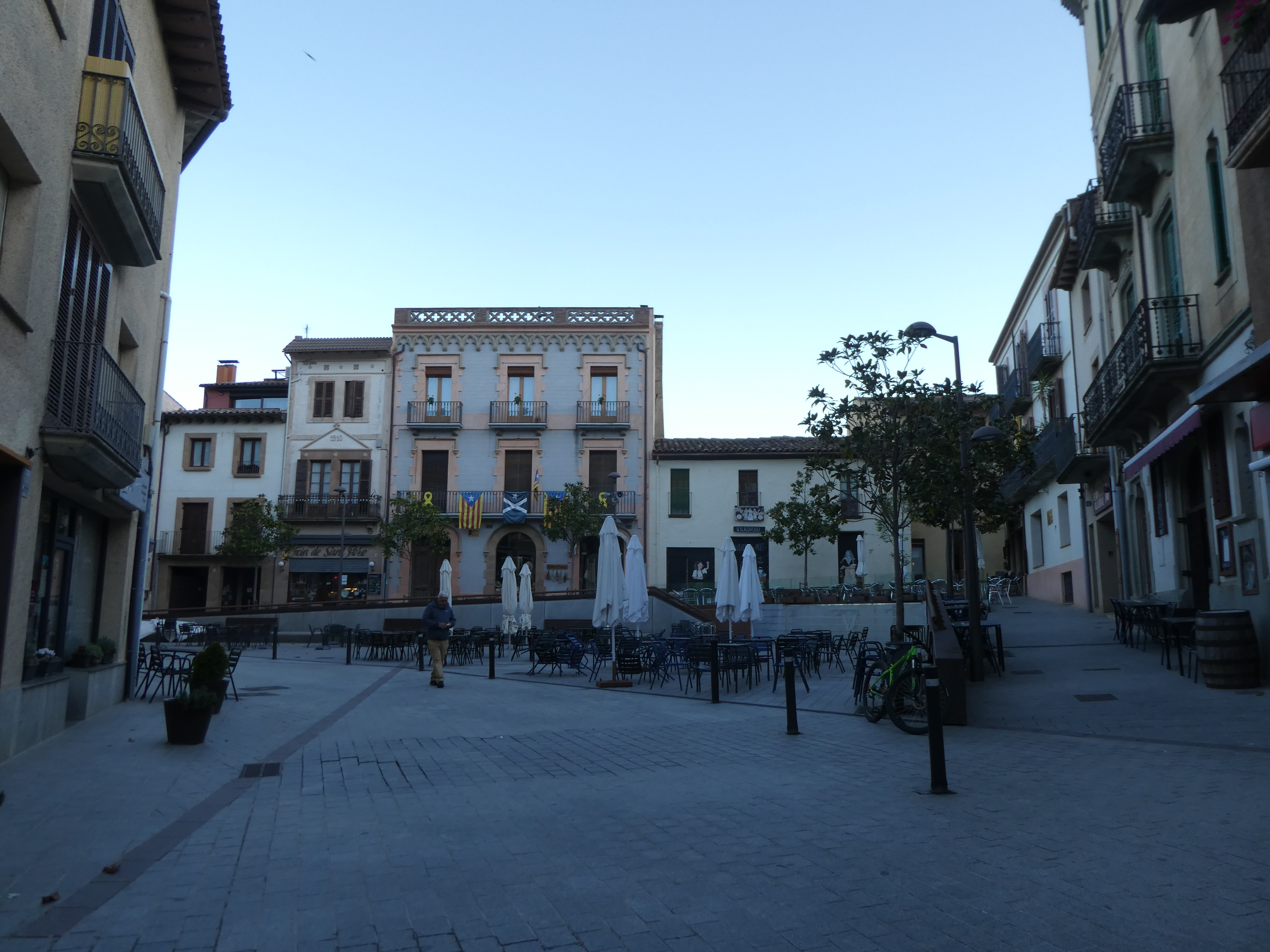 A cette intersection (100 mètres après le départ), suivre la rue partant sur la gauche vers la Plaça Major direction Matagalls, balisé en jaune et blanc, et en vert et blanc