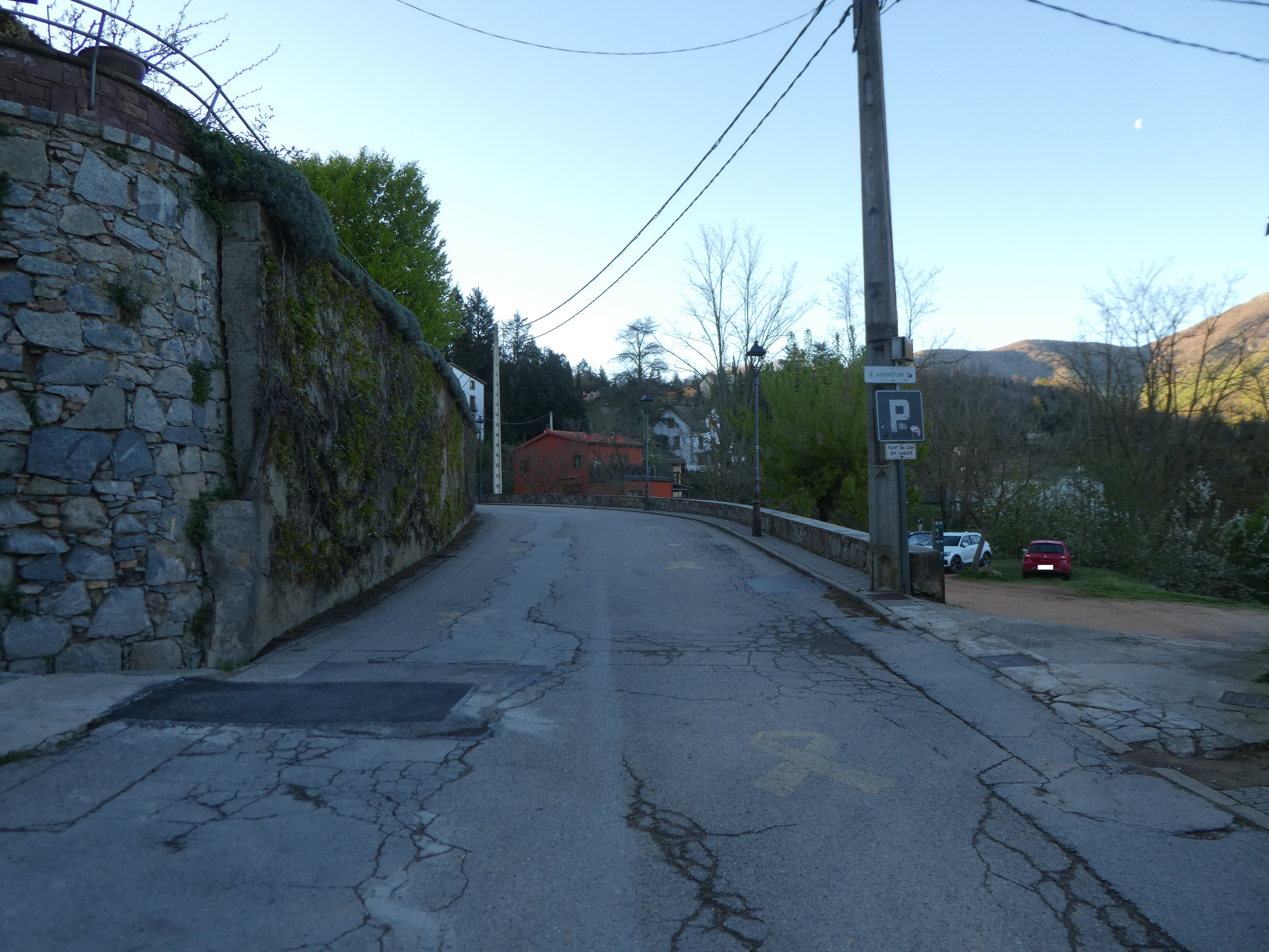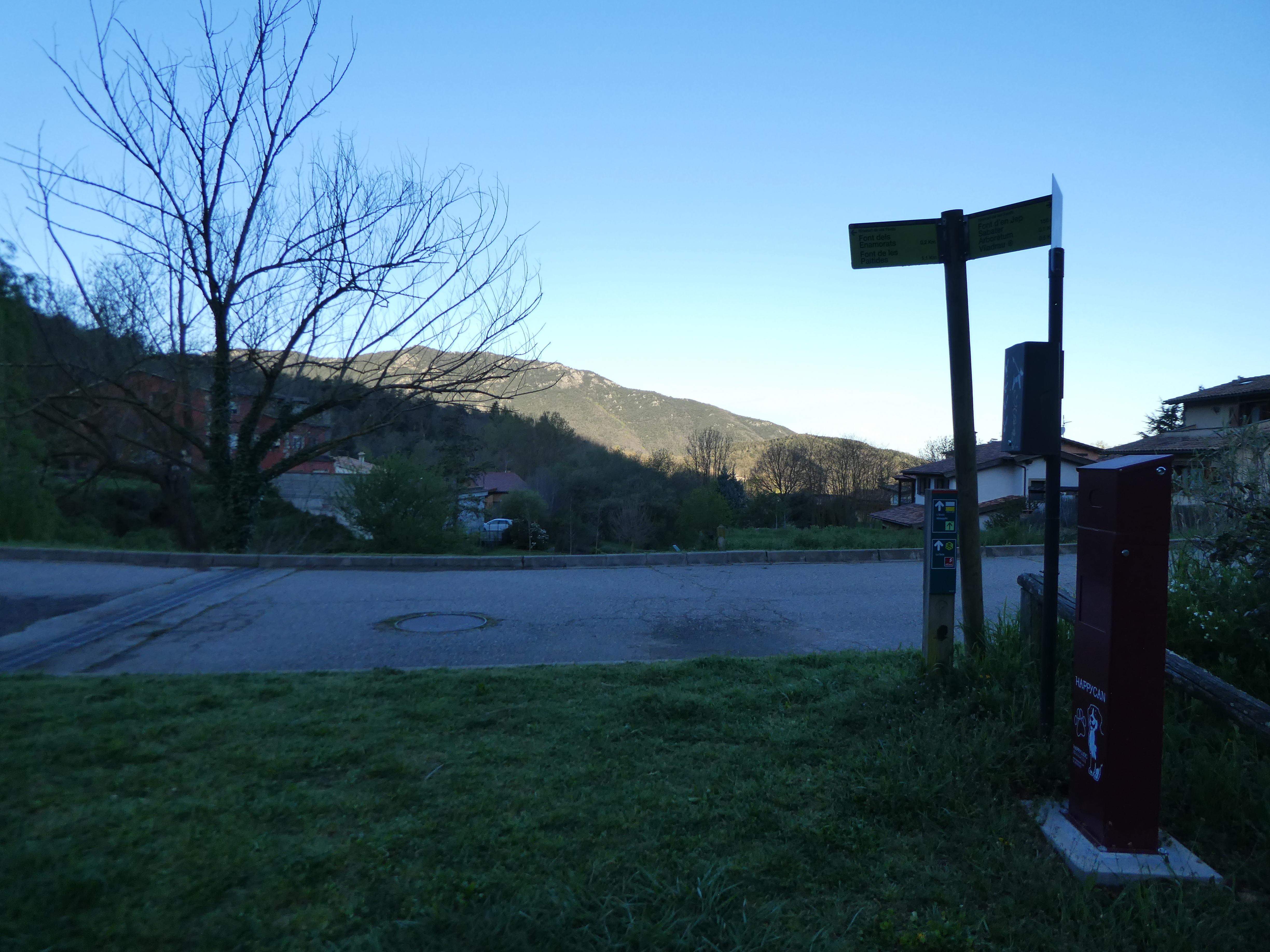 A cette intersection située au niveau de l'Hostal Bofill (150 mètres après la précédente), suivre la rue partant sur la gauche (Carrer de Sant Marçal) direction Matagalls, balisé en jaune et blanc, et en vert et blanc