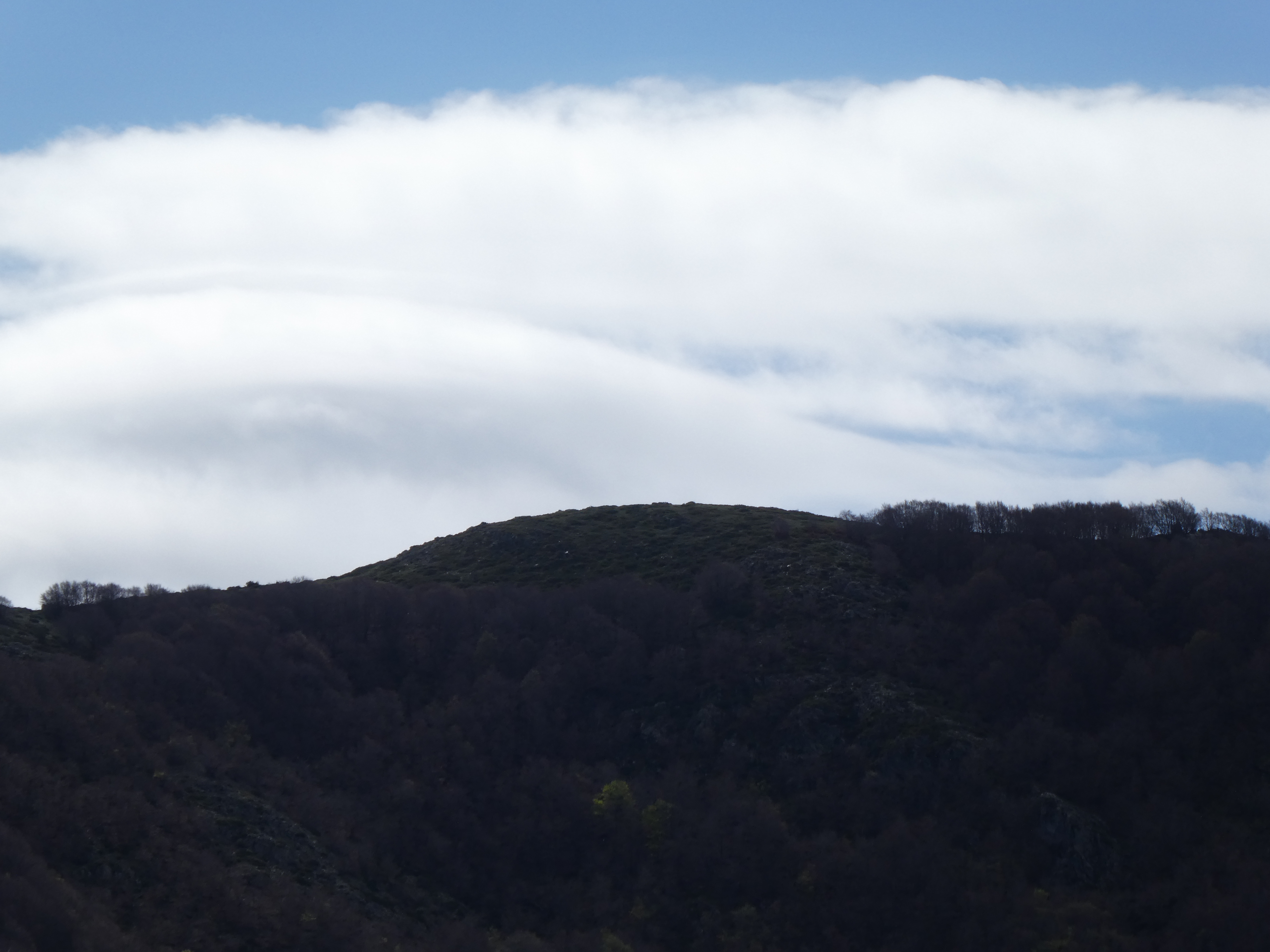 Zoom sur le Puigmal (2910 m) à gauche dans les nuages et le Puig de Finestrelles (2827 m) à droite