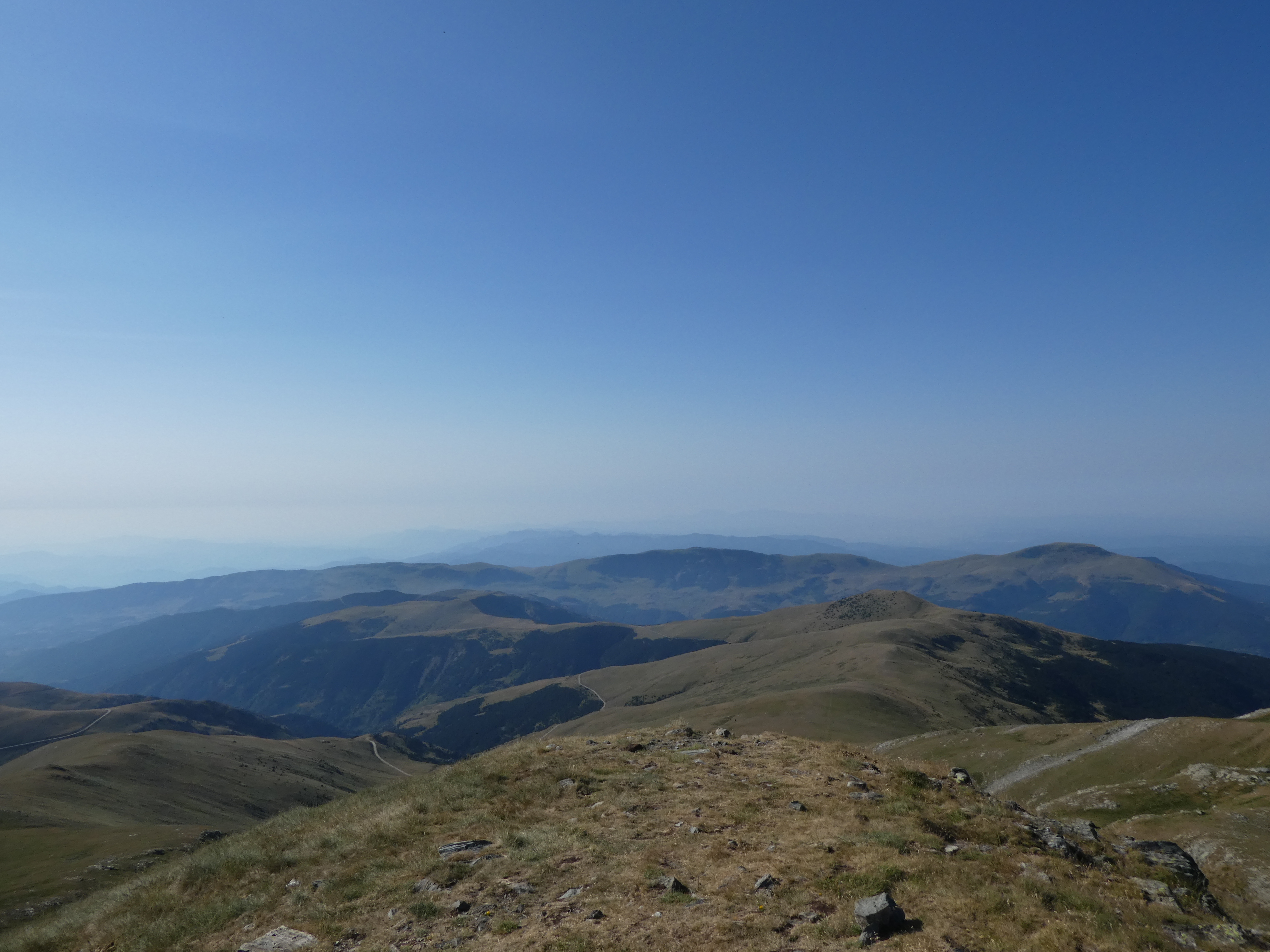 Arrivée au sommet du Balandrau (2585 m) : très beau panorama sur les sommets du Ripollès, de la Cerdanya, du Haut-Conflent, du Conflent, du Vallespir, de l'Empordà, de la Garrotxa et de l'Osona