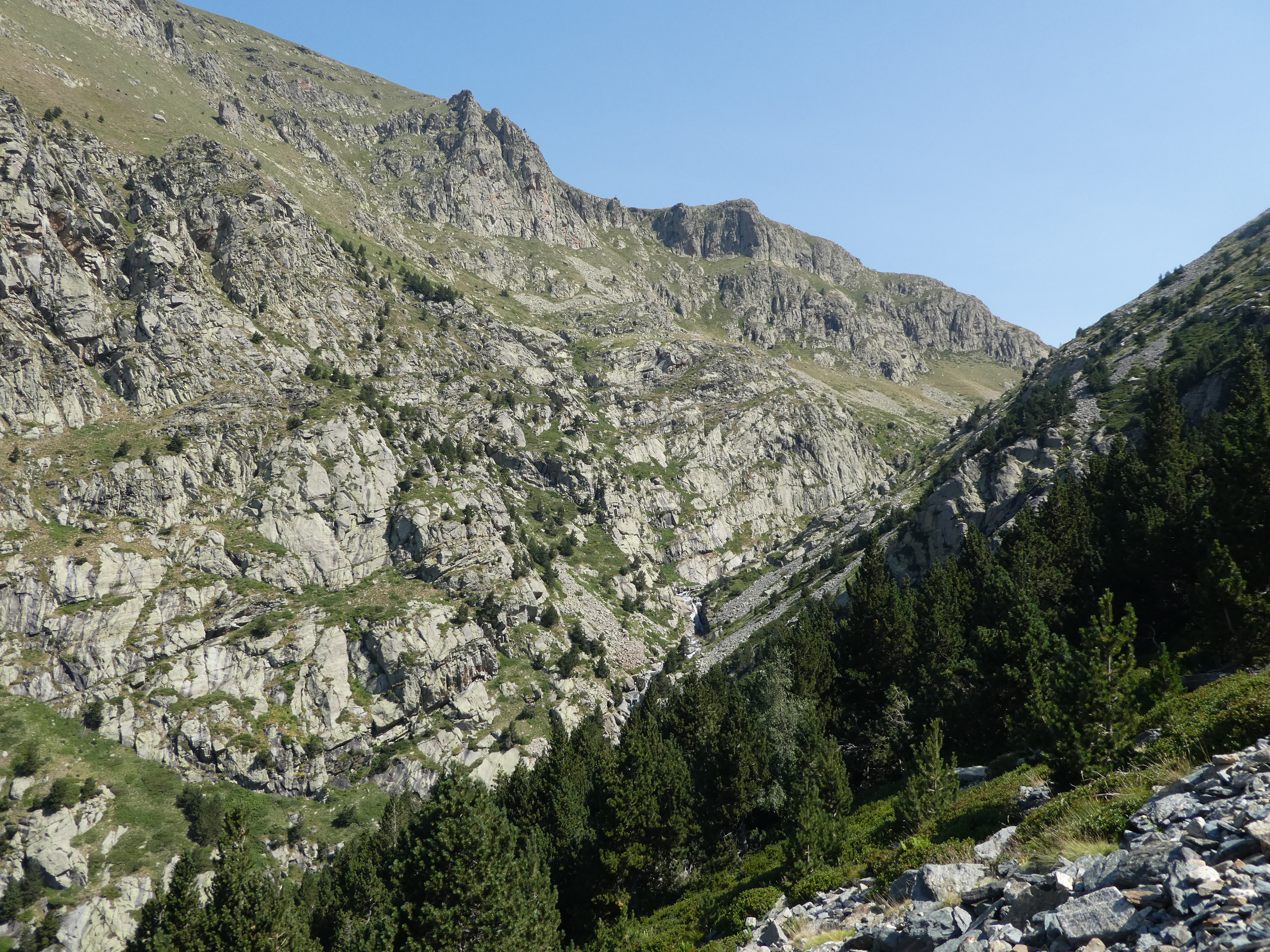 A ce croisement cairné (250 mètres après le Coll dels Trespics), suivre le semblant de chemin descendant sur la gauche direction Refugi de Coma de Vaca, balisé sporadiquement en jaune (attention, les cairns et les balises jaunes disparaissent progressivement dans la descente : il faut rester rive droite du torrent et ne pas aller jusqu'au Refugi de Coma de Vaca !)