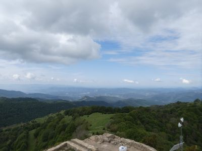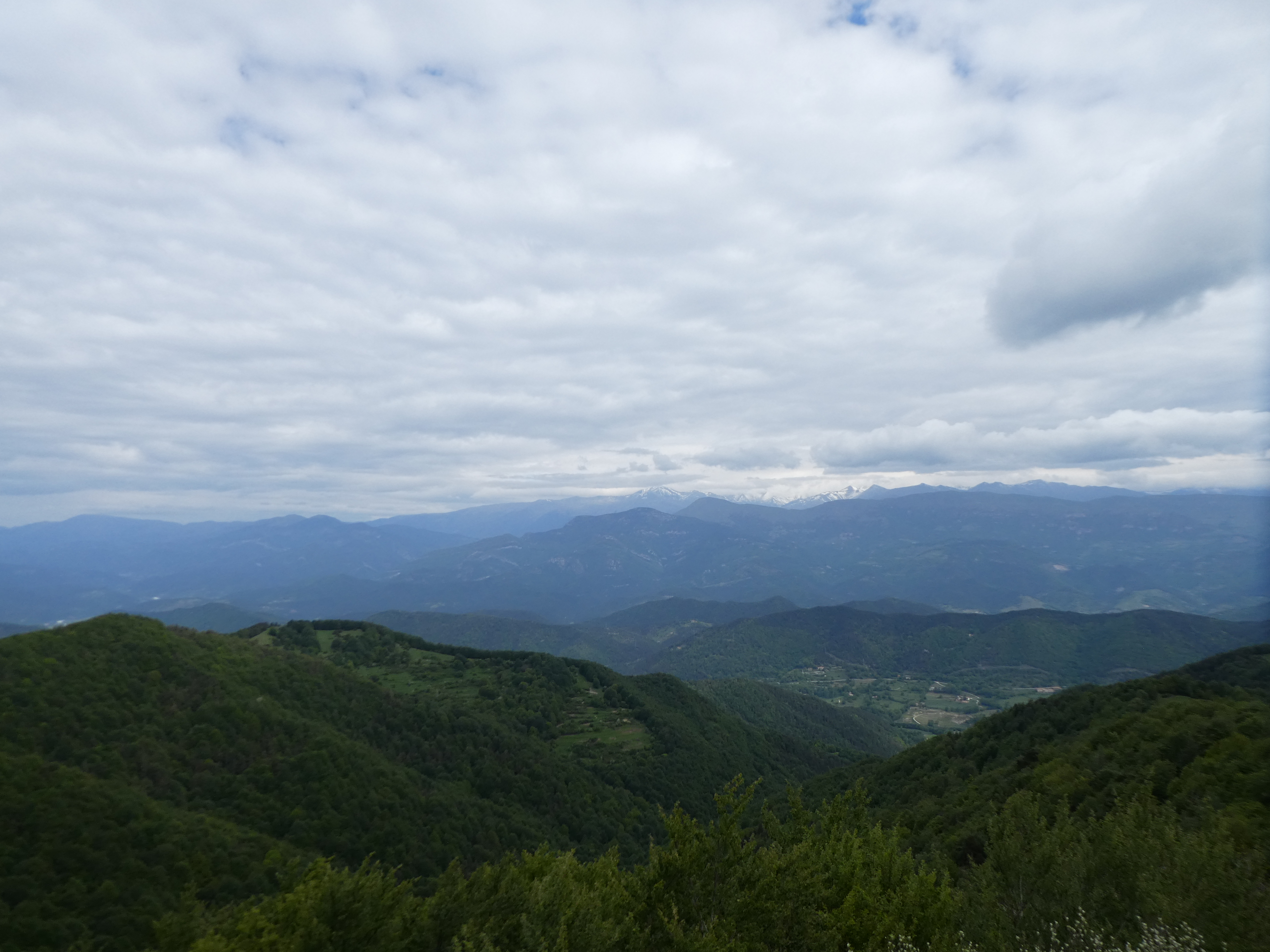 Arrivée au sommet de Milany (1529 m) : beau panorama sur les sommets de l'Osona, du Berguedà, de la Cerdanya, du Ripollès, du Conflent, de la Garrotxa ainsi que sur la Plaine de l'Osona
