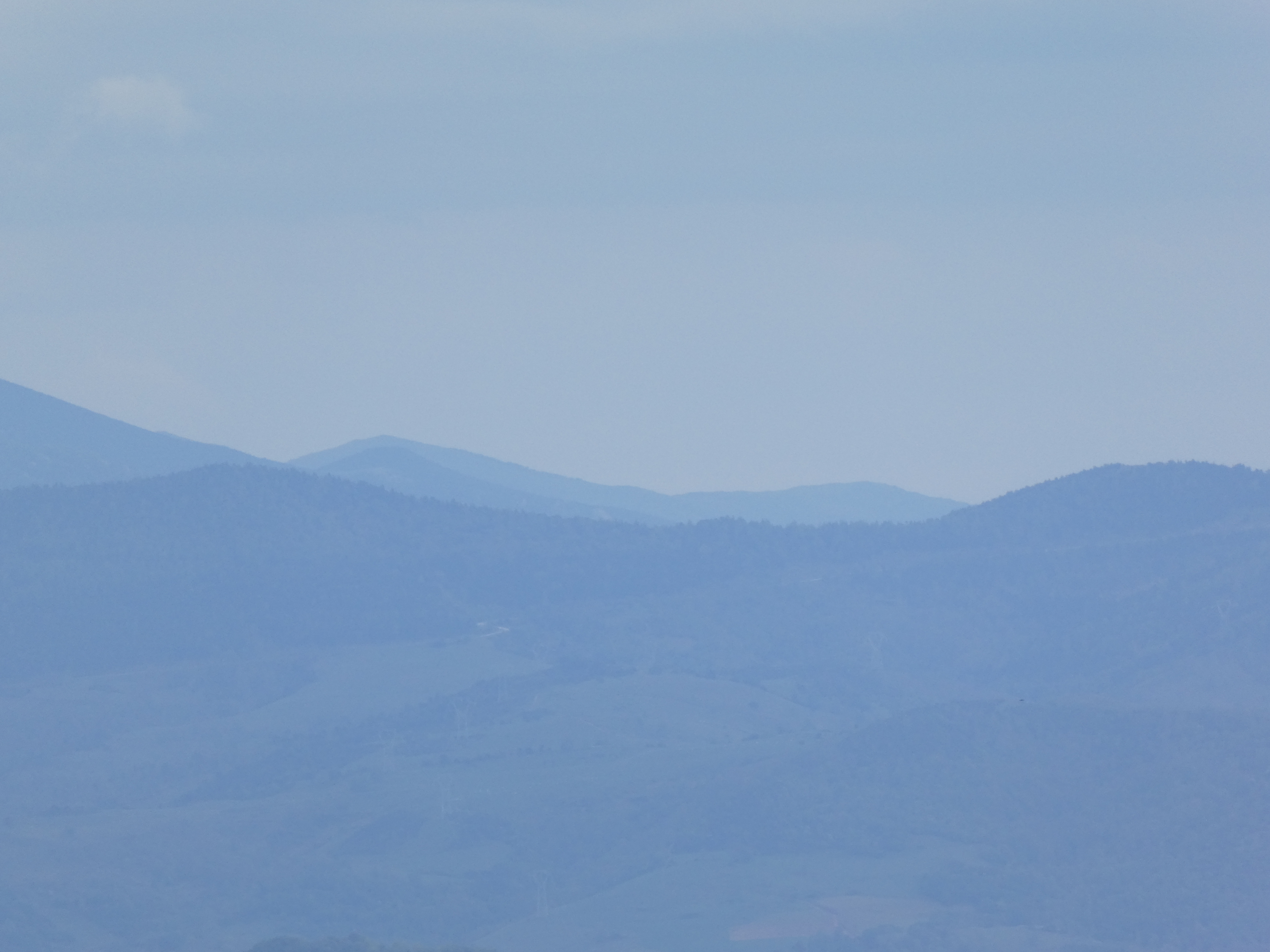 Zoom sur le massif du Montseny avec le Turó de Morou (1312 m) à gauche, le Turó de l'Home (1706 m) au centre-gauche et Matagalls (1697 m) au centre-droit