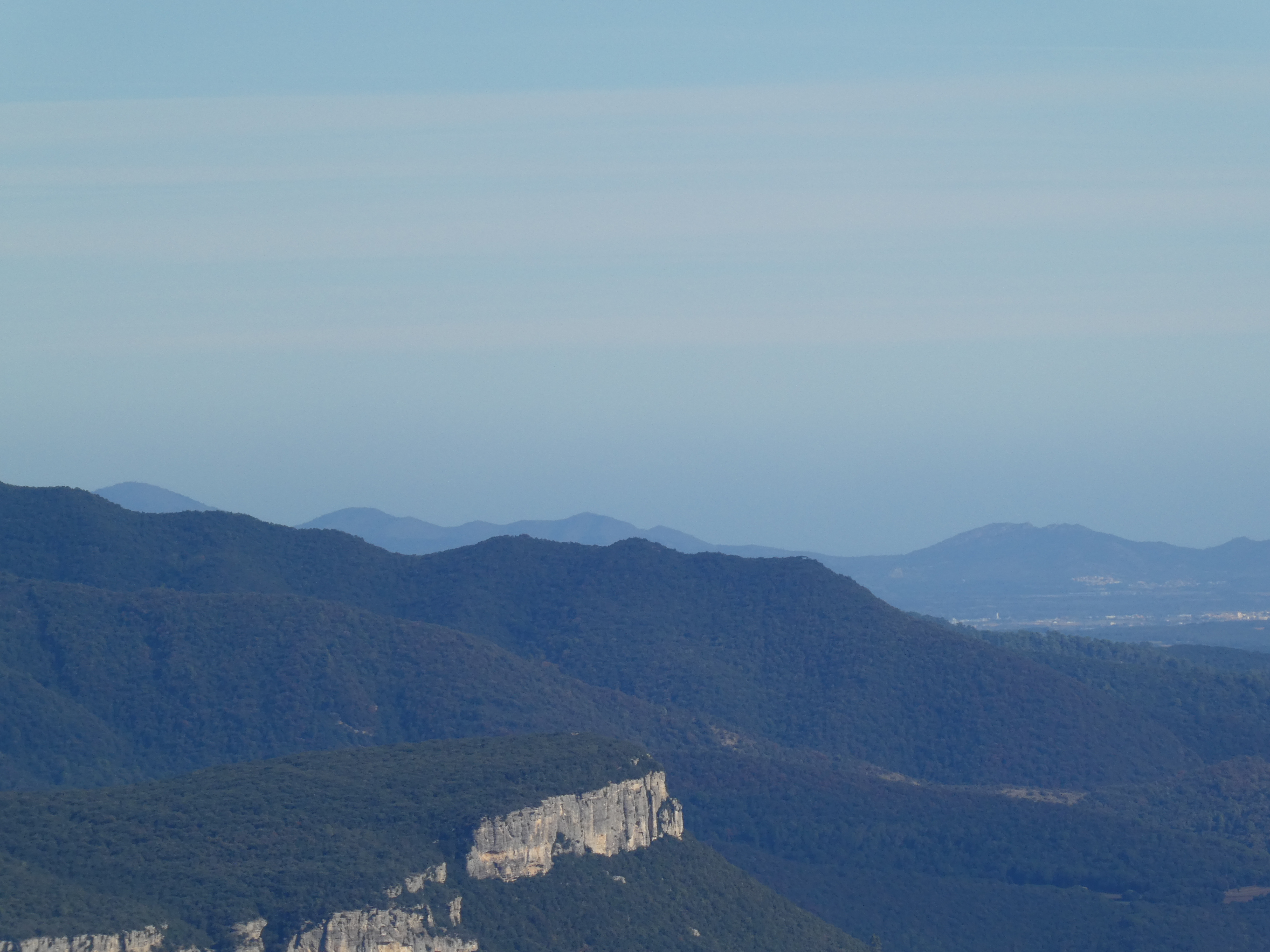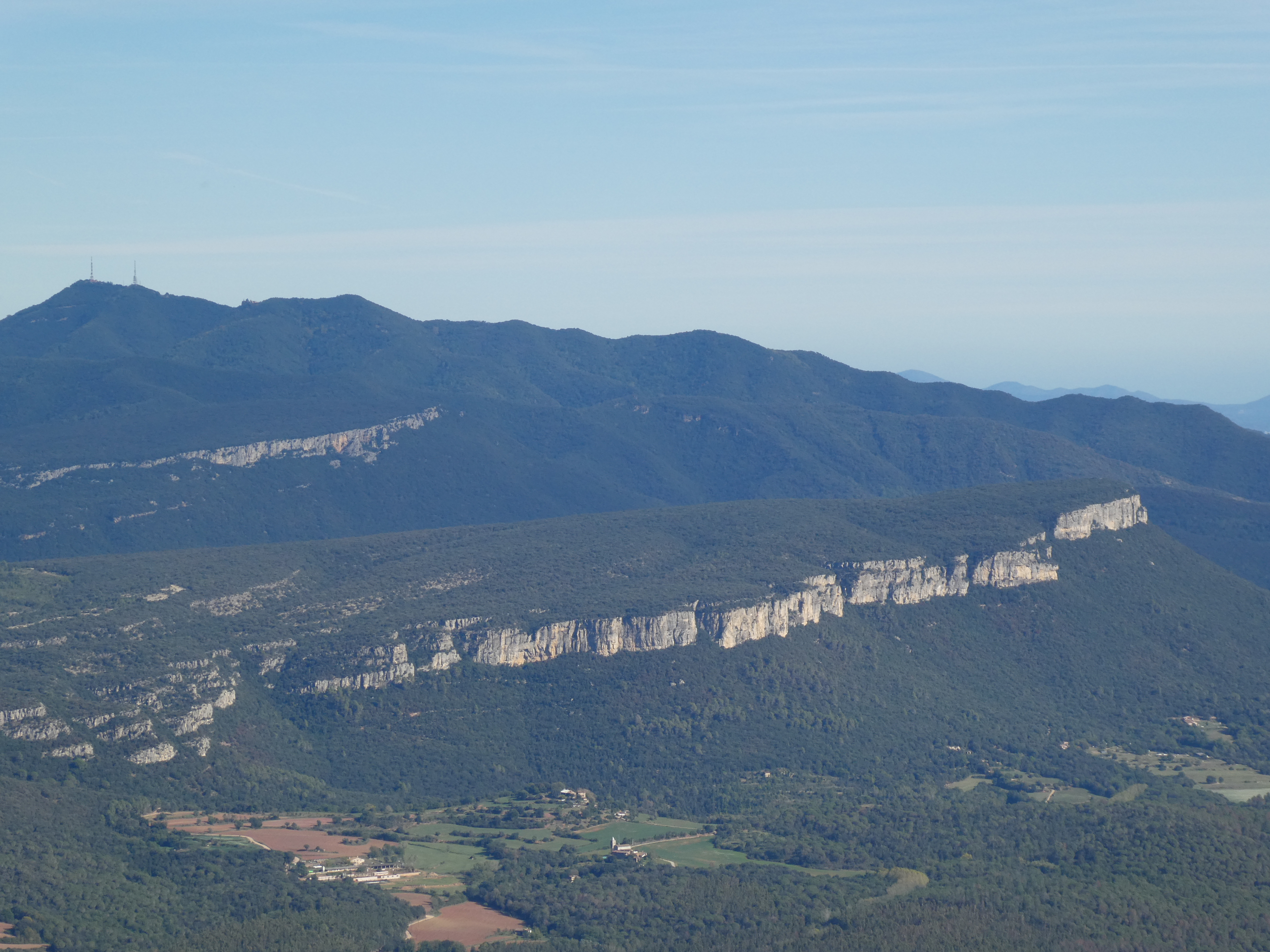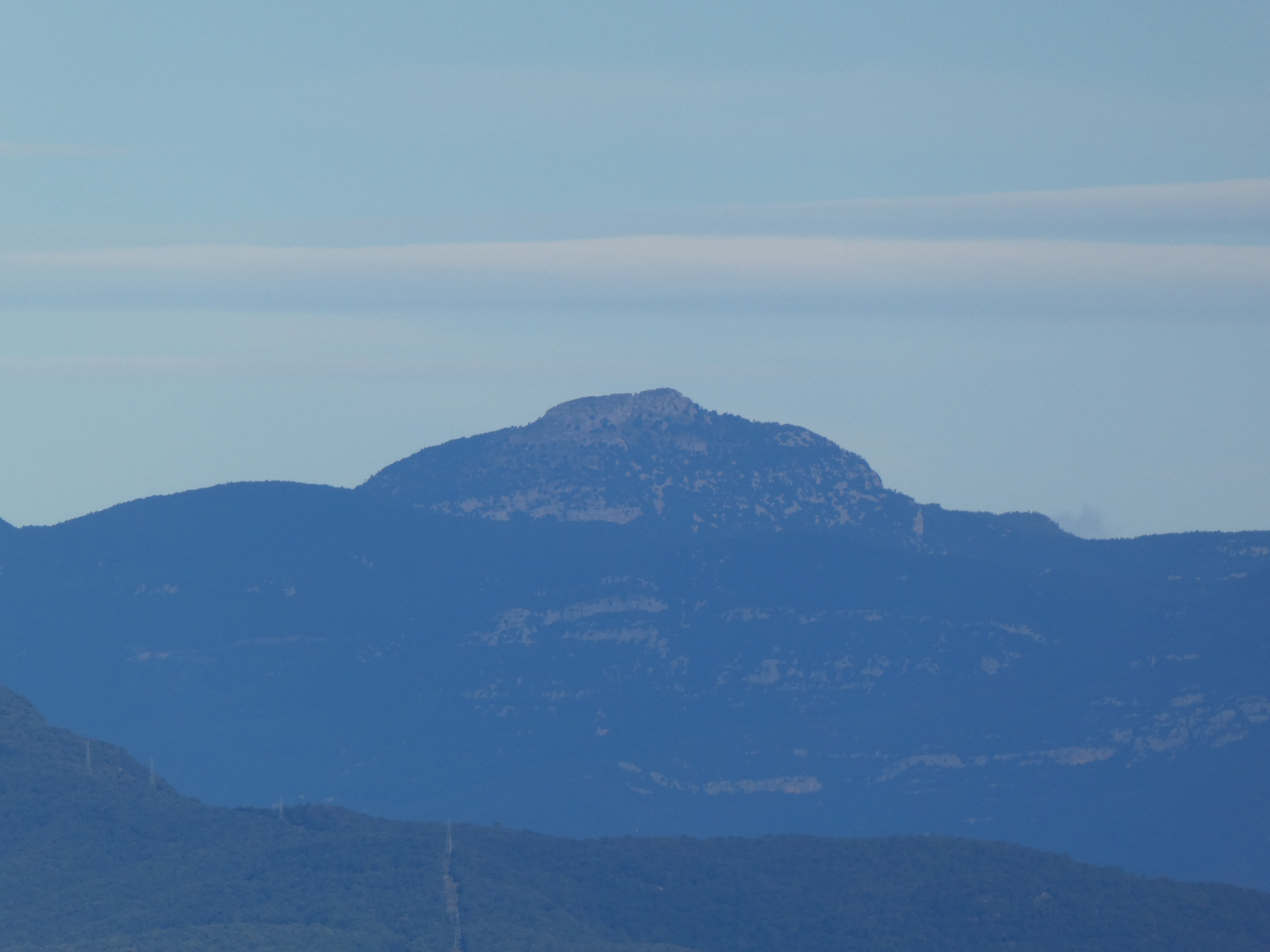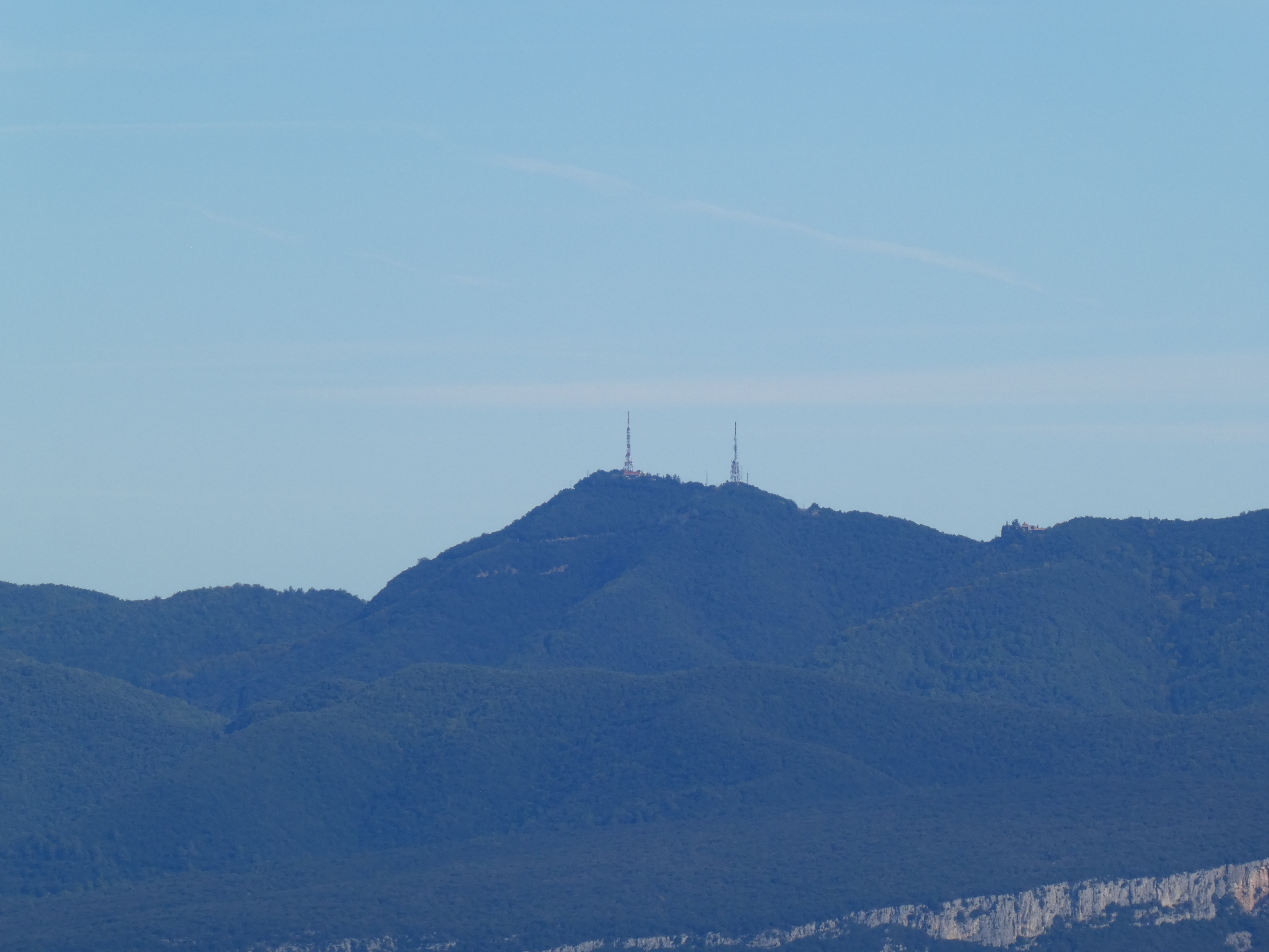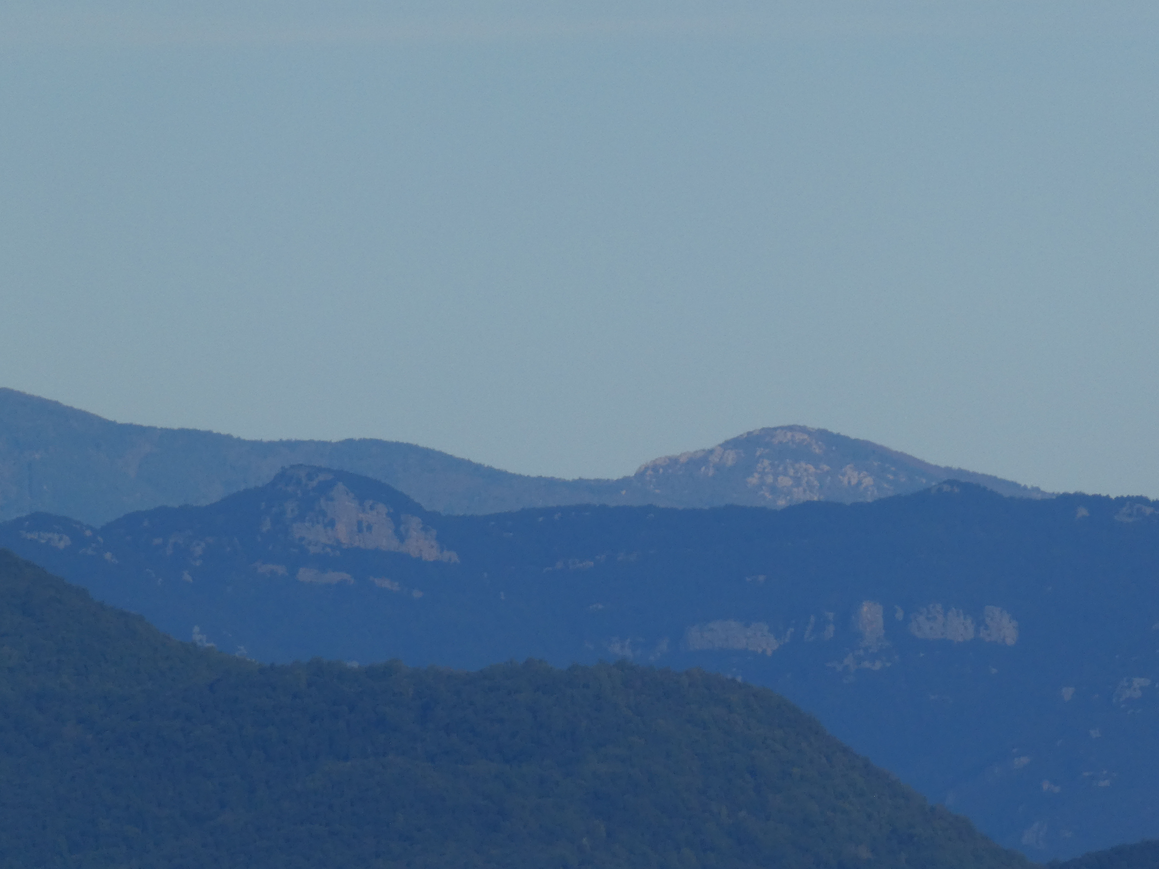 Zoom sur le Turó de Faig Verd (1187 m) au centre et la Muntanya de la Coma (1146 m) à droite