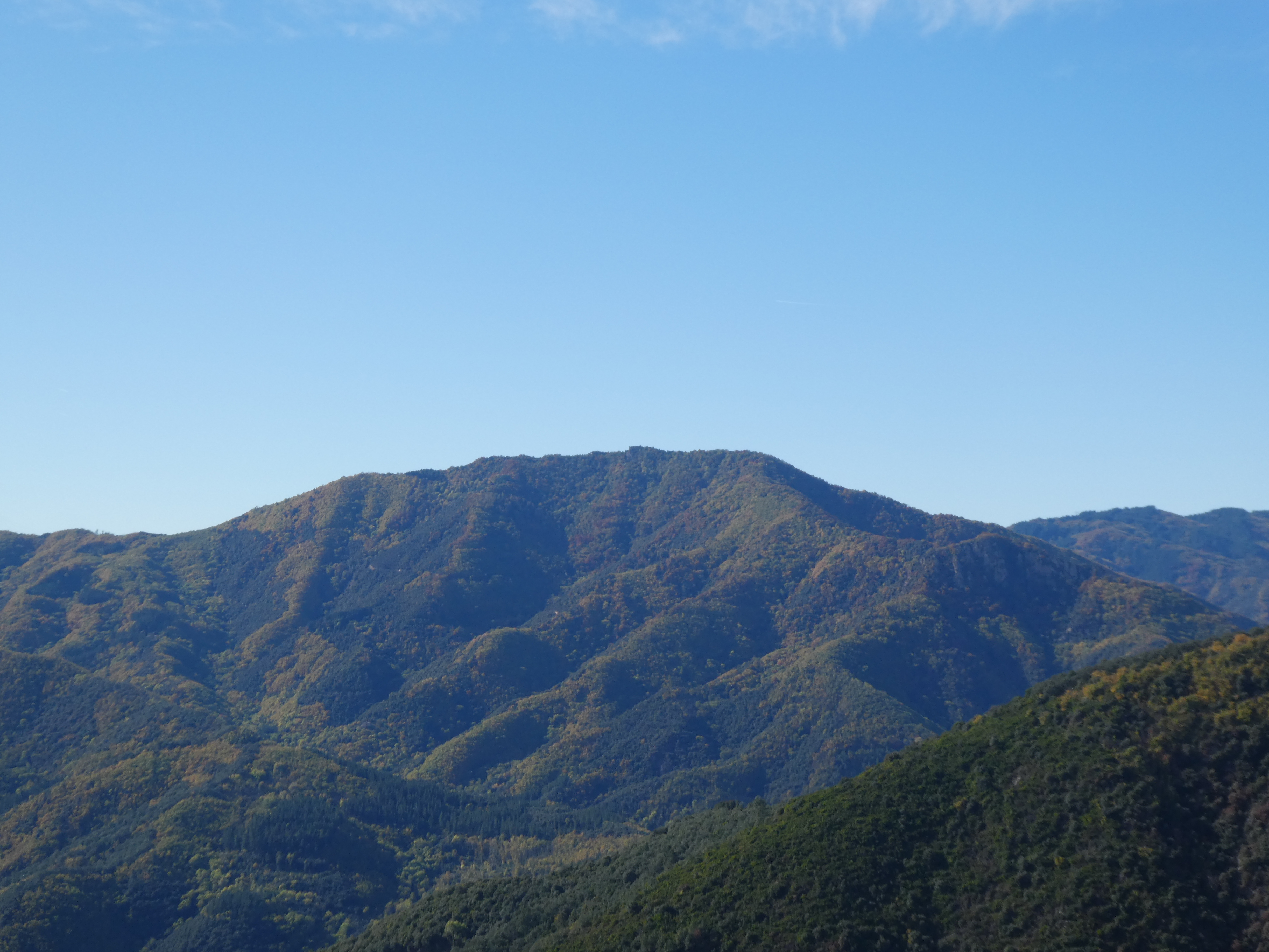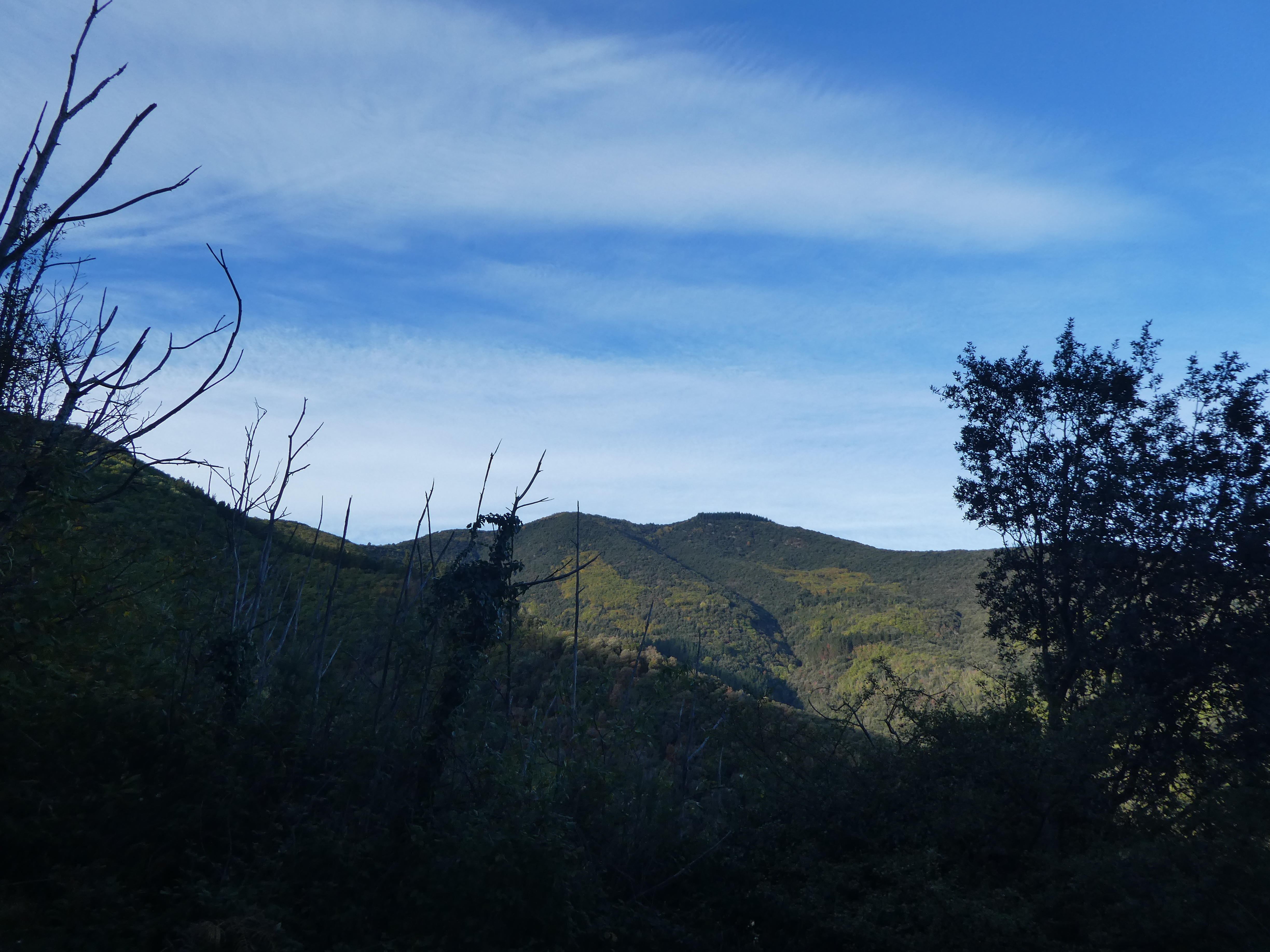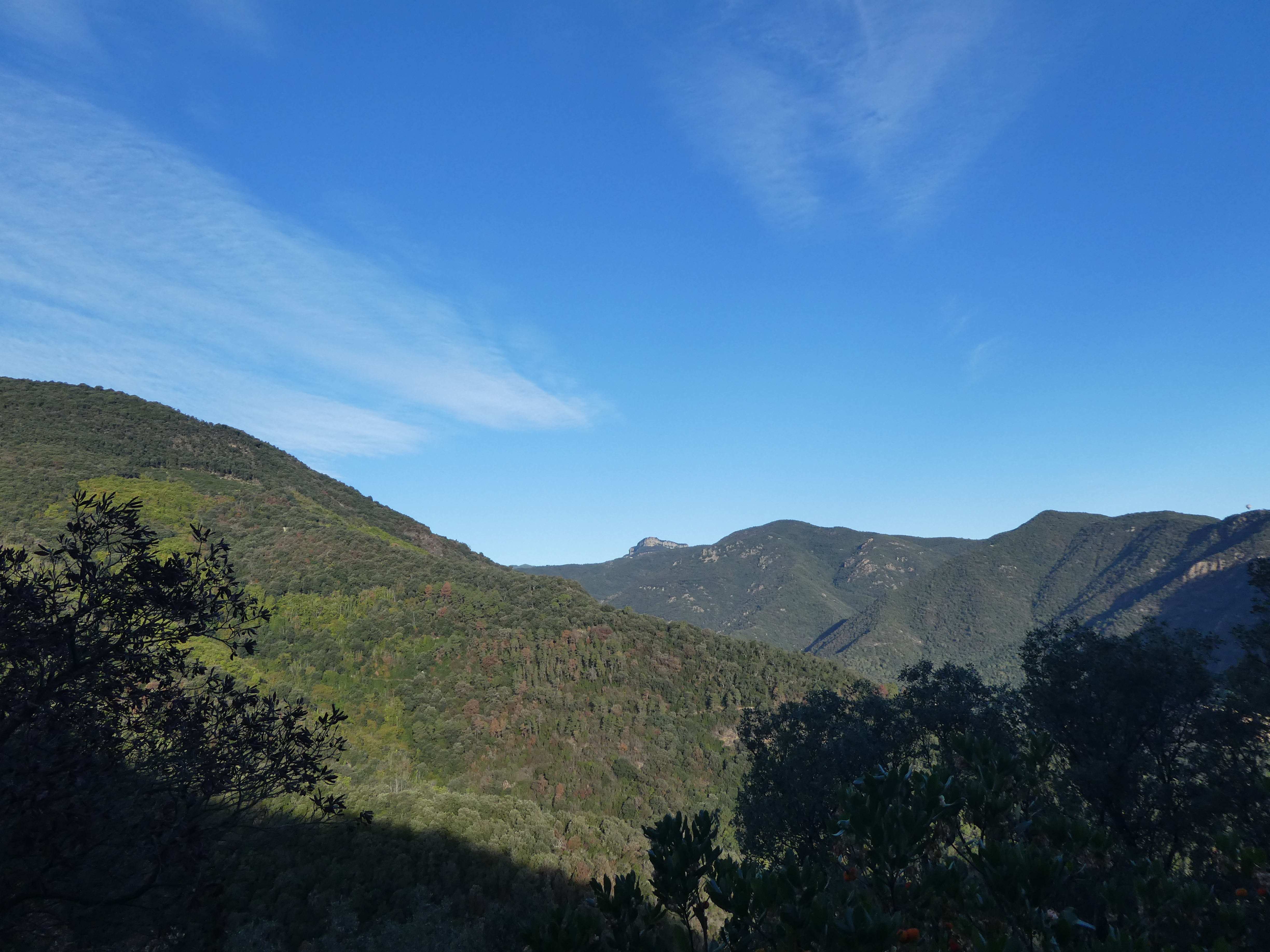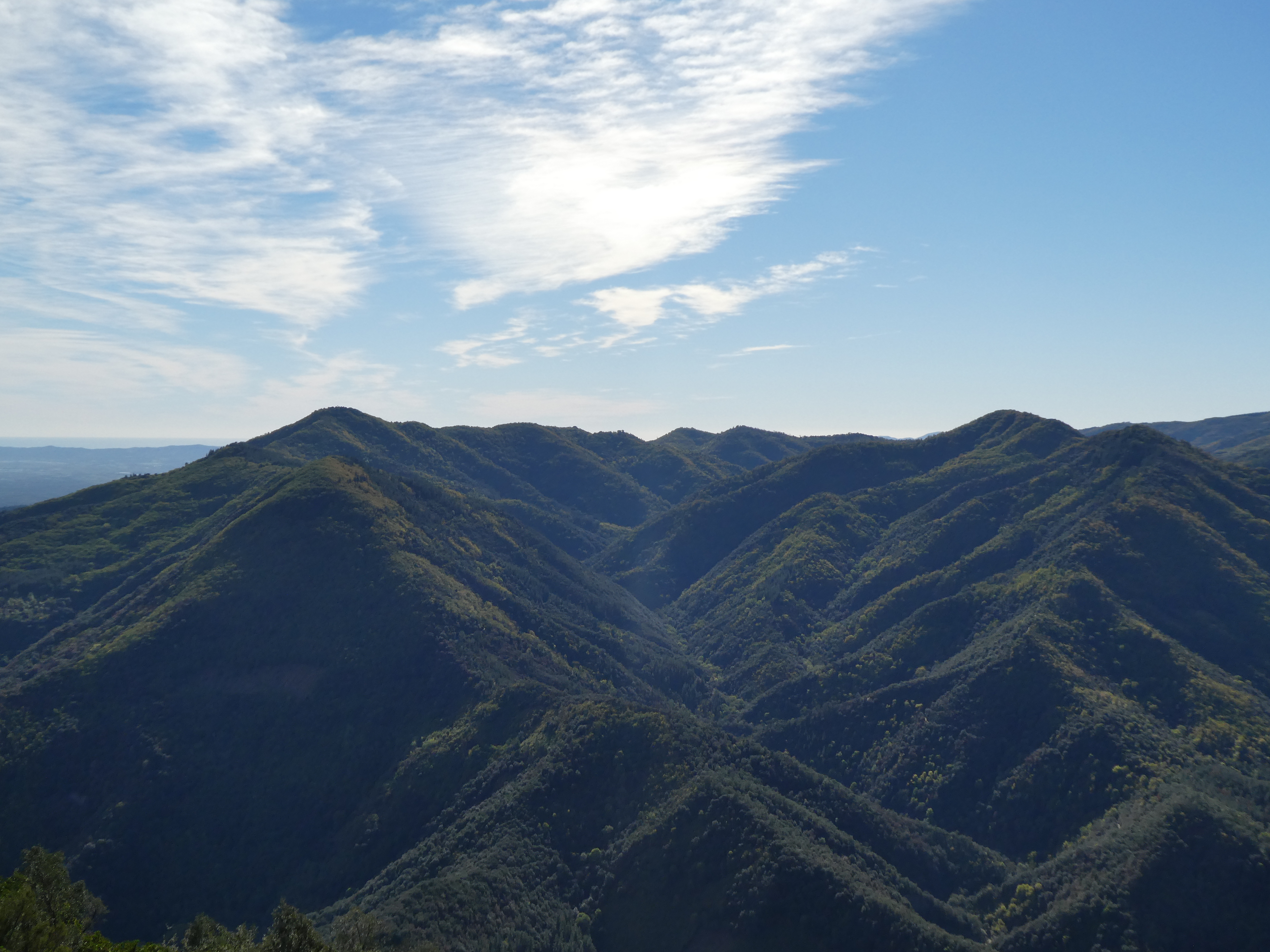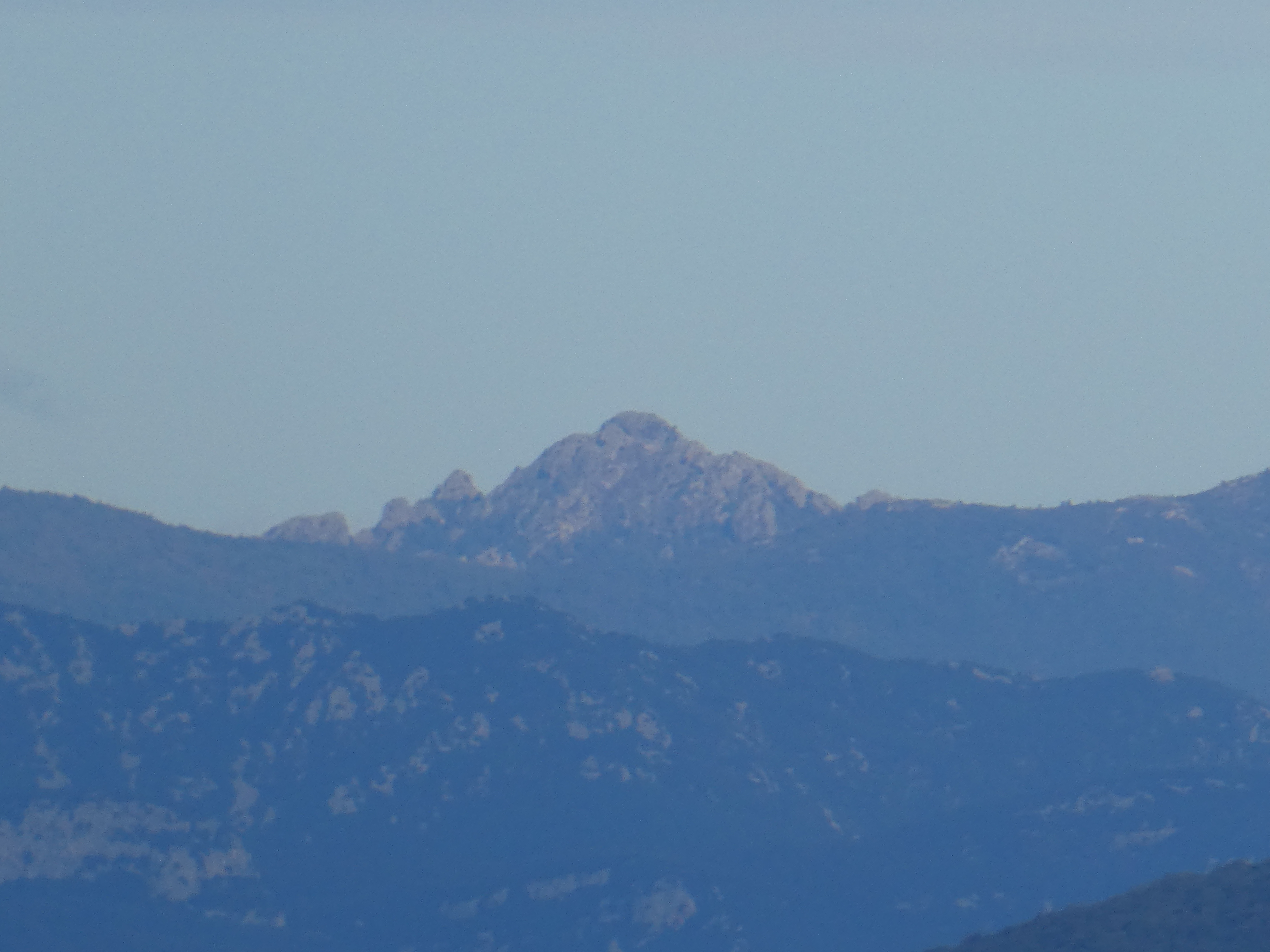Zoom sur le Turó de Faig Verd (1187 m) au centre et la Muntanya de la Coma (1146 m) à droite