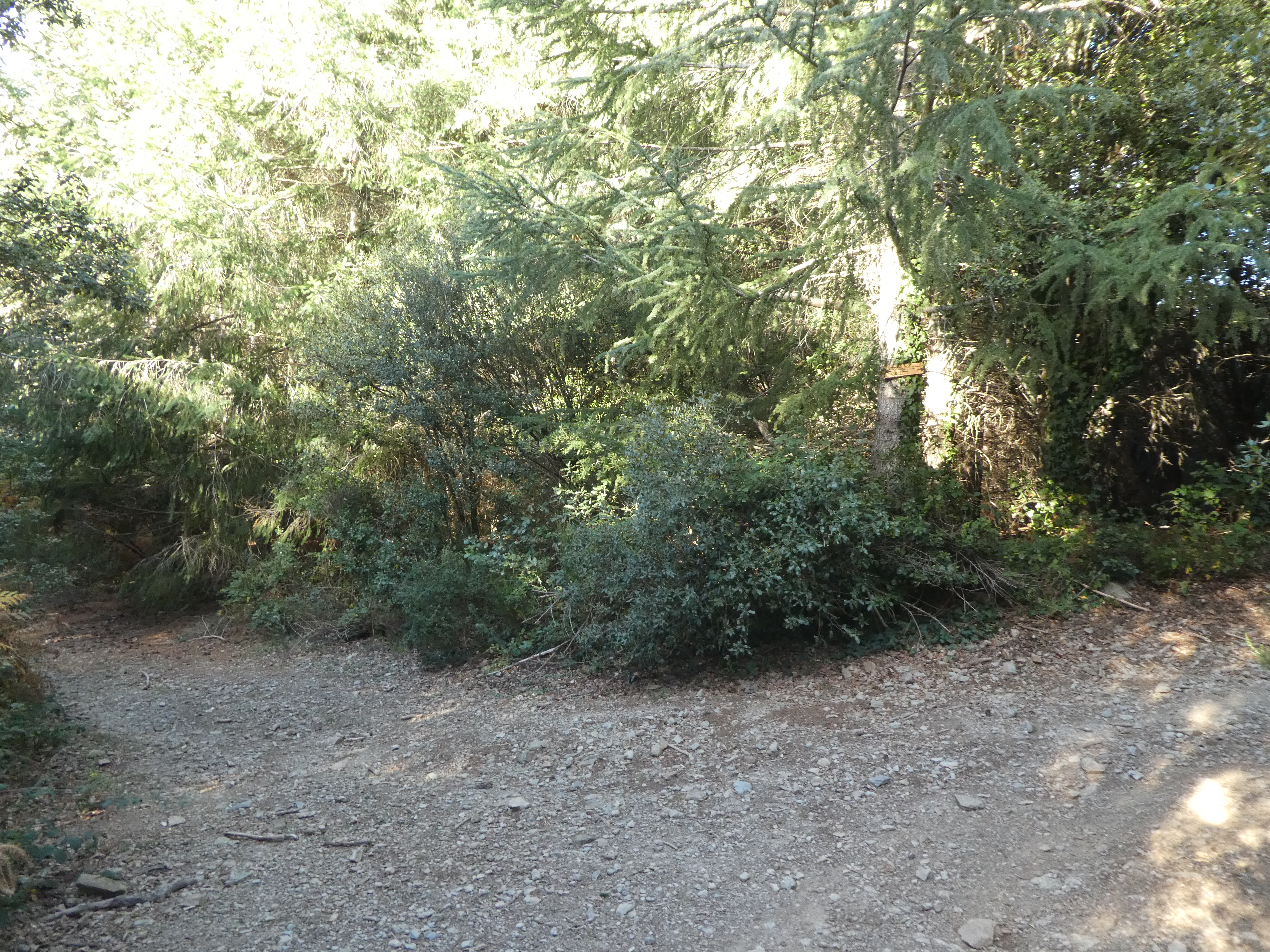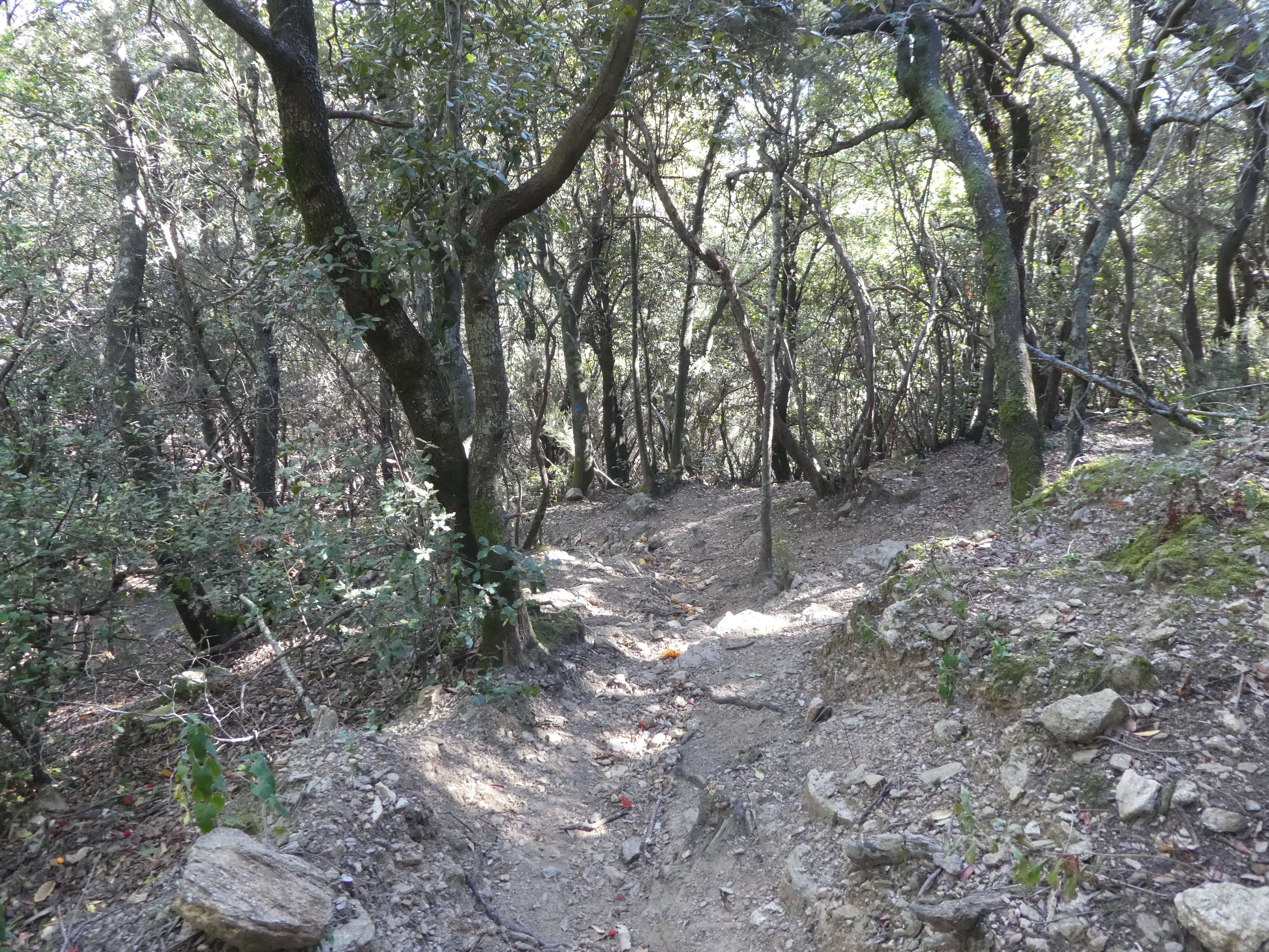 Arrivée au sommet de Sant Gregori (1091 m) : aucun panorama possible à cause de la végétation dense au sommet ! Redescendre du sommet par le même chemin que celui de l'aller direction Serra de Turonell