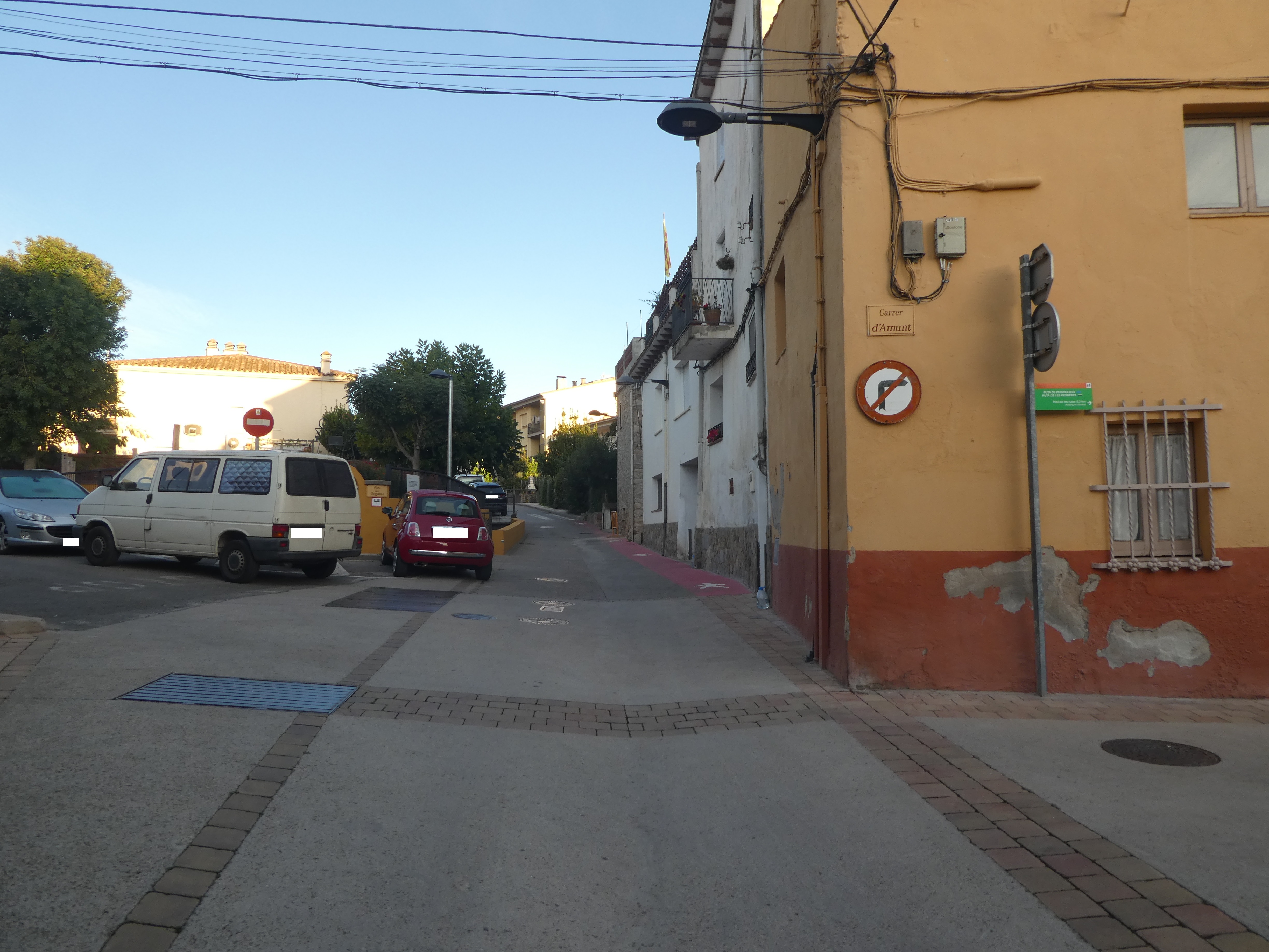 A cette intersection marquée par la présence d'un panneau directionnel (300 mètres après la précédente), suivre la rue partant tout droit direction Cim del Puigdefrou, balisé en vert et blanc, et en bleu dorénavant (la rue arrivant de la gauche sera empruntée au retour)