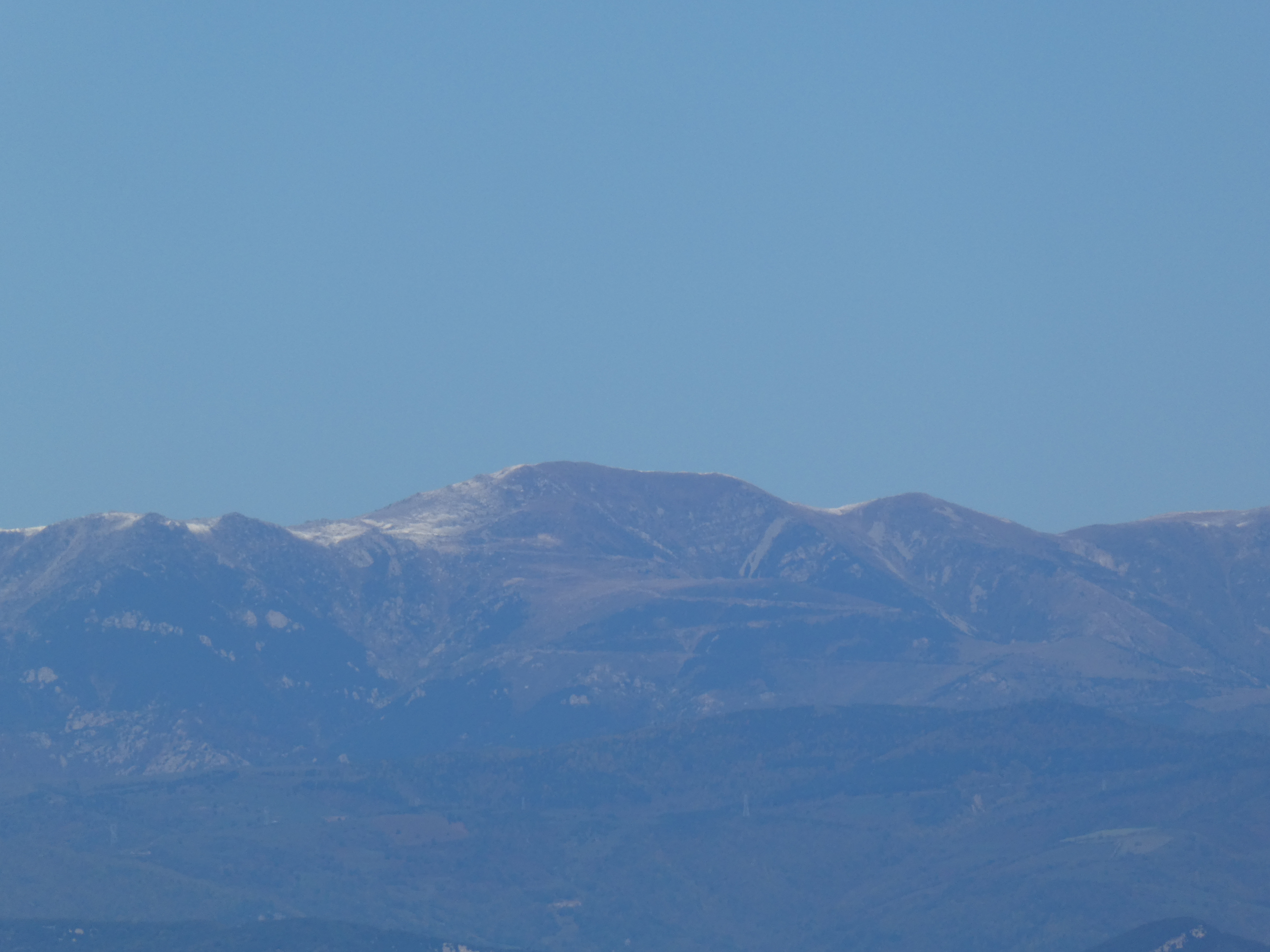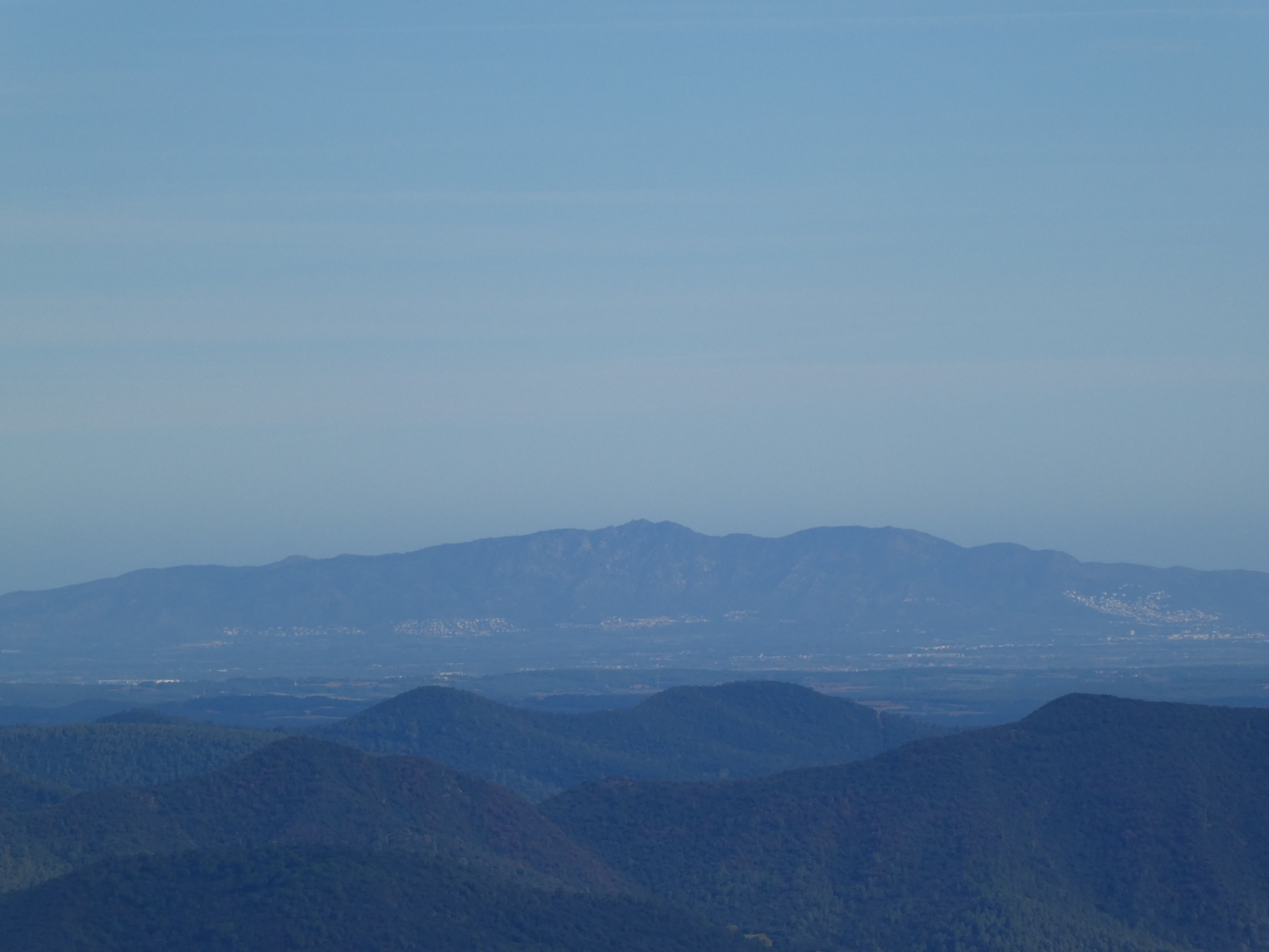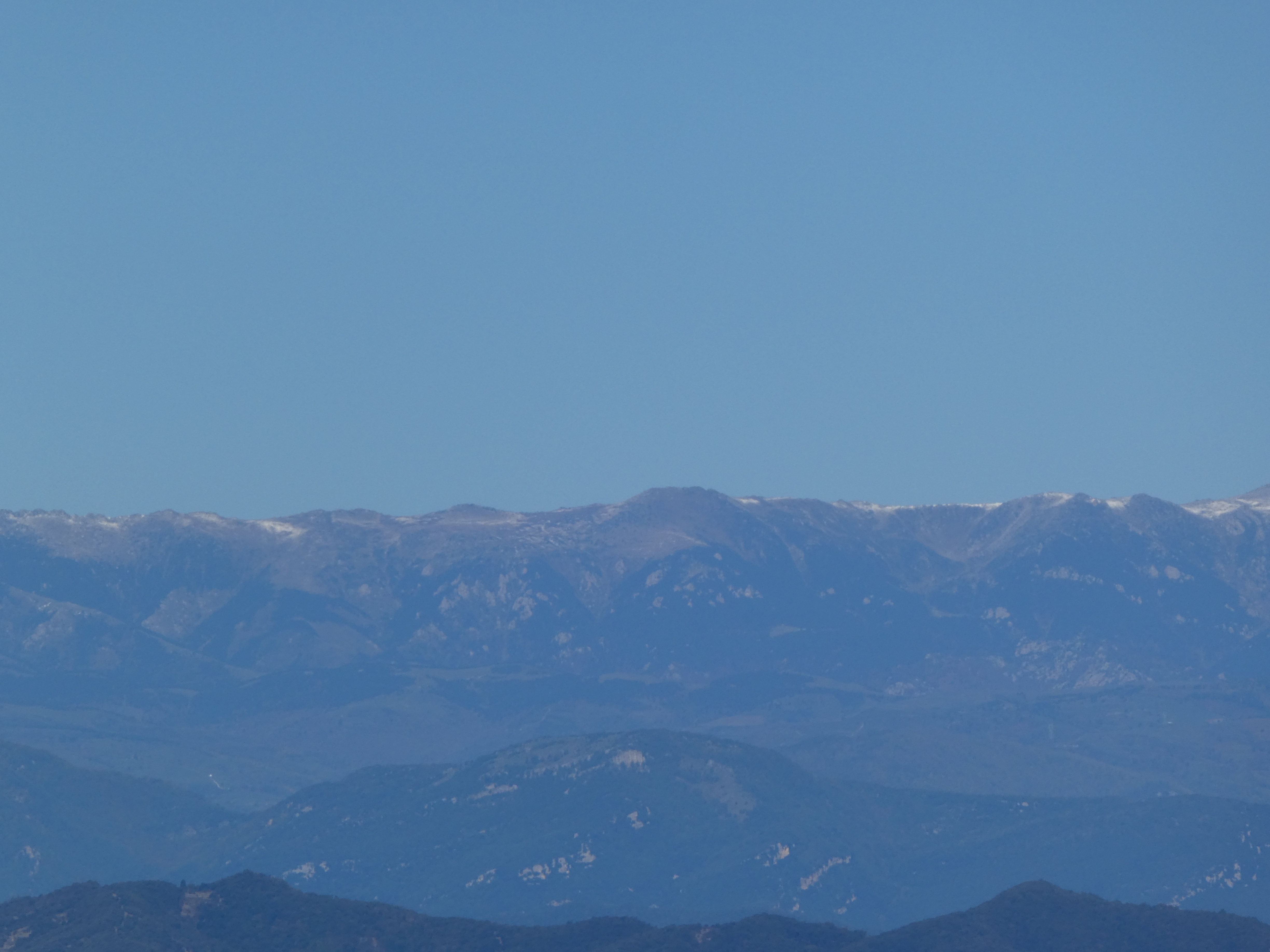 Zoom sur les Albères avec le Puig de Sant Cristau (1015 m) à gauche, le Pic d'Aureille (1031 m) au centre et le Puig Neulós (1256 m) à droite