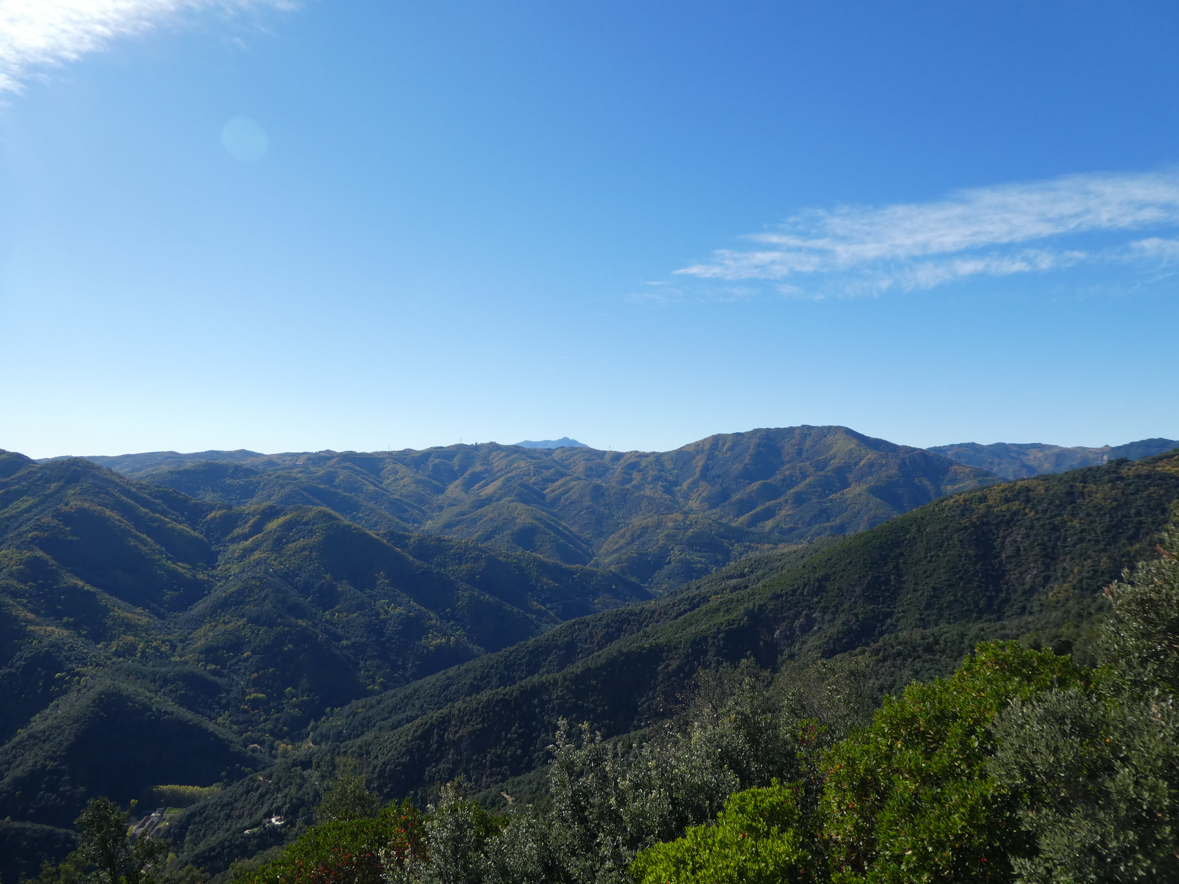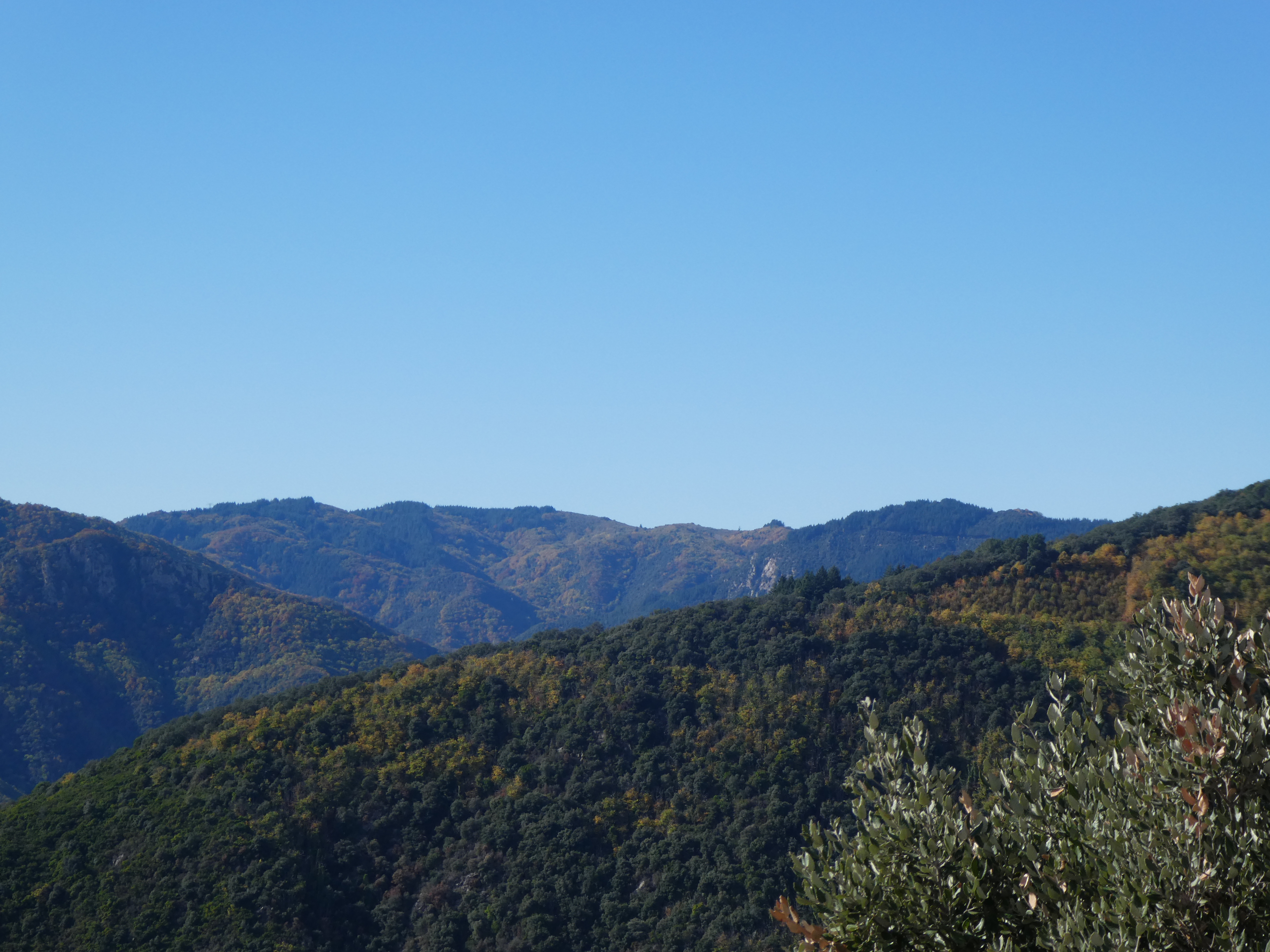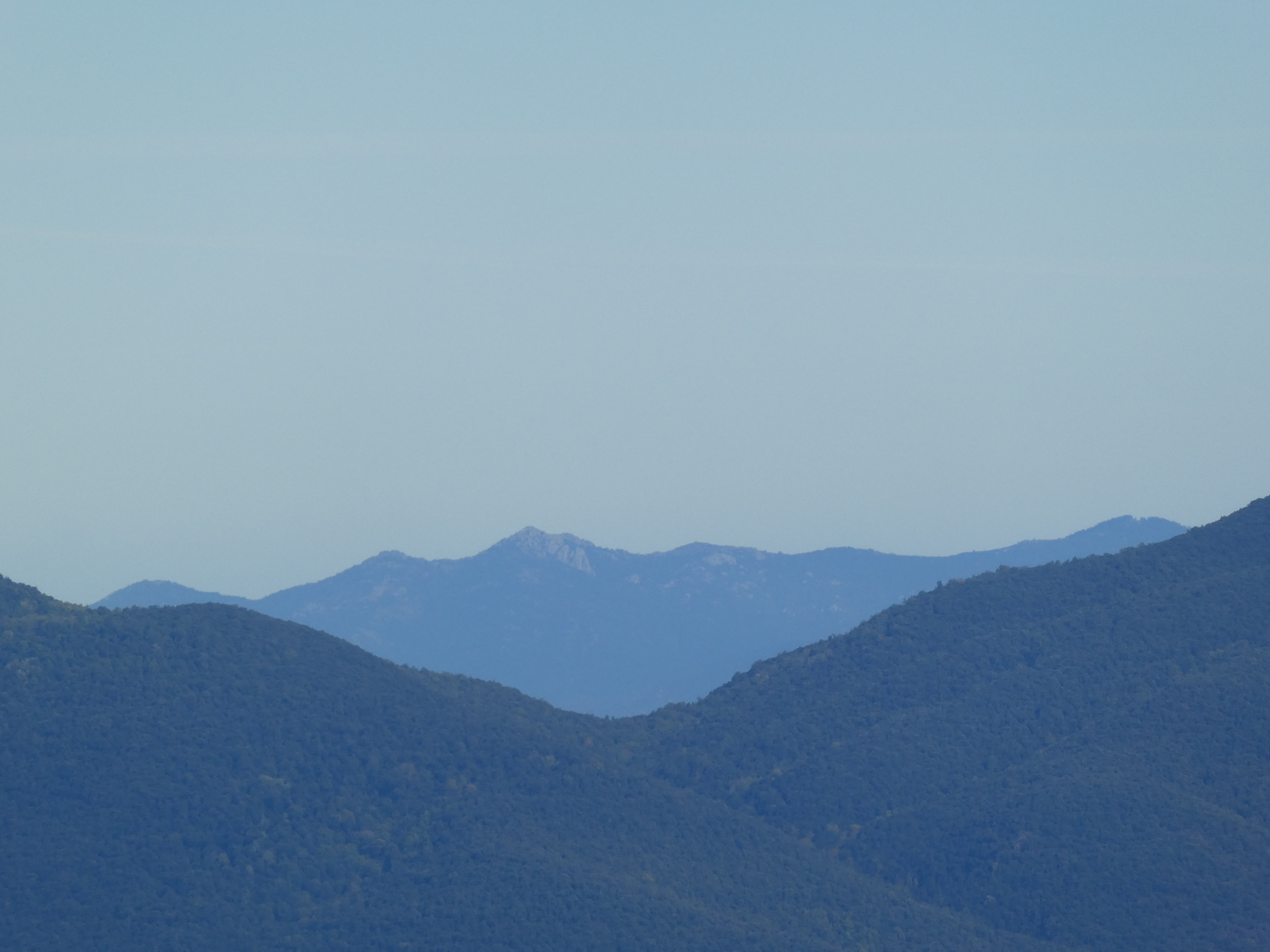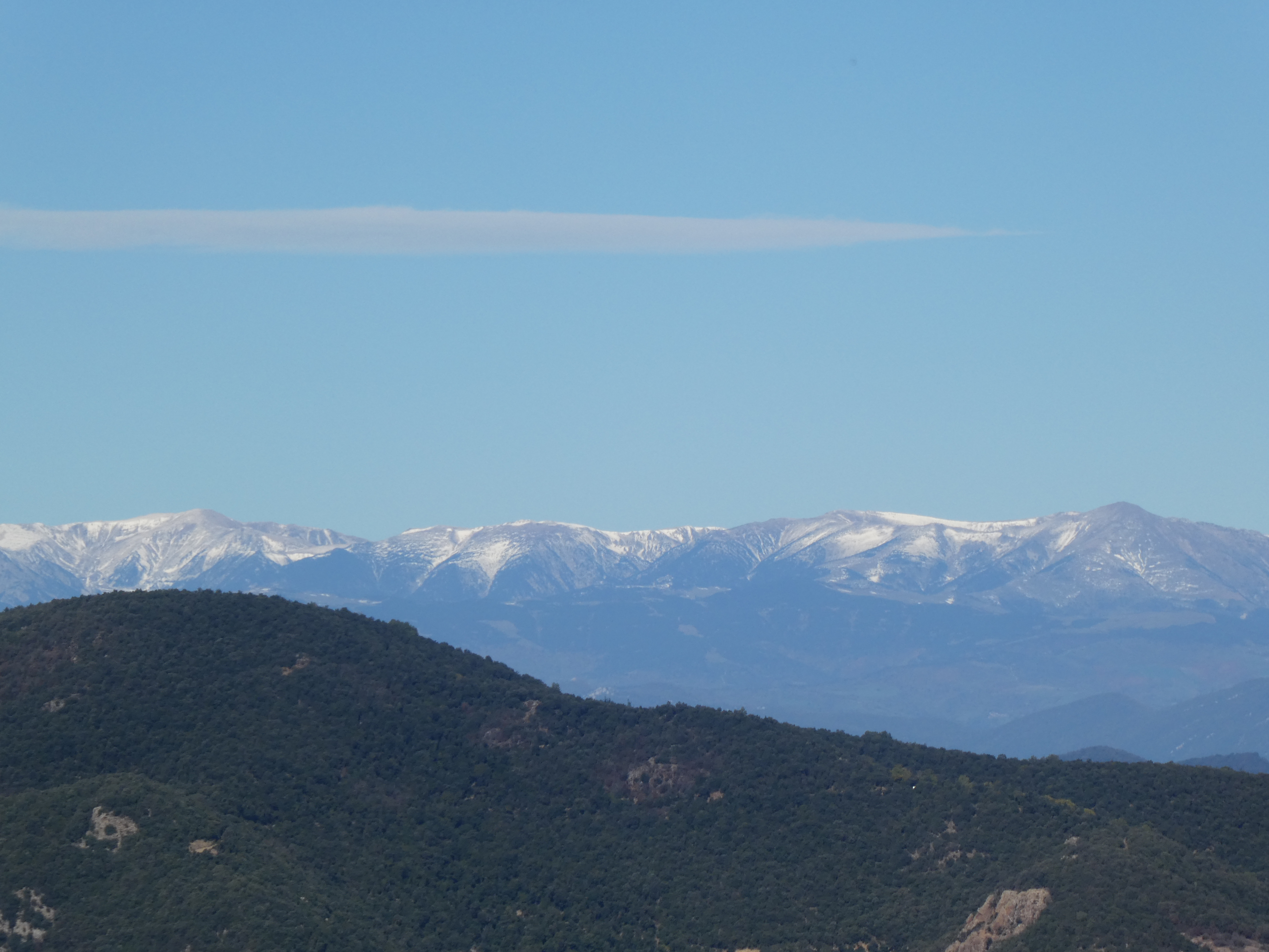 Zoom sur les Albères avec le Puig de Sant Cristau (1015 m) à gauche, le Pic d'Aureille (1031 m) au centre et le Puig Neulós (1256 m) à droite